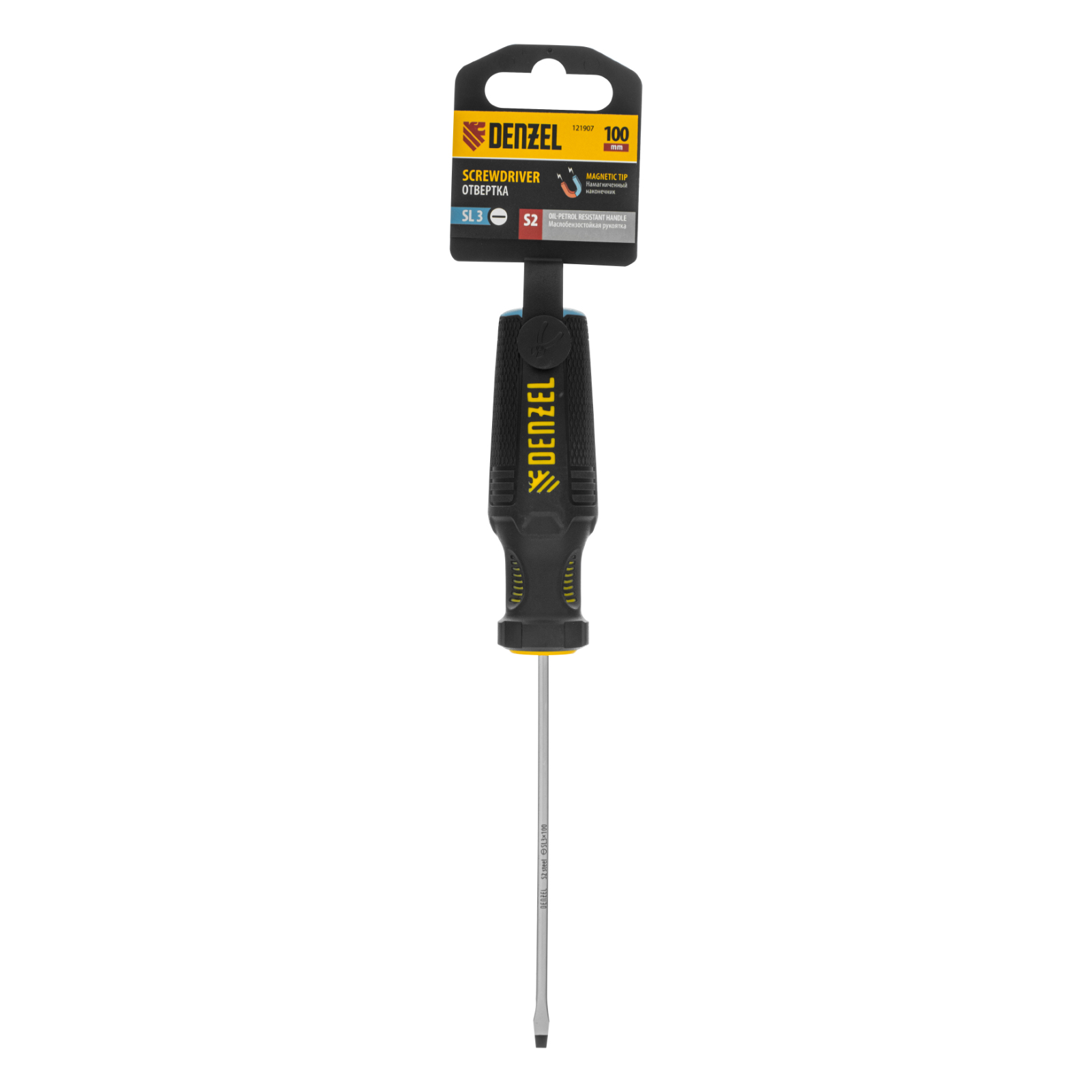 Отвертка Denzel 121907 с трехкомпонентной рукояткой, со стержнем из стали S2, длиной 100 мм, предназначена для монтажа и демонтажа винтов и саморезов с прямым шлицем SL3. Высокоточный намагниченный шлиц крепко фиксируется в головке крепежа. Отвертка выдерживает интенсивное применение, предназначена для выполнения профессиональных ремонтных и монтажных работ.