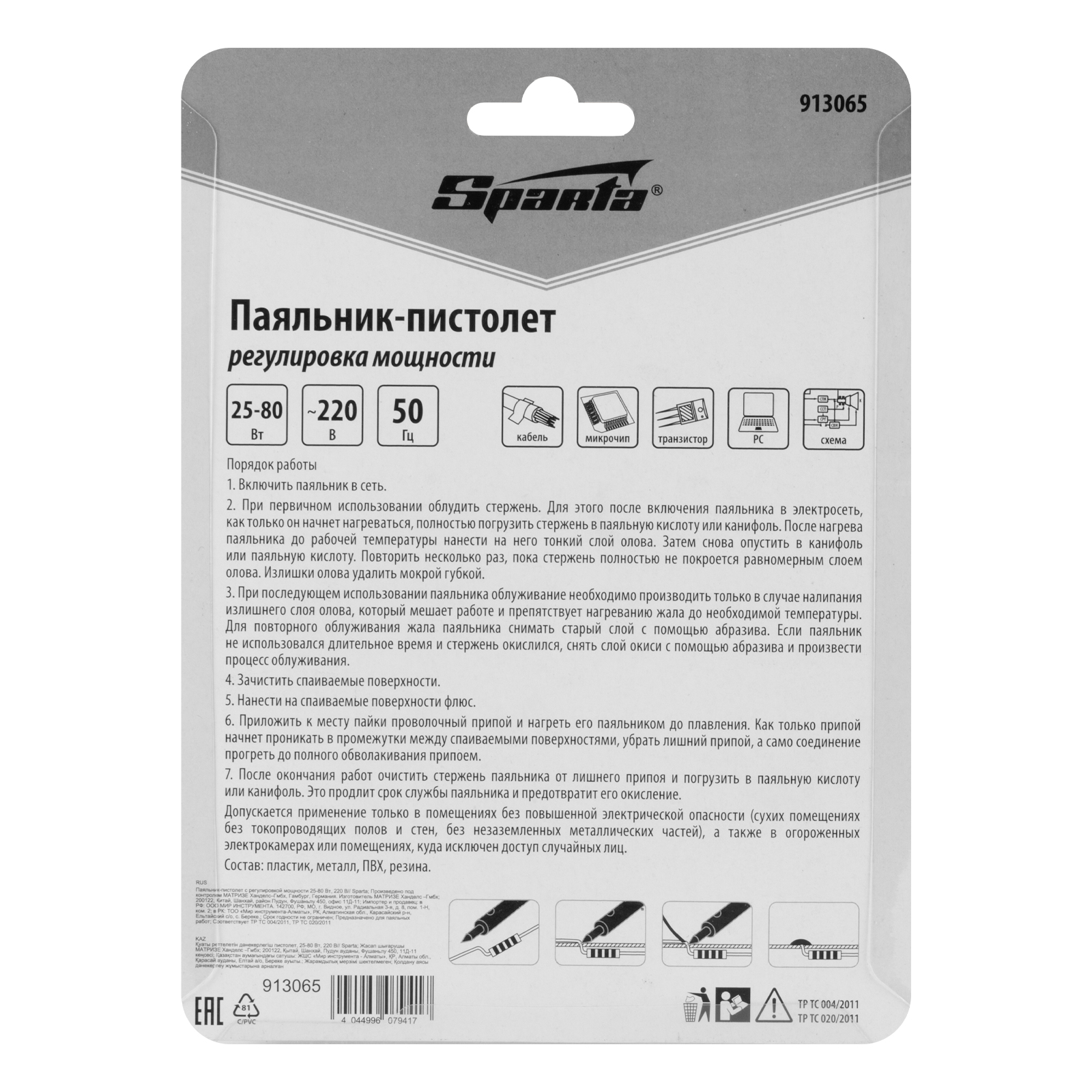 Паяльник-пистолет Sparta 913065 с регулировкой мощности в диапазоне 25-80 Вт питается от сети 220 В и предназначен для пайки микрочипов, транзисторов, электросхем, кабелей. Благодаря керамическому нагревательному элементу подходит для длительной непрерывной работы. Съемное жало может быть заменено в случае необходимости. Температура нагрева регулируется нажатием кнопки на рукоятке. Простой в применении прибор пригодится электромонтерам, радиолюбителям, автоэлектрикам, а также будет полезен в быту.