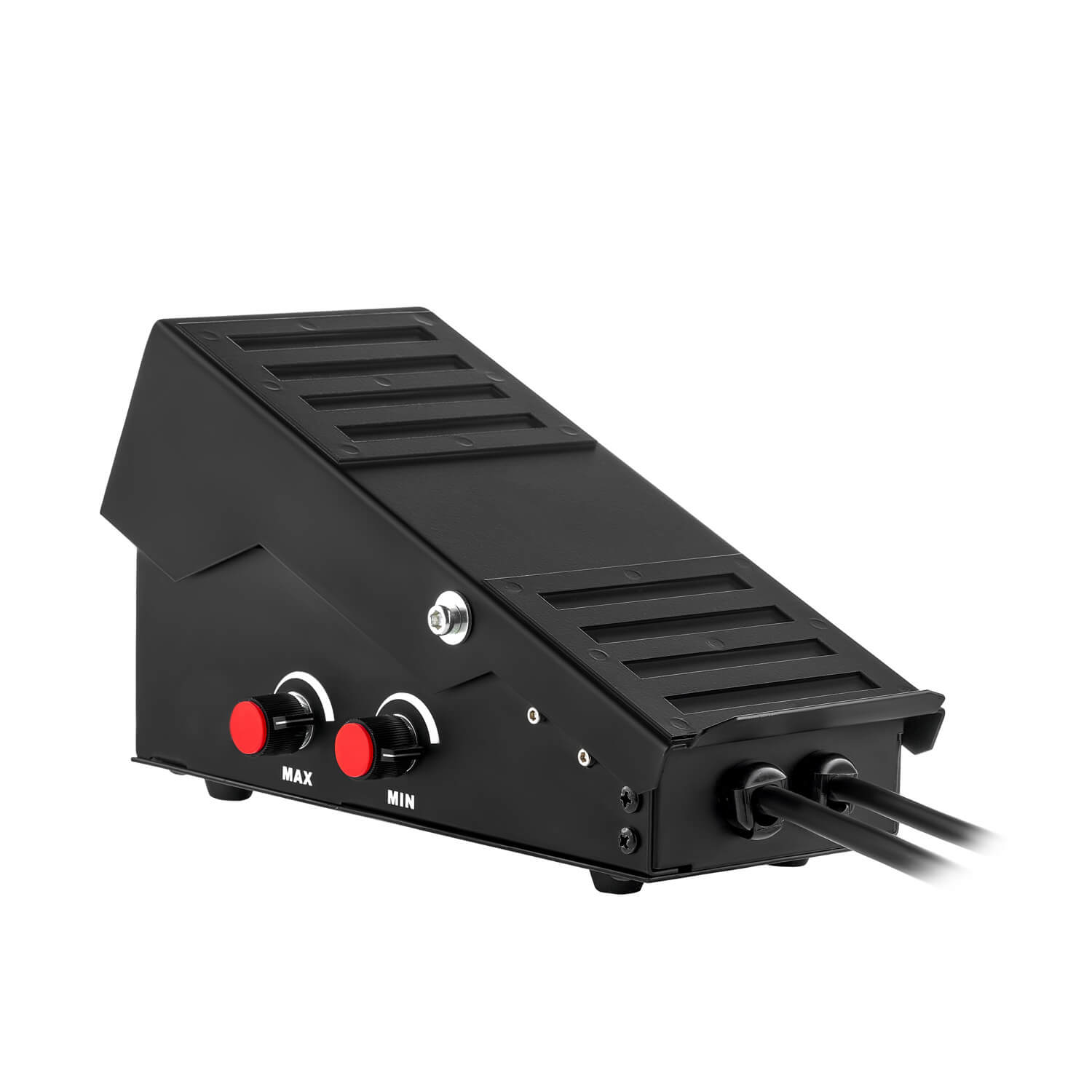Педаль позволяет точно контролировать процесс работы (увеличивать или уменьшать ток не прибегая к органам управления аппарата) и позволяет добиться качественного завершения шва (заварка кратера). С помощью поворотных регуляторов на боковой грани педали (MIN/MAX) сварщик может задать значения базового тока и тока заварки кратера в пропорции от пикового или основного сварочного тока, выставленного на аппарате. Если на аппарате установлен ток в 100 А, а регулятор максимального тока педали (MAX) выставлен в положение ½ - ток сварки не превысит 50 А. Регулятор (MIN) задает значение тока заварки кратера. Ручка настраивает значение до которого упадет ток в случае, если сварщик снимет ногу с педали. Так при токе в 100 А выставленных на аппарате и повороте регулятора (MIN) в положение ¼ - ток заварки кратера составит 25 А.
