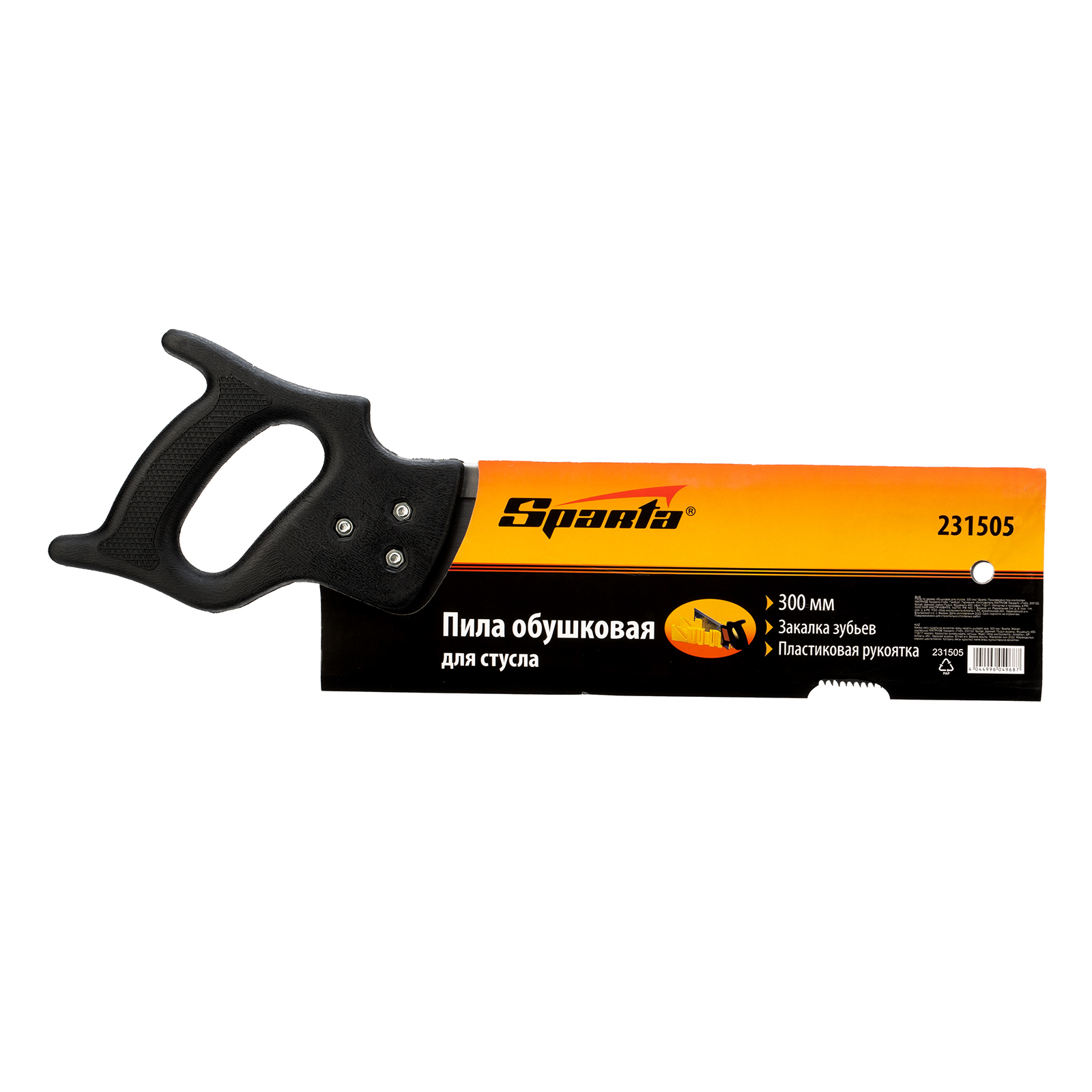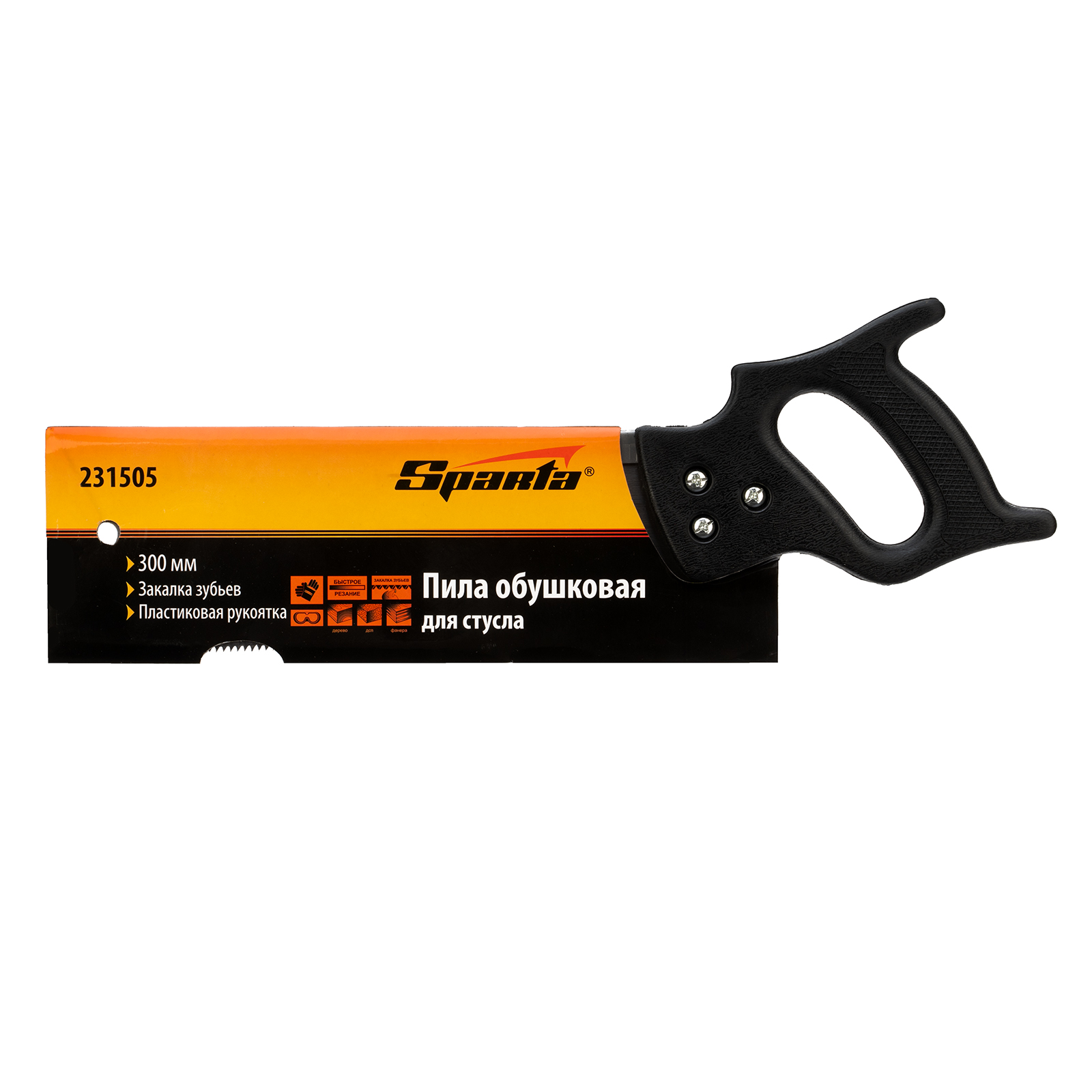 Обушковая пила для стусла Sparta 231505 с полотном длиной 300 мм используется для распиливания под углом заготовок из древесины, фанеры или ДСП. Пилить можно вдоль или поперек волокон. В верхней части полотна имеется ребро жесткости, которое не дает ему сгибаться. Шаг зубьев составляет 7-8 TPI, что обеспечивает быстрый рез. Допускается переточка режущей кромки. Инструмент применяется во время выполнения столярных работ.