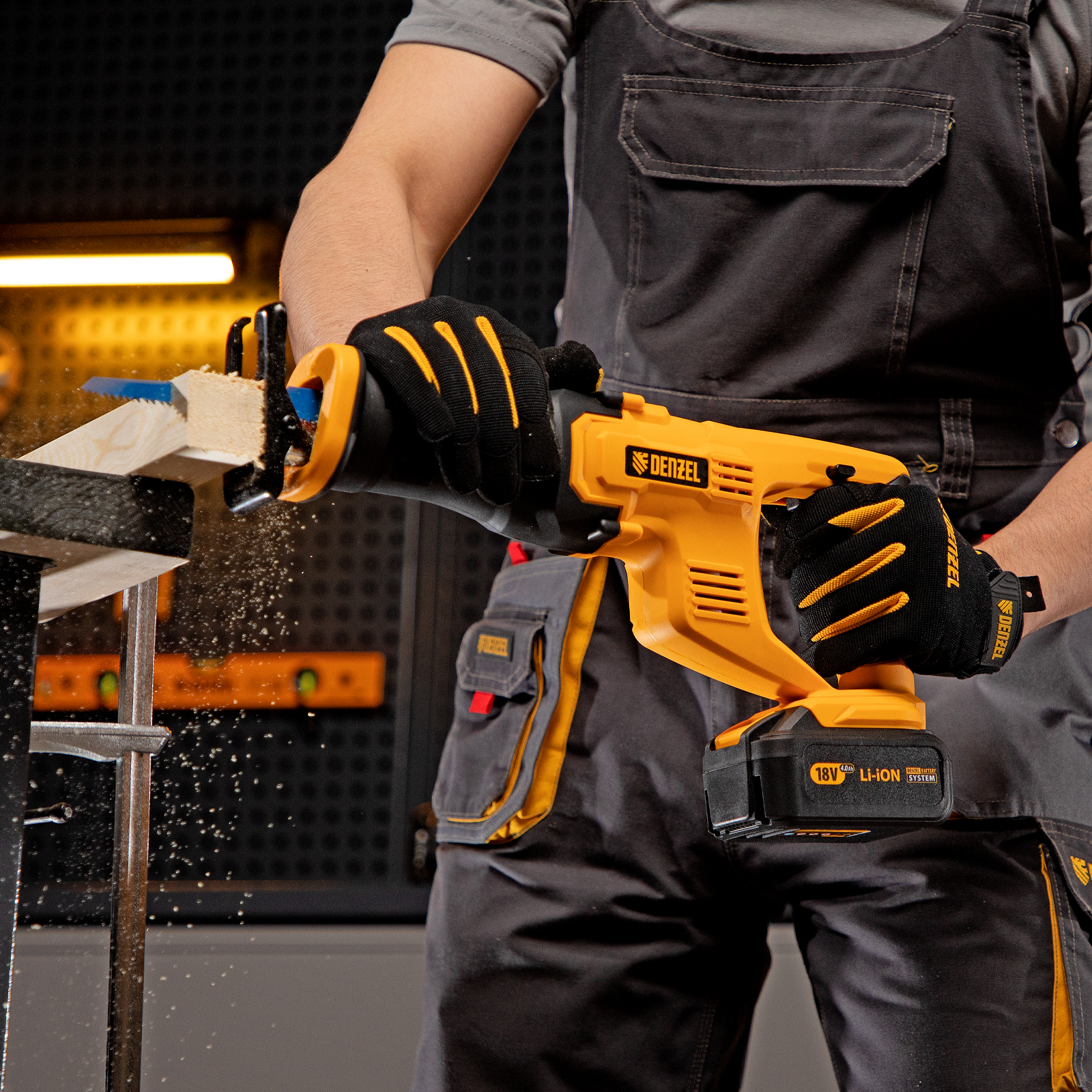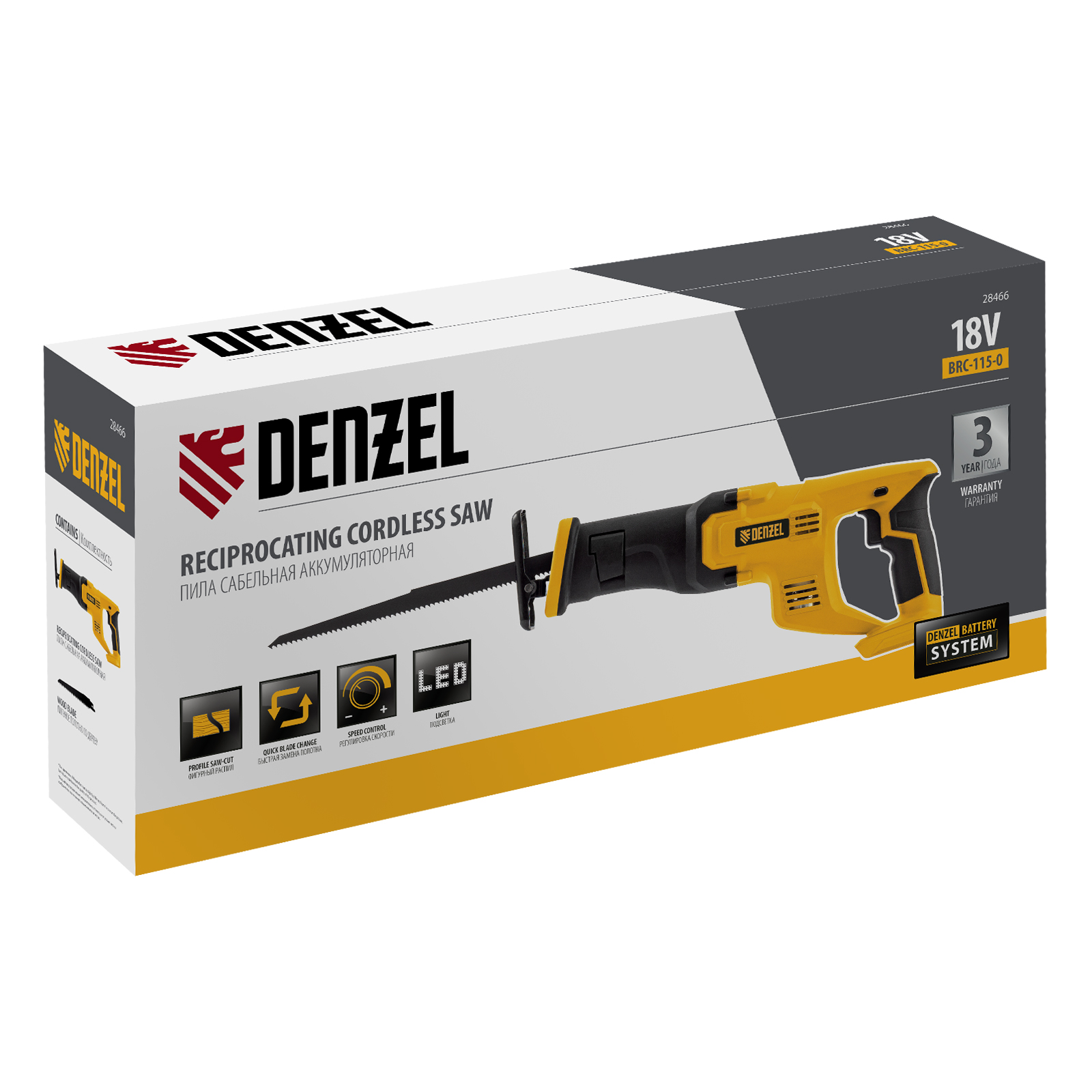 Сабельная аккумуляторная пила Denzel CRC-115-0 28466 работает от аккумулятора Li-Ion с рабочим напряжением 18 В. Предназначена для распила фанеры, досок, ДСП, ДВП, пластика, а также для обрезки веток. Максимальная глубина пропила в древесине составляет 115 мм, в стали — 10 мм. Оснастка совершает до 3000 ходов в минуту, что обеспечивает эффективную работу. ,Пила поставляется без аккумулятора и зарядного устройства, к ней подходит универсальный аккумулятор емкостью 4 А/ч, совместимый с любым инструментом единой платформы Denzel battery system 18V серии IB.