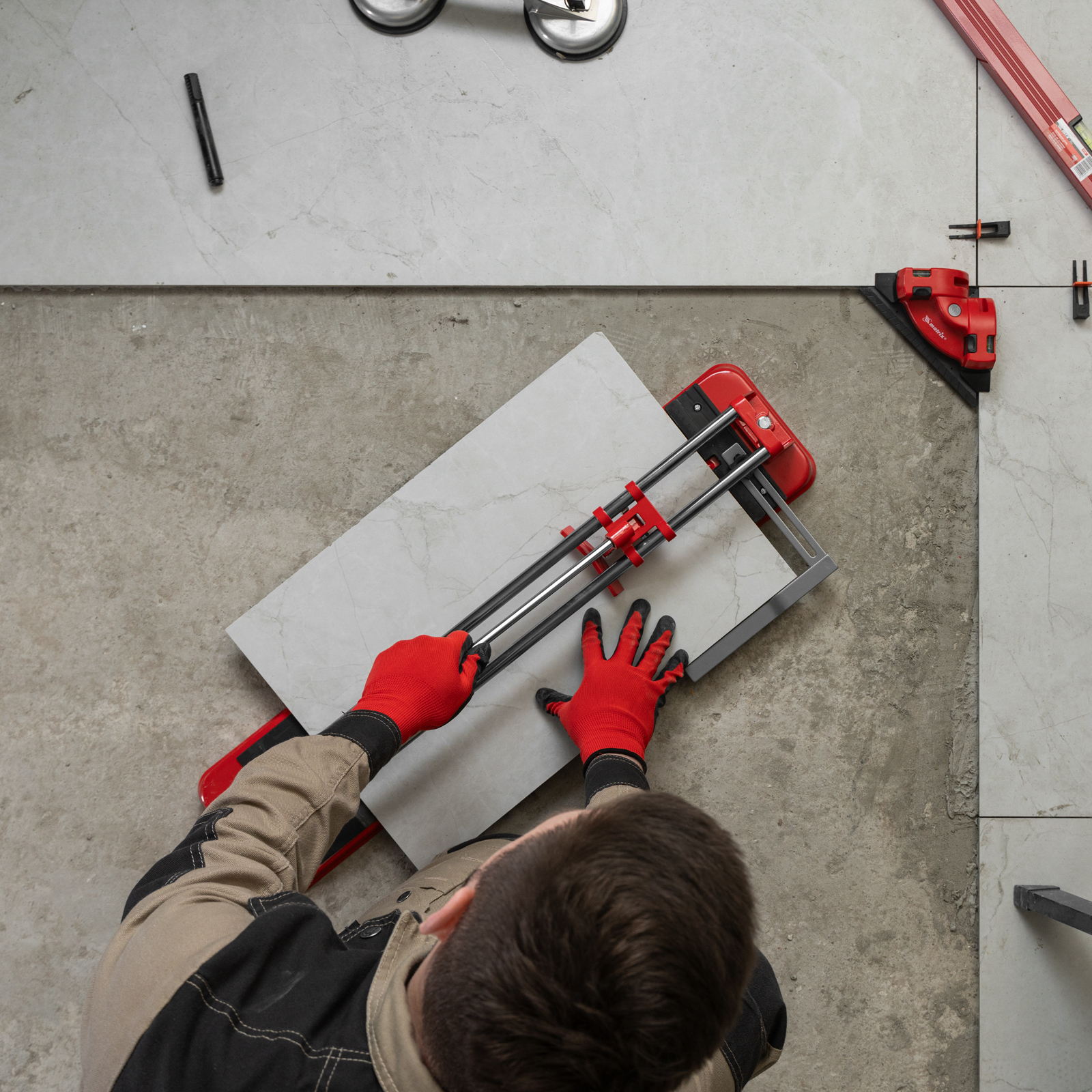 - Высокое качество работы — стальное основание обеспечивает устойчивость плиткореза, мягкие амортизирующие накладки предотвращают смещение плитки.