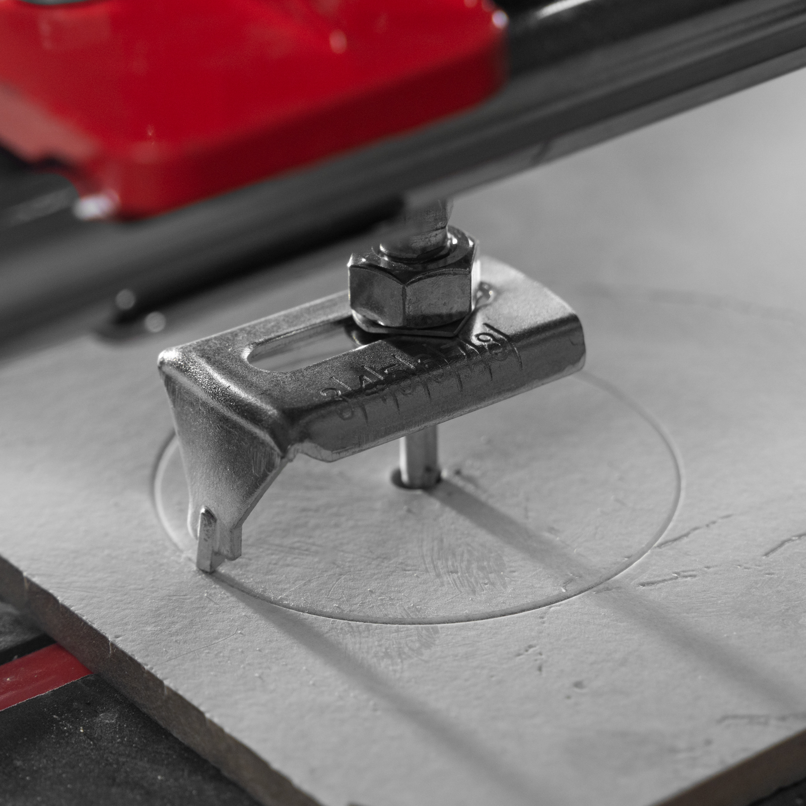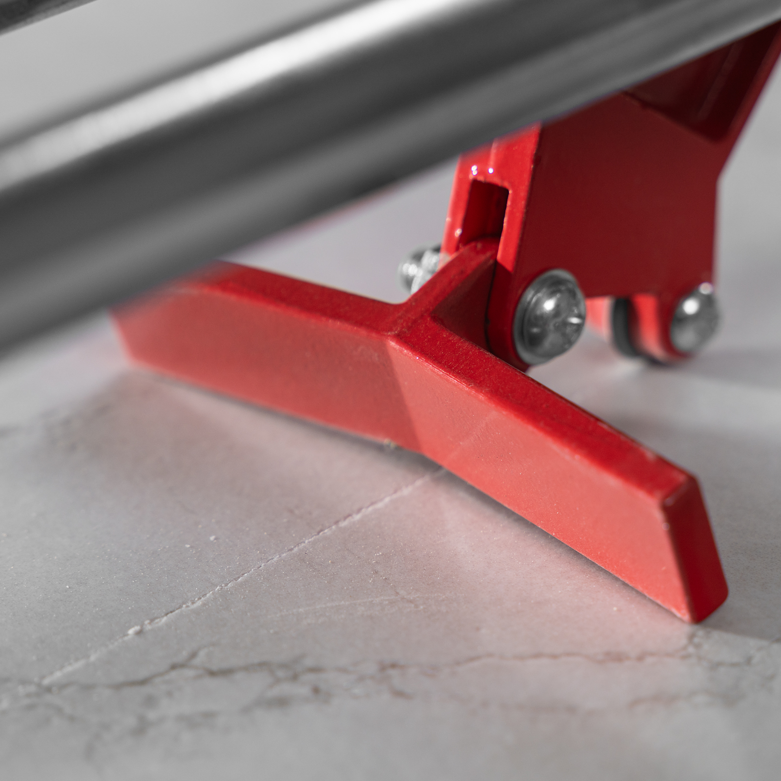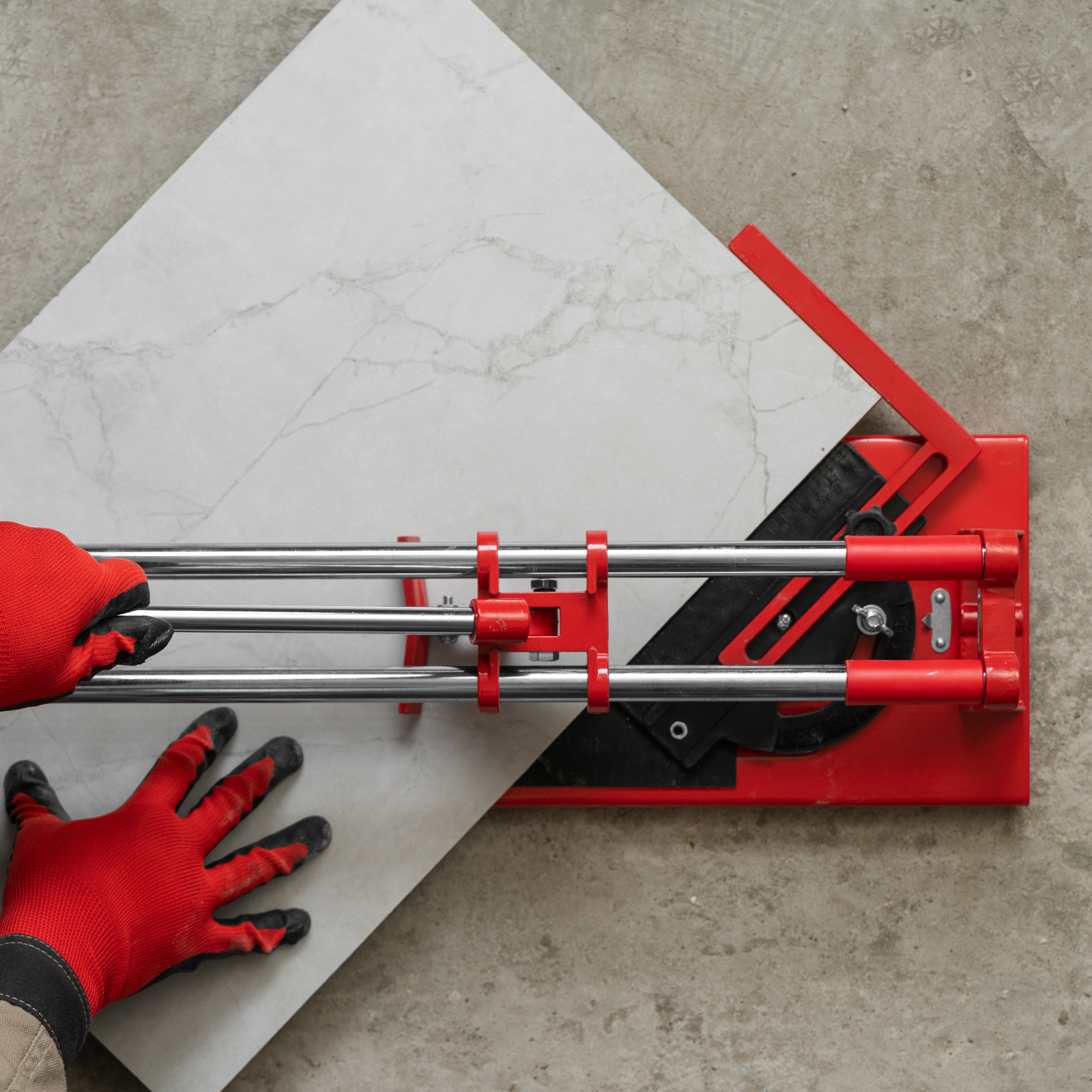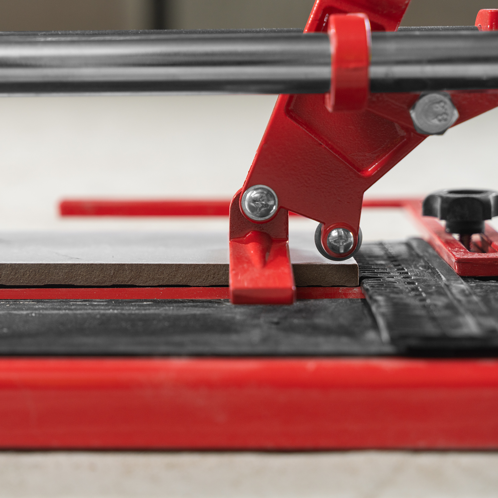 - Неподвижность плитки — плиткорез с широким основанием снабжен мягкими амортизирующими накладками, угольник-угломер дополнительно фиксирует заготовку.