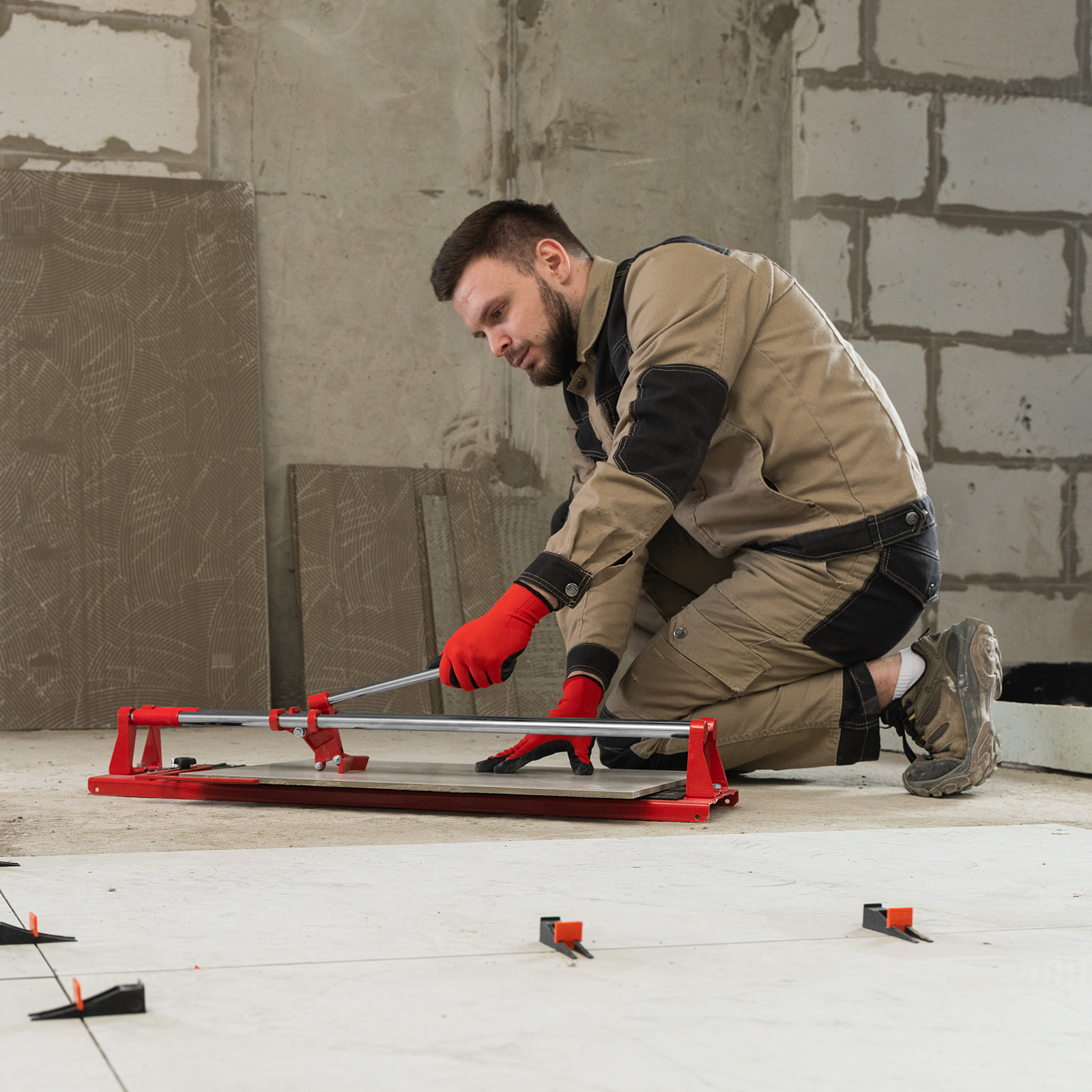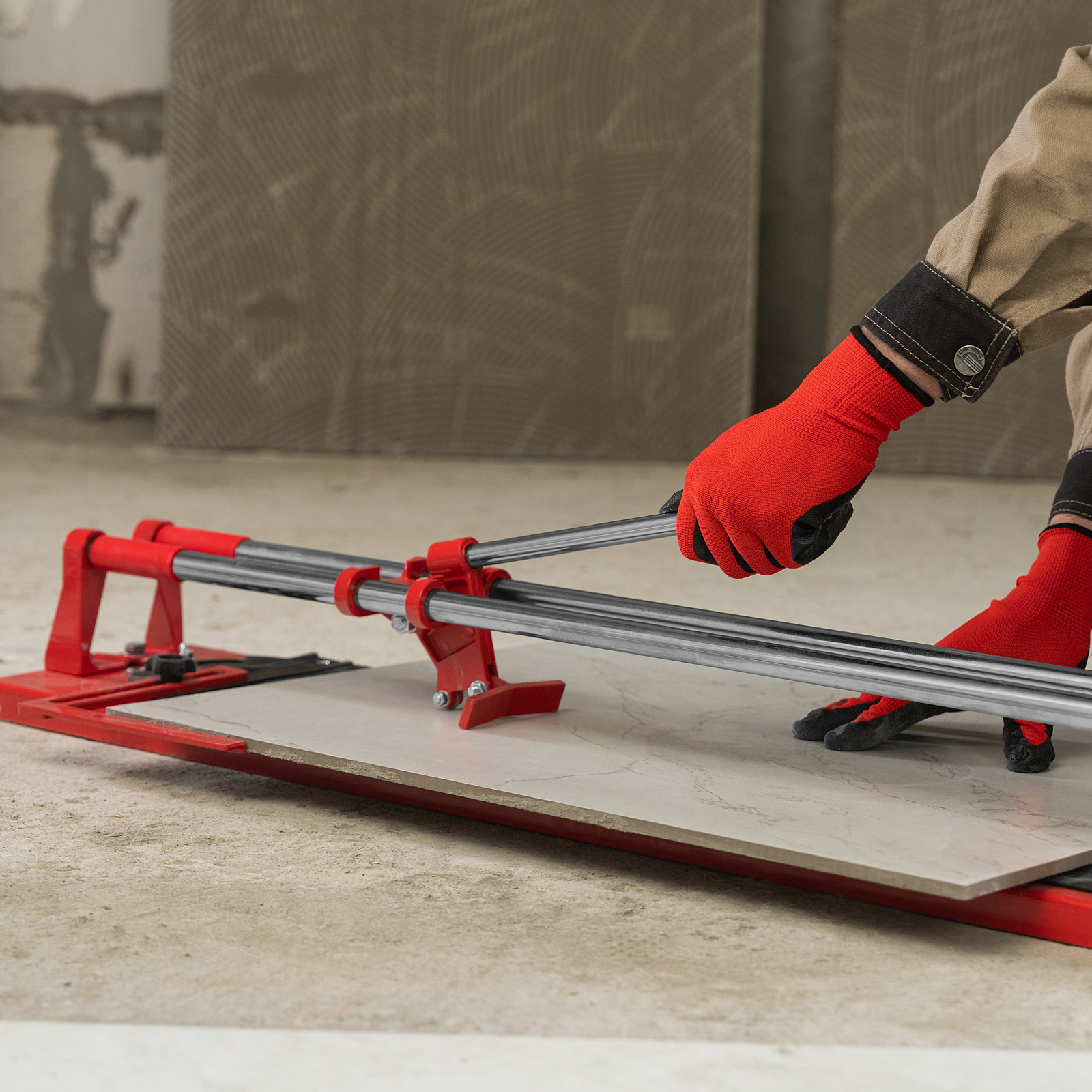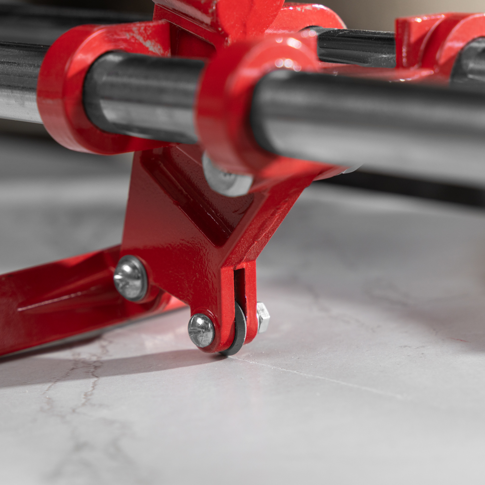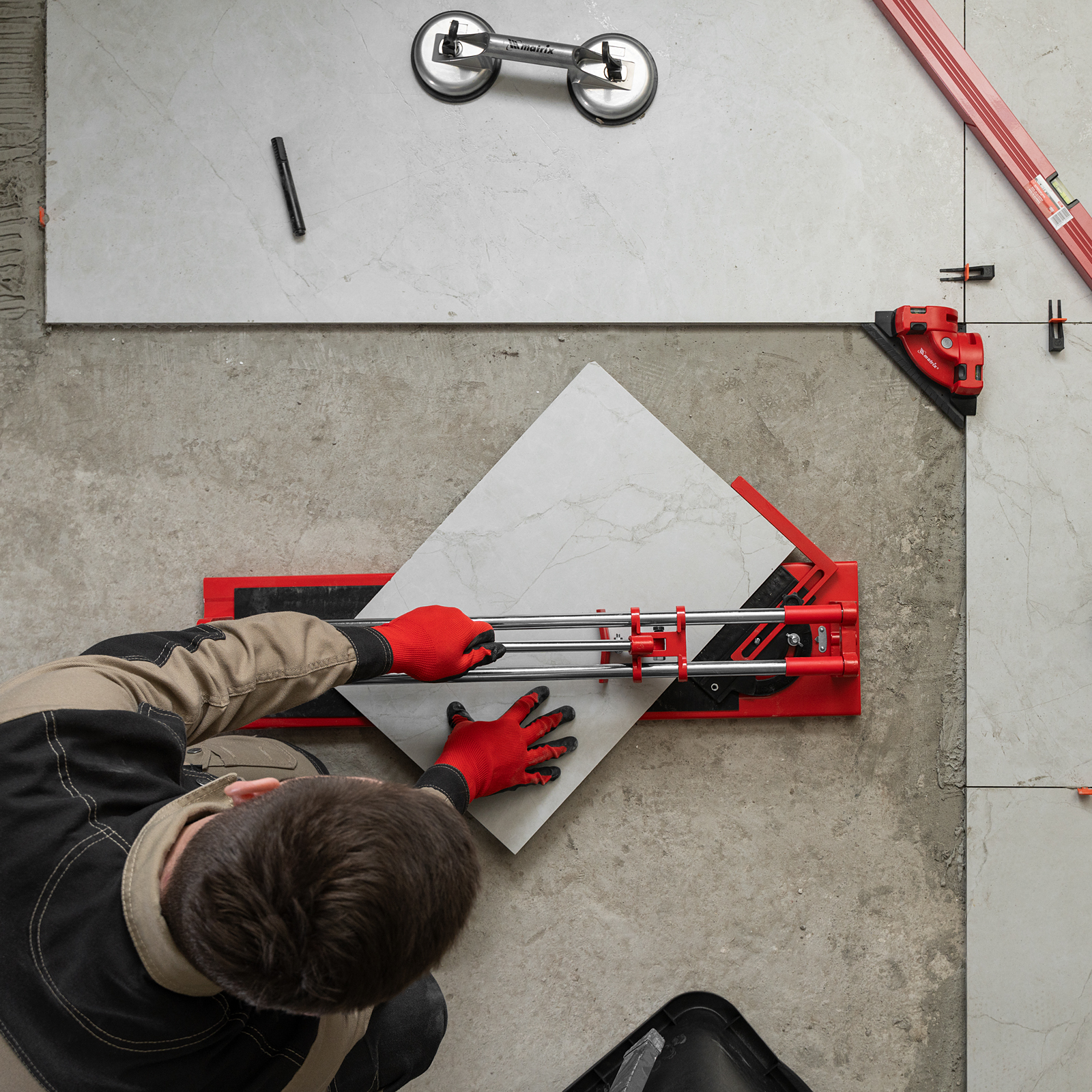- Неподвижность плитки — плиткорез с широким основанием снабжен мягкими амортизирующими накладками, угольник-угломер дополнительно фиксирует заготовку.