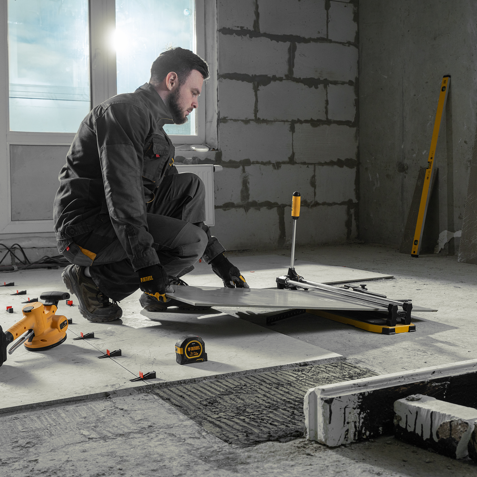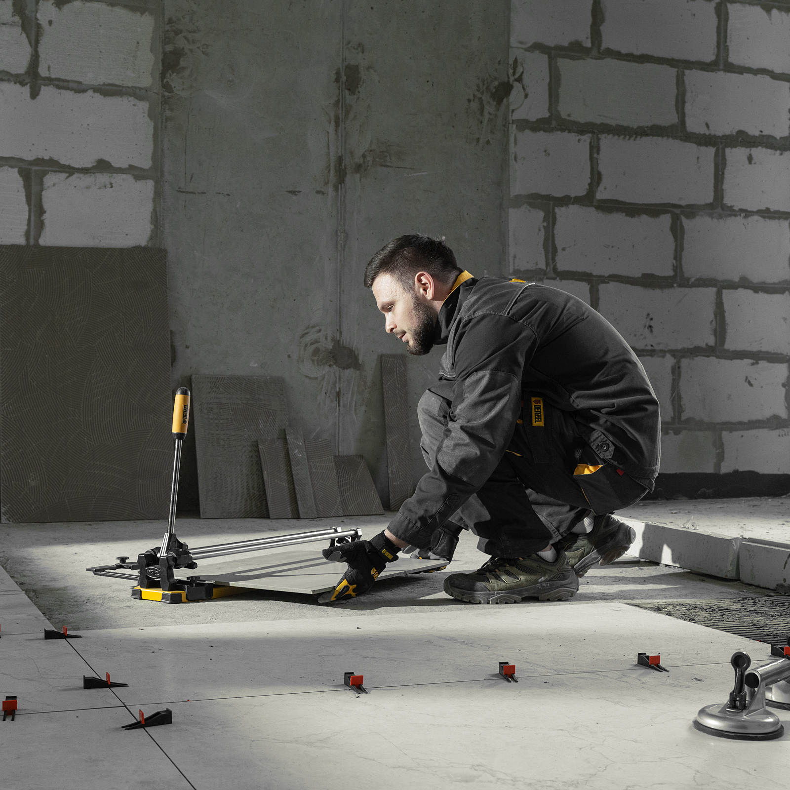 - Удобная работа — благодаря противоскользящим накладкам плиткорез не смещается даже на гладких поверхностях.
