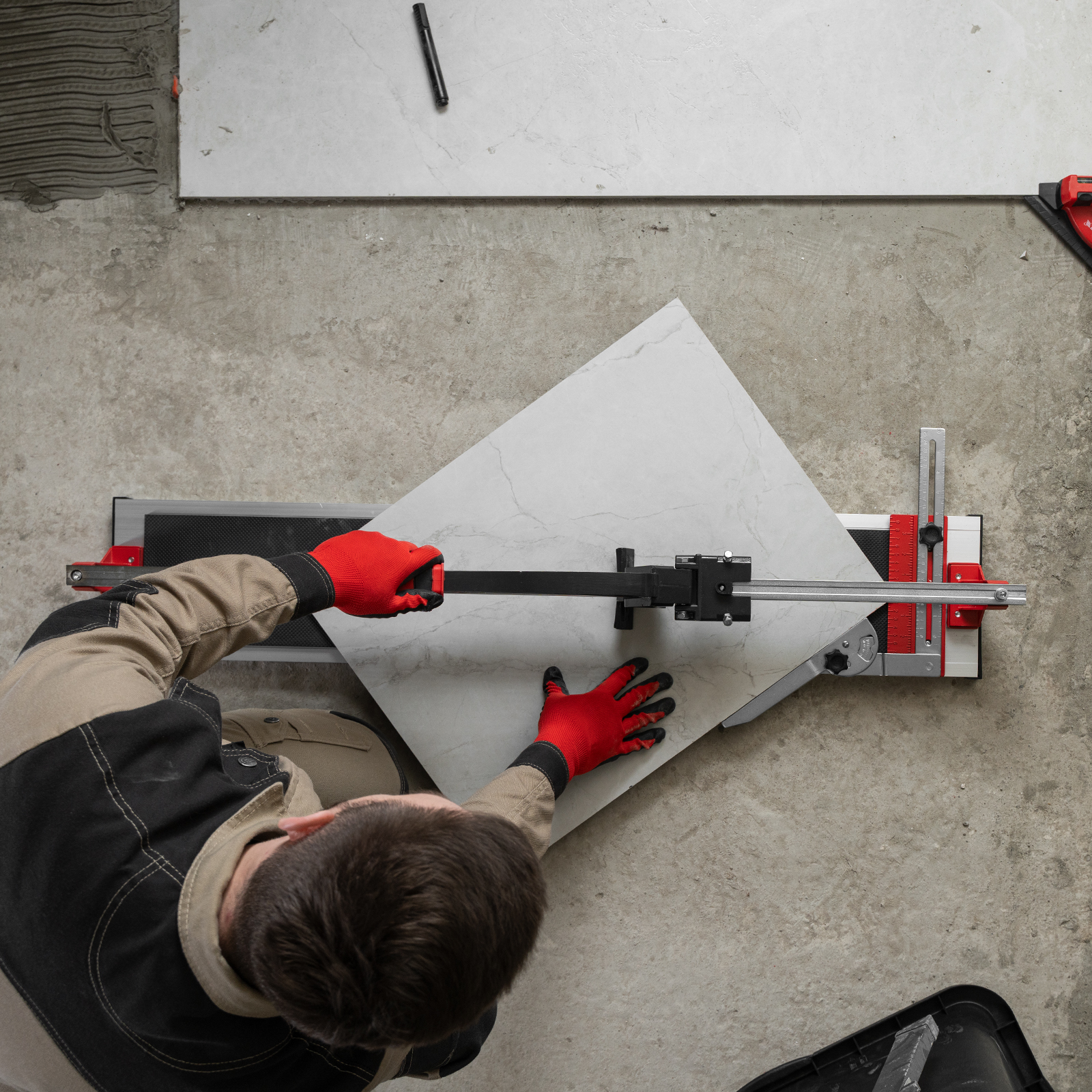 - Резка под углом до 45° — производителем предусмотрен поворотный угольник-угломер, обеспечивающий также дополнительную фиксацию плитки.