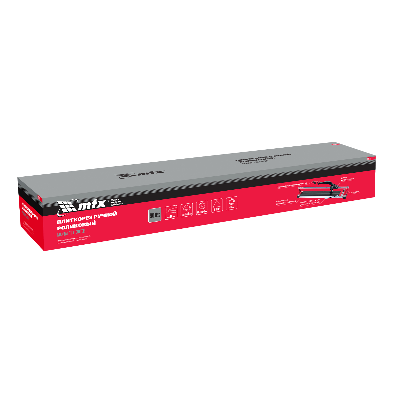 Рельсовый плиткорез MTX 87691 способен резать плитку длиной до 900 мм и толщиной до 16 мм для придания ей необходимых размеров. Мощный разделитель справляется с резкой не только керамической, но и керамогранитной плитки. Продуманная конструкция позволяет производить разлом в любой точке поверхности плитки. Инструмент используется во время проведения облицовочных работ.