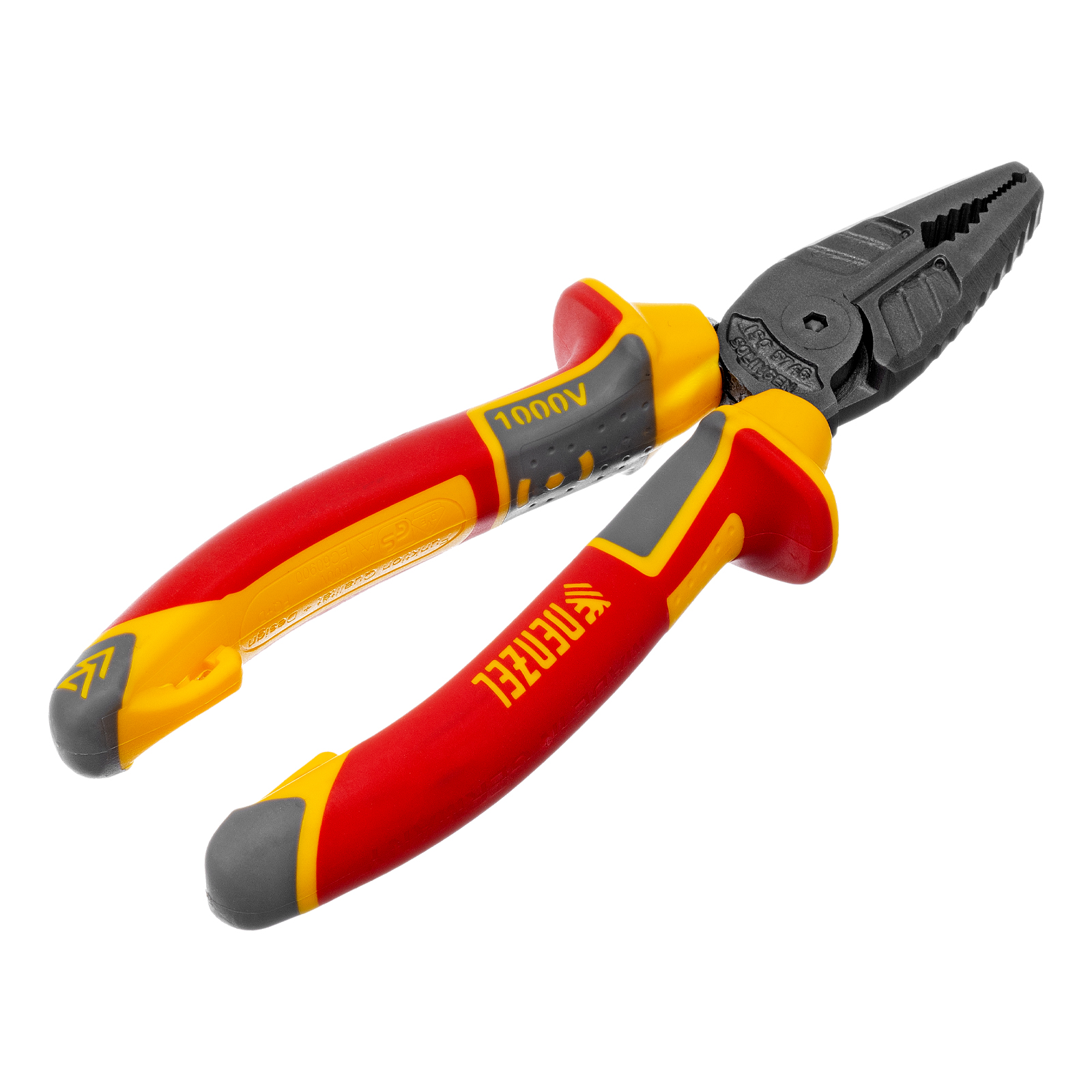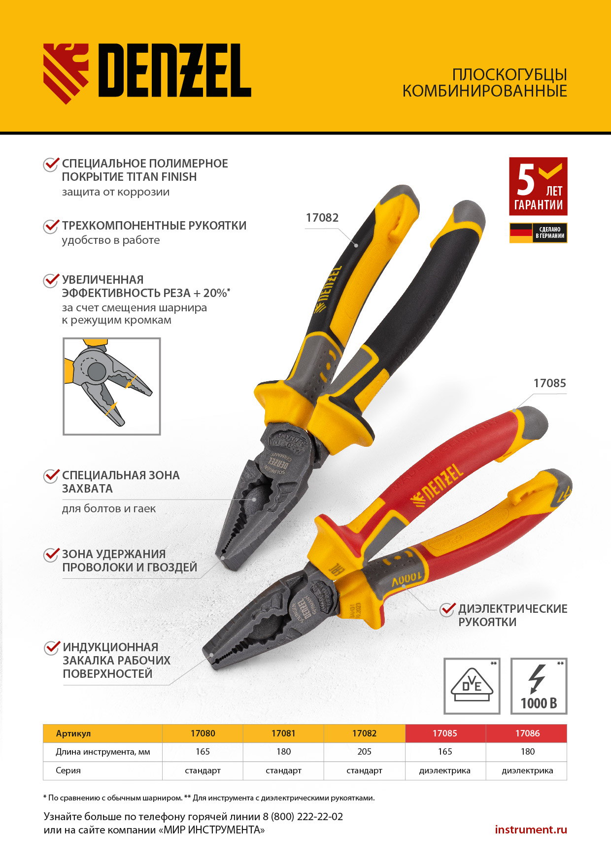 Комбинированные плоскогубцы Denzel 17085 длиной 165 мм, с диэлектрическими трехкомпонентными рукоятками, выдерживающими до 1000 В, предназначены для выполнения работ с токопроводящими элементами. С их помощью можно захватить или согнуть мелкие и крупные детали, перекусить проволоку или перерезать провод. Инструмент подходит для работы с мягкой проволокой (алюминиевой, медной, с пределом прочности 220 Н/мм2) диаметром до 4 мм, проволокой средней жесткости и гвоздями (750 Н/мм2) диаметром до 3,1 мм, и жесткой (предел прочности 1800 Н/мм2) толщиной до 2 мм. Также плоскогубцы можно использовать в качестве гаечного ключа. Инструмент незаменим для проведения слесарных и монтажных работ с различными компонентами и материалами. Внимание: перед началом работ следует отключить напряжение!
