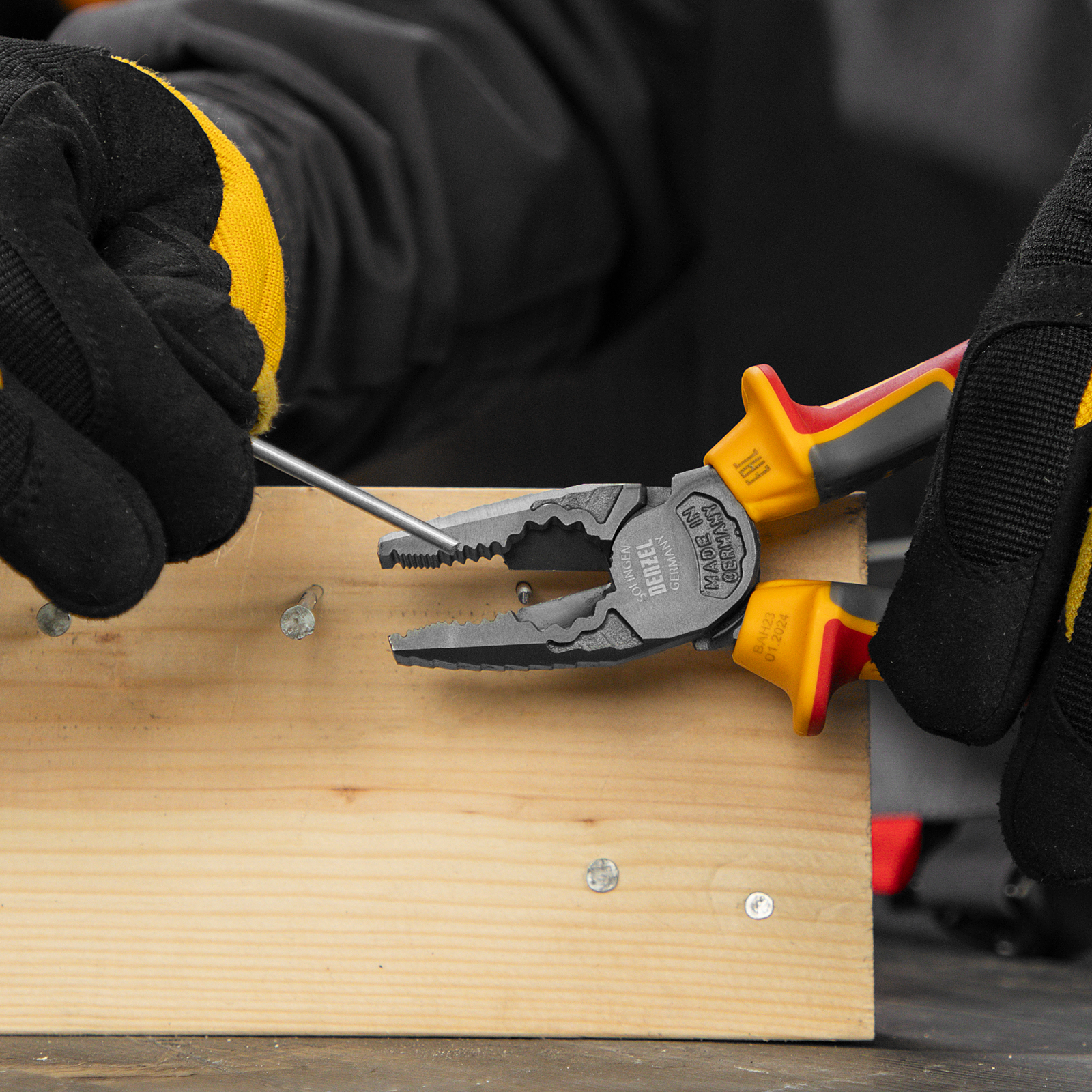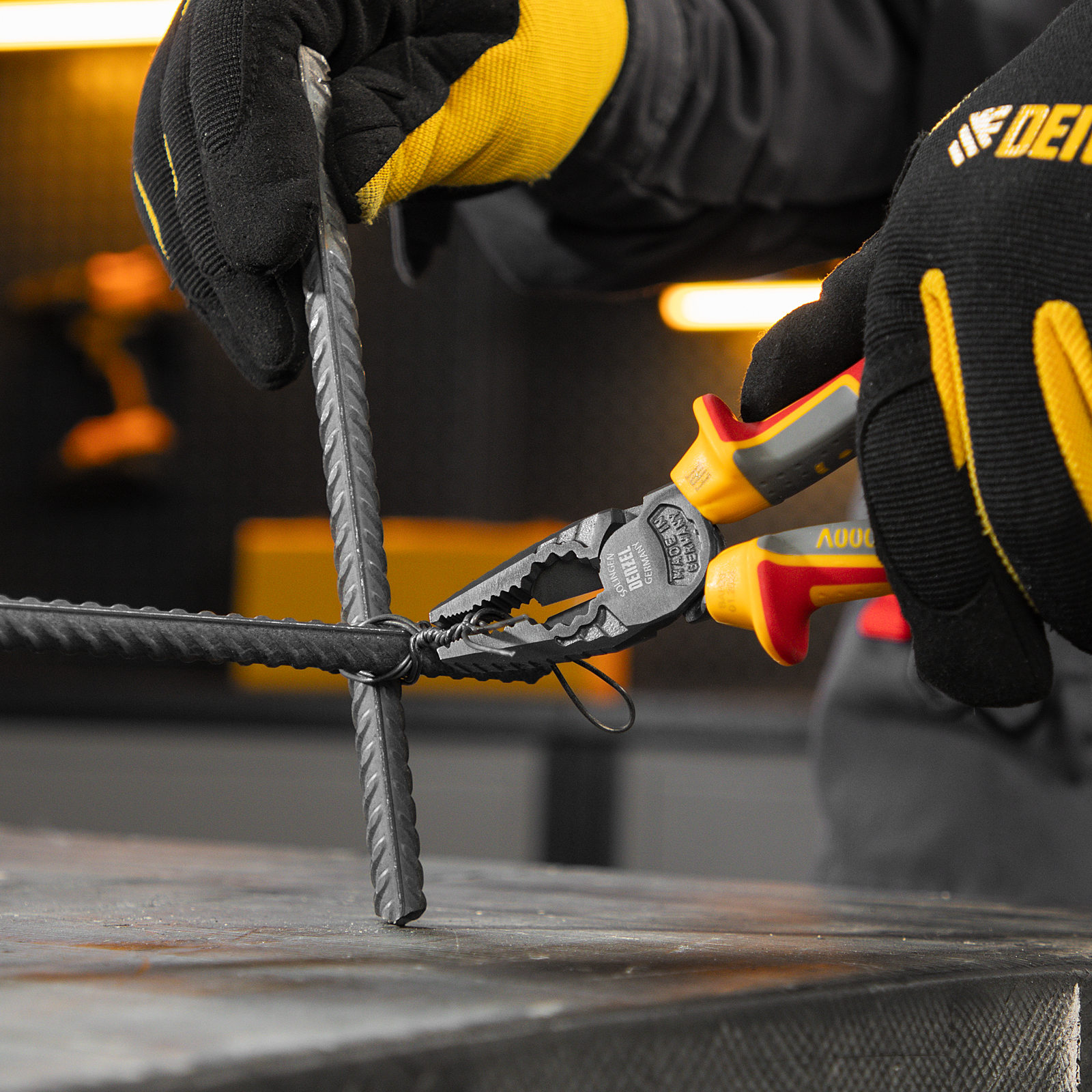 Комбинированные плоскогубцы Denzel 17086 длиной 180 мм, с диэлектрическими трехкомпонентными рукоятками, выдерживающими до 1000 В, предназначены для выполнения работ с токопроводящими элементами. С их помощью можно захватить или согнуть мелкие и крупные детали, перекусить проволоку или перерезать провод. Инструмент подходит для работы с мягкой проволокой (алюминиевой, медной, с пределом прочности 220 Н/мм2) диаметром до 5,2 мм, проволокой средней жесткости и гвоздями (750 Н/мм2) диаметром до 3,4 мм, и жесткой (предел прочности 1800 Н/мм2) толщиной до 2,2 мм. Также плоскогубцы можно использовать в качестве гаечного ключа. Инструмент незаменим для проведения слесарных и монтажных работ с различными компонентами и материалами. Внимание: перед началом работ следует отключить напряжение!