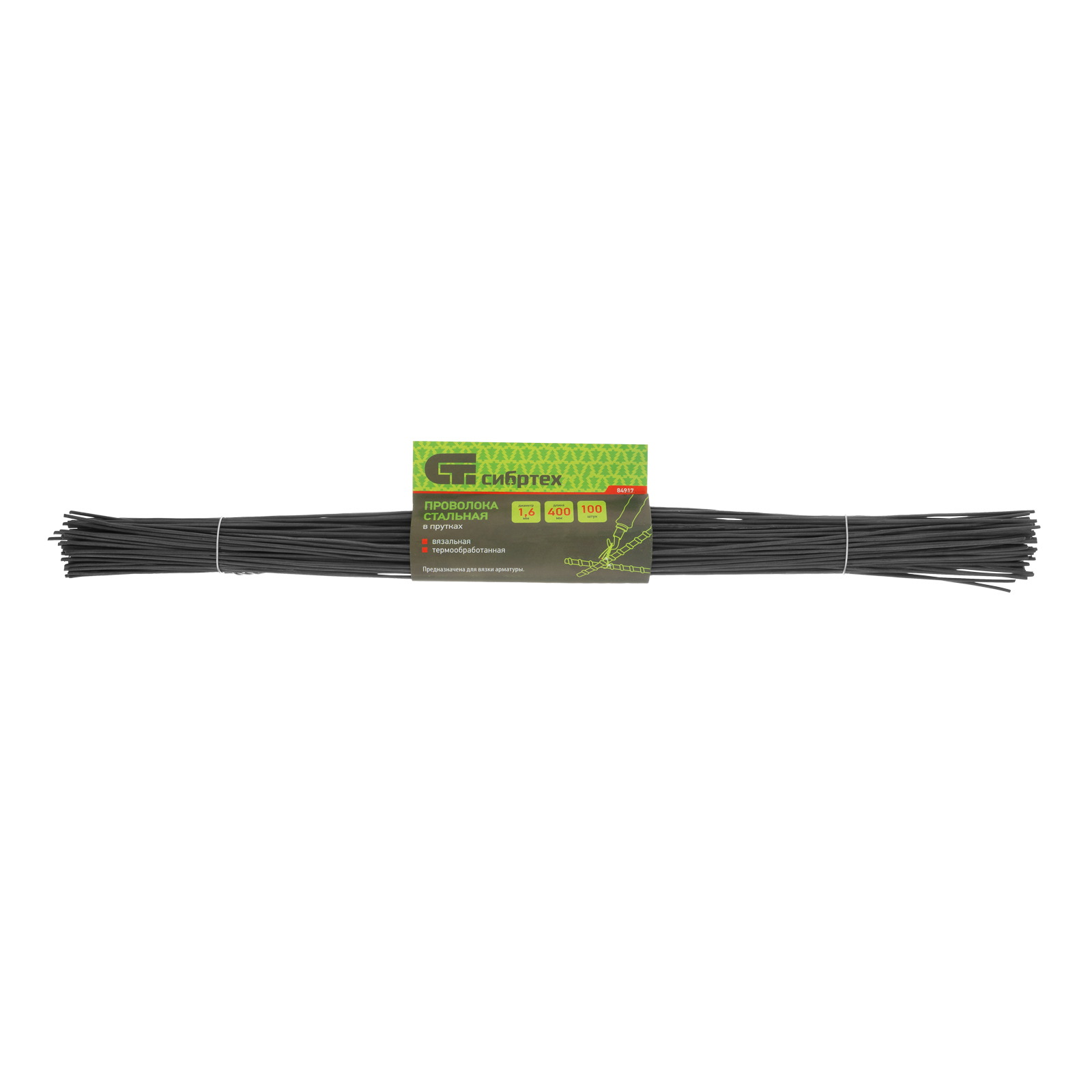 Вязальная стальная проволока в прутках Сибртех 84917, термообработанная, длиной 400 мм и диаметром 1,6 мм, 100 шт., предназначена для вязки стальных сеток и арматуры. Пригодится на строительных площадках для армирования конструкций из железобетона.