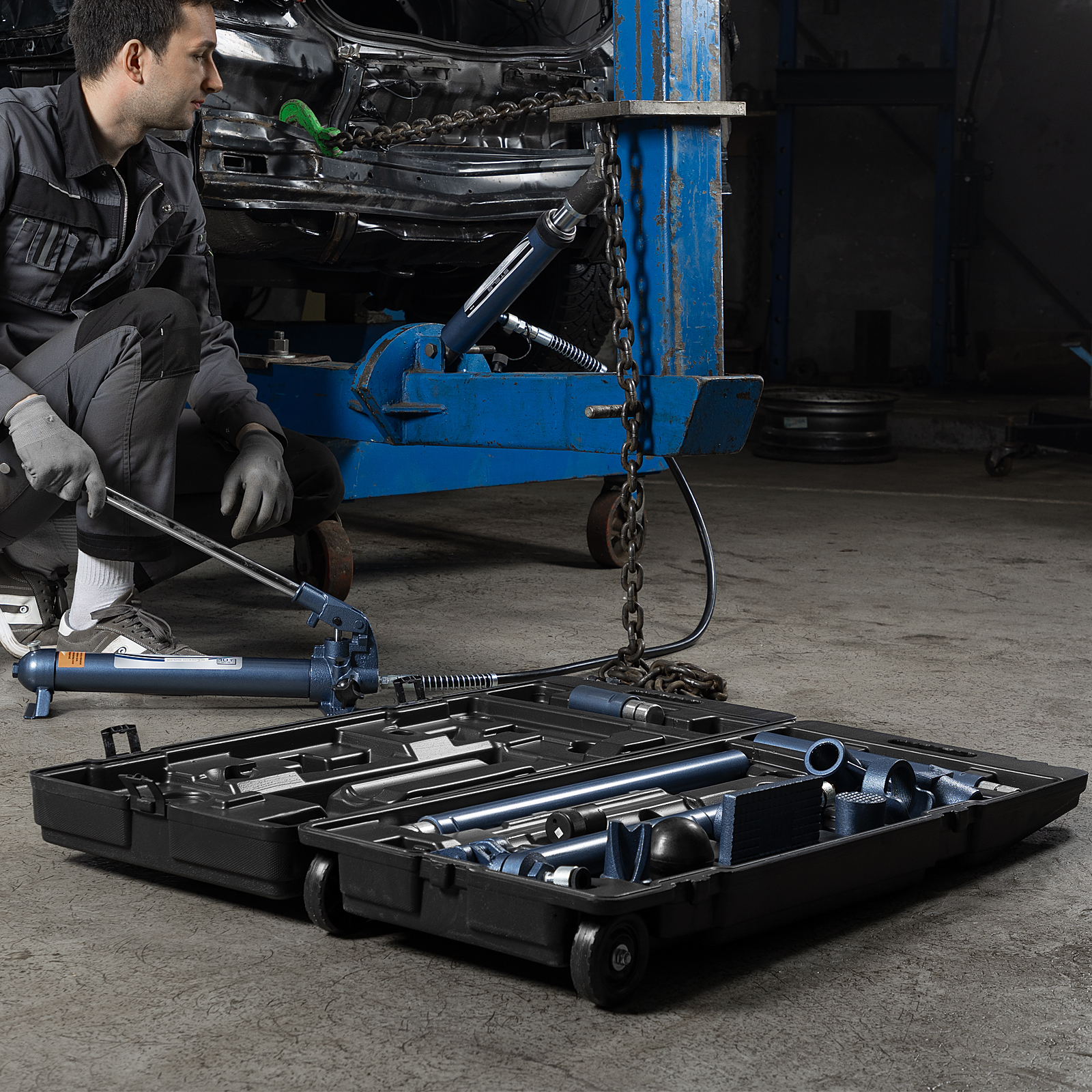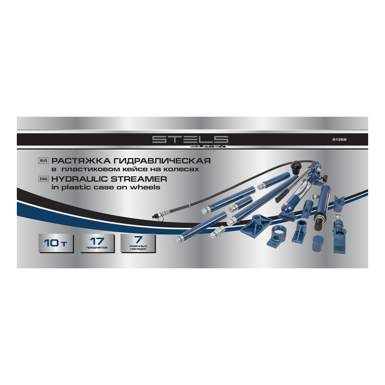 Гидравлическая растяжка Stels 51356, рассчитанная на усилие до 10 т, — компактный набор в пластиковом кейсе на колесах, включающий 17 предметов — цилиндр, гидронасос, адаптер, удлинители, опорную площадку и 7 сменных насадок. Ее используют для рихтовки металлических конструкций и проведения кузовного ремонта. Растяжка эффективно восстанавливает геометрию проемов автомобильных окон и дверей, а также больших участков кузова. Пригодится в автосервисе, будет полезна в гараже.