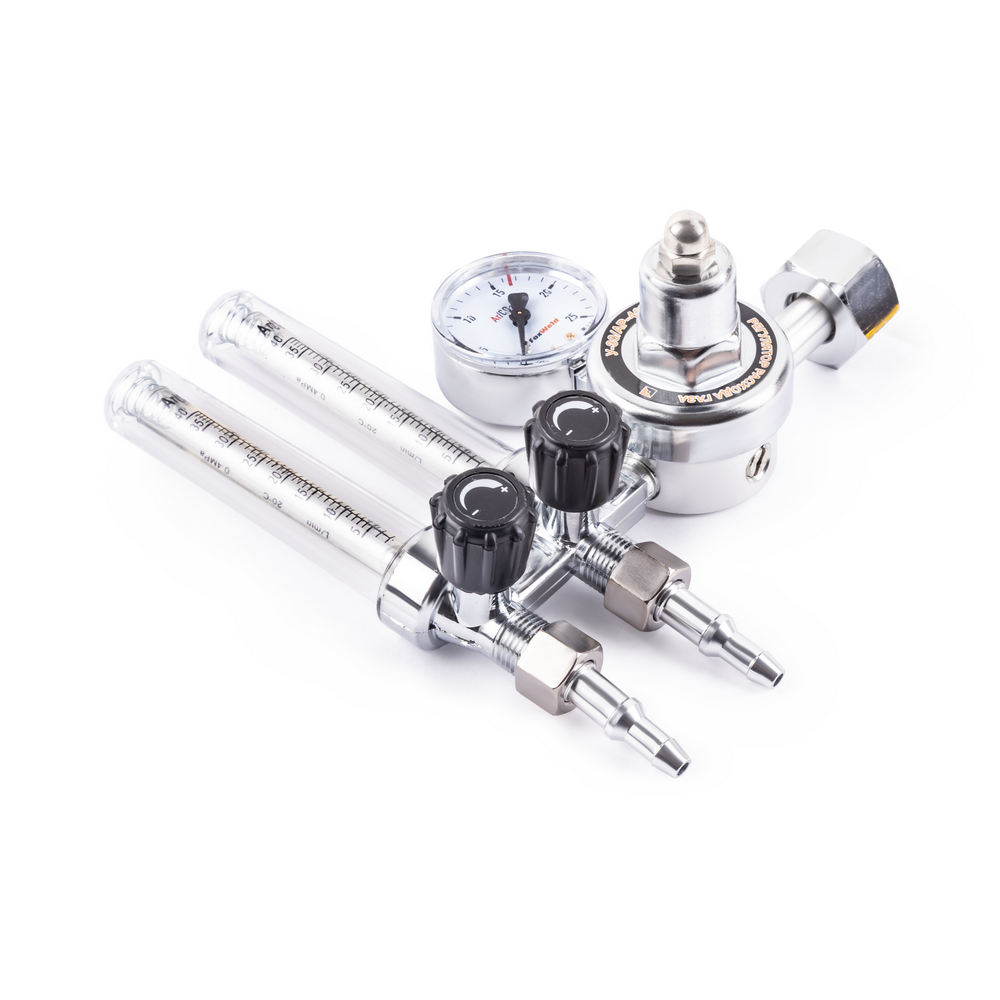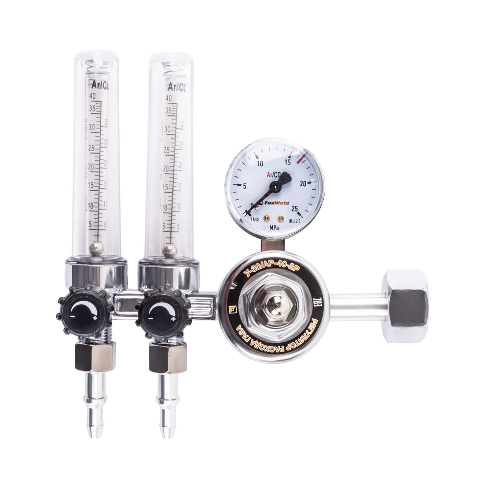 Регулятор расхода газа У-30/АР-40-2P предназначен для регулировки расхода углекислого газа и аргона на выходе из баллона, снижает и выравнивает давление газа до рабочего уровня, поддерживает заданный расход при выполнении газосварочных работ. Регуляторы расхода газа с двумя ротаметрами используются для сварки нержавеющей стали с поддувом. Один ротаметр отвечает за подачу газа к сварочному аппарату, второй — за поддув изделия. Газовые регуляторы с двумя ротаметрами используют для подключения двух сварочных аппаратов к одному баллону. Алюминиевый корпус включает в себя манометр высокого давления на входе и два ротаметра на выходе, что позволяет точно отрегулировать необходимый расход газа.ВЫСОКАЯ ЭФФЕКТИВНОСТЬ: Газовый регулятор обеспечивает меньший расход рабочих газов при газосварочном процессе, поддерживает заданный уровень давления до окончания работы и экономит газ в баллоне.ВНЕШНИЕ РЕГУЛИРОВКИ: Аргоновый регулятор имеет вентиль регулировки подачи газа. Для качественного выполнения газосварочных работ необходимо создать рабочую среду и контролировать расход газа, поступающий из баллона. Вентиль снижает или понижает поступающее давление - можно настроить необходимое рабочее давление на выходе и проконтролировать процесс с помощью манометра.ВСТРОЕННЫЙ МАНОМЕТР: Встроенный манометр давления на входе показывает давление поступающего из баллона газа. С помощью манометра удобно отслеживать уровень давления и задать необходимый объём для работы. Регулировка давления подачи газа осуществляется с помощью наружного вентиля.КОМПЛЕКТАЦИЯ: Регулятор расхода газа У-30/АР-40-2P – 1 шт.; Индивидуальная упаковка – 1 шт.; Инструкция по эксплуатации – 1 шт.*Производитель оставляет за собой право менять комплектацию оборудования.