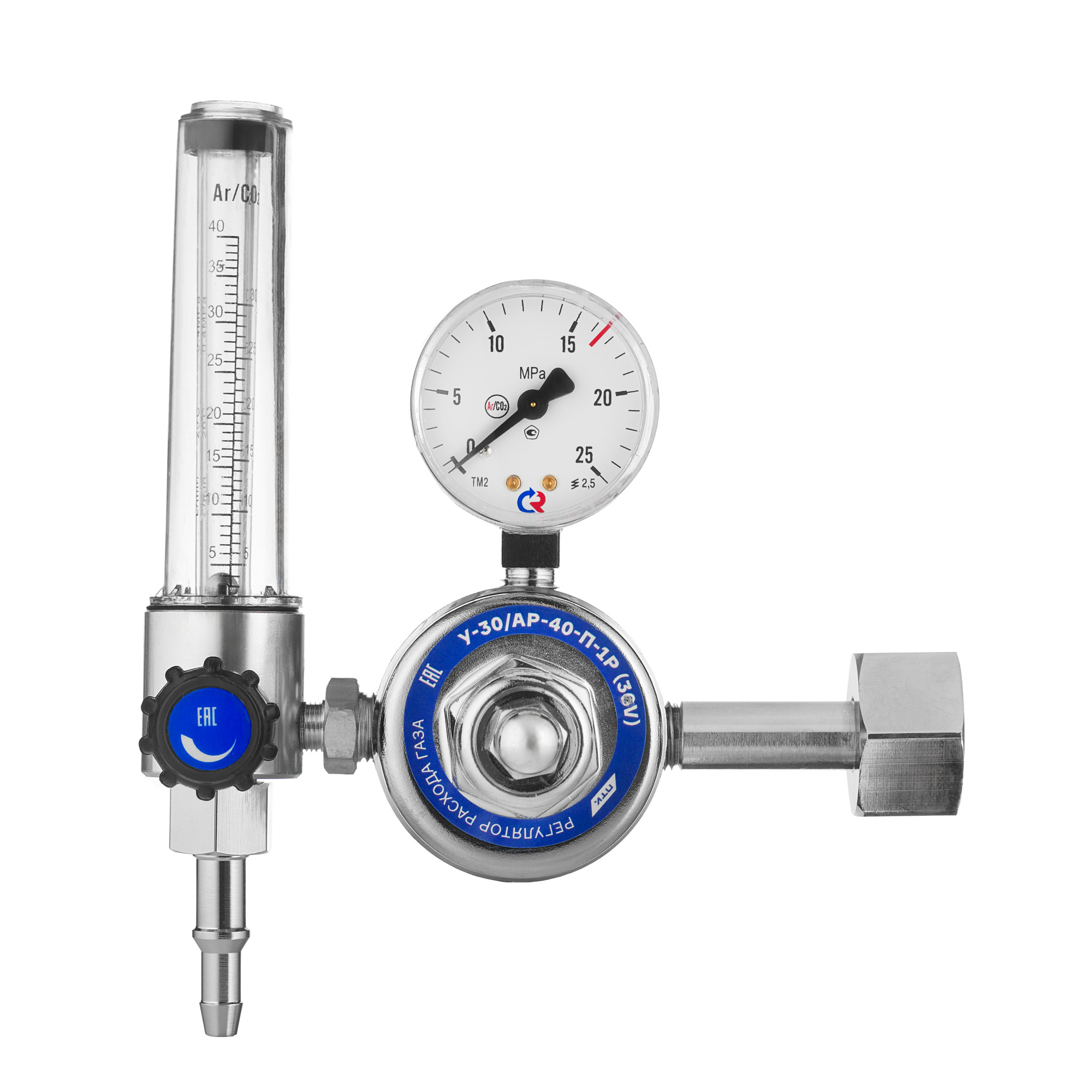 В корпус регулятора встроен подогреватель на 36В. Электроподогреватель обеспечивает работоспособность регулятора при низких температурах окружающей среды (до -30°С). Корпус регулятора изготовлен из латуни, никелированное покрытие. Колба ротаметра изготовлена из прочного пластика, которая имеет две шкалы Ar/CO2.