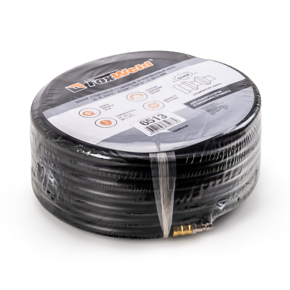 Воздушный резиновый армированный шланг AERO от FoxWeld с фитингами Rapid F - Rapid M, длиной 25 м. Используется для подключения пневмоинструмента к компрессору, достаточная длина оснастки позволяет осуществлять работы на требуемом расстоянии. Увеличенный внутренний диаметр шланга 9 мм обеспечивает лучшую пропускную способность для сжатого воздуха и обеспечивает сохранение максимальной производительности. Шланг класса С - произведен из маслостойкой резины (полиуретан), что обеспечивает ему высокую износоустойчивость и возможность подключения его к воздушной магистрали с содержанием частиц масла при работе в связке с масляным воздушным компрессором. Также благодаря армированию, шланг выдерживает высокие нагрузки по давлению сжатого воздуха до 25 бар и может храниться и эксплуатироваться при температурах от -25 до +70 градусов Цельсия. Концевые муфты типа рапид изготовлены из качественного сплава, устойчивого к коррозии и деформации. Изделие имеет соответствие стандарту ГОСТ ISO 2398-2014.
