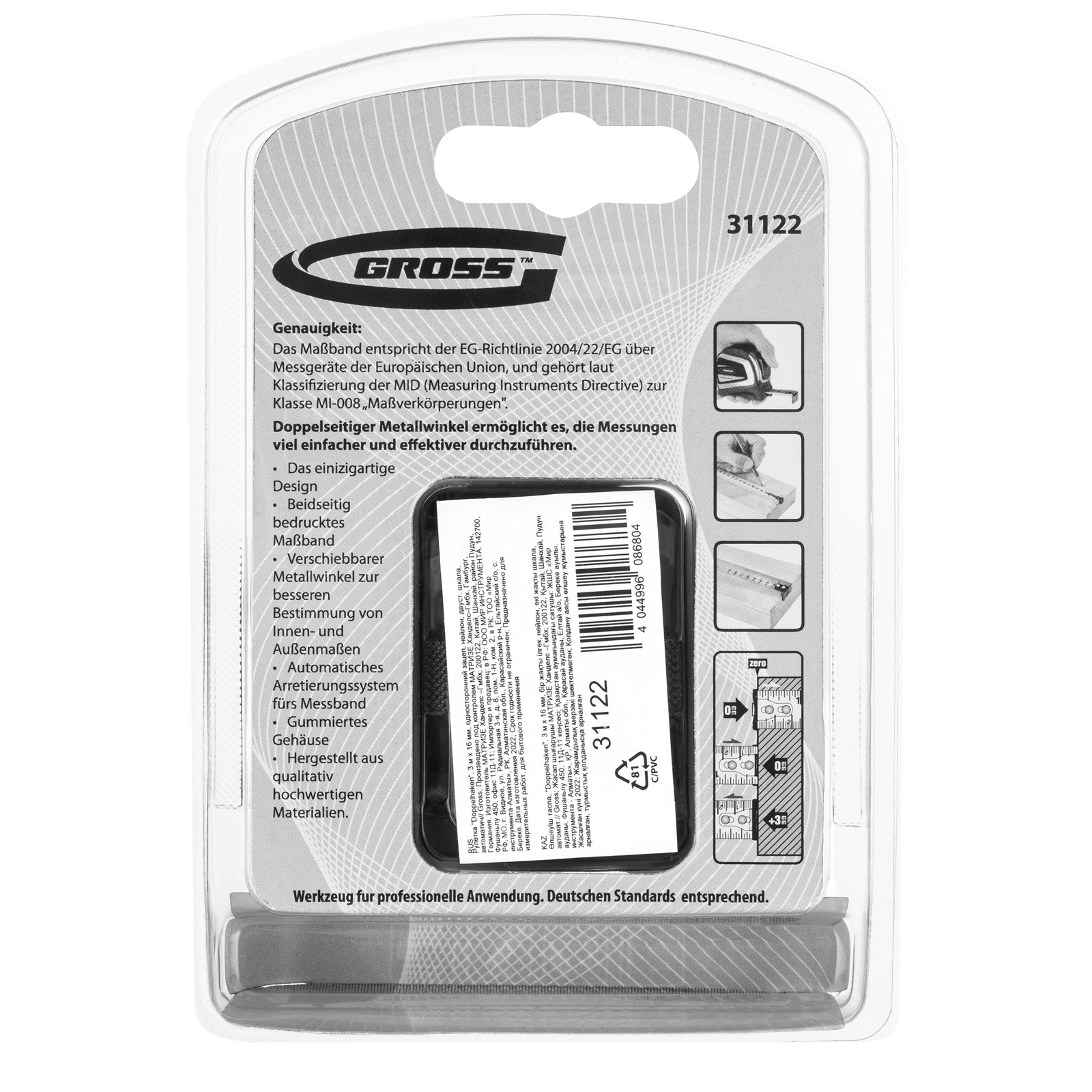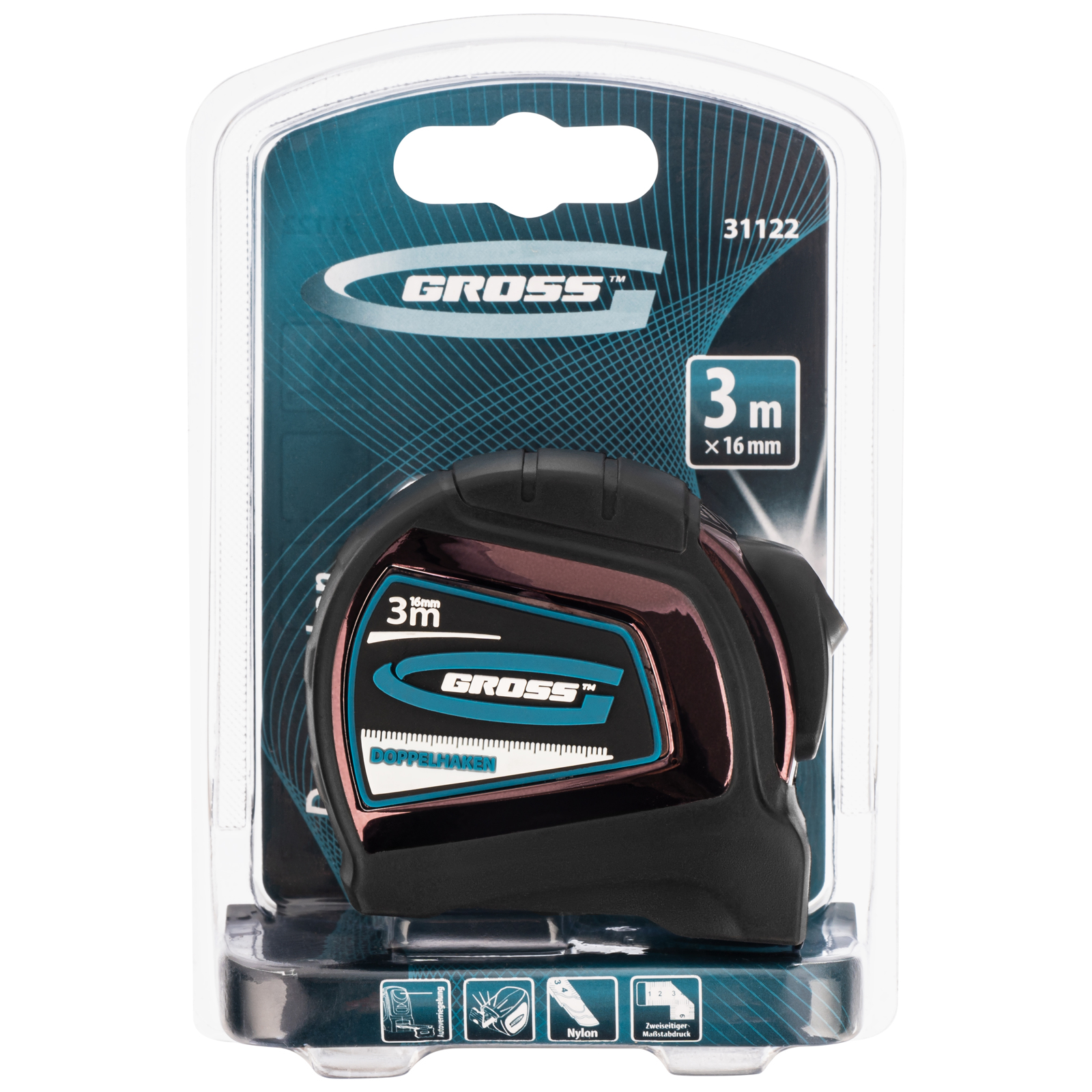 Рулетка "Doppelhaken",3 м x 16 мм,односторонний зацеп,Нейлон,двусторонняя шкала,автоматическая фиксация Gross в Краснодаре