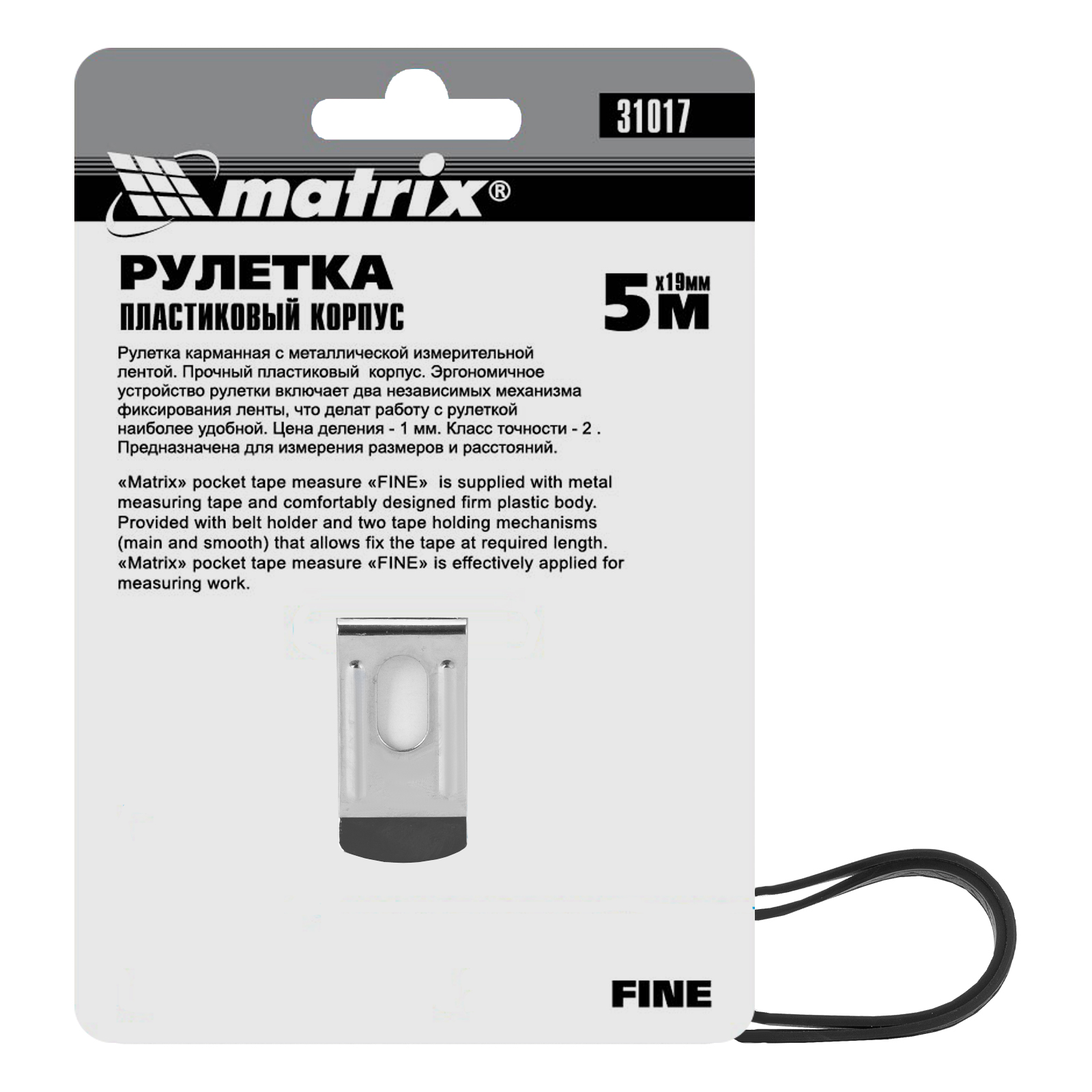 Рулетка Matrix Fine 31017 с лентой длиной 5 м и шириной 19 мм, в пластиковом корпусе, используется для замера расстояний и определения размеров различных объектов. Имеет наиболее распространенный класс точности 2, цена деления составляет 1 мм. Стопор и кнопка-пауза для фиксации ленты облегчают проведение измерений. Инструмент применяется как во время строительных работ, так и в быту.
