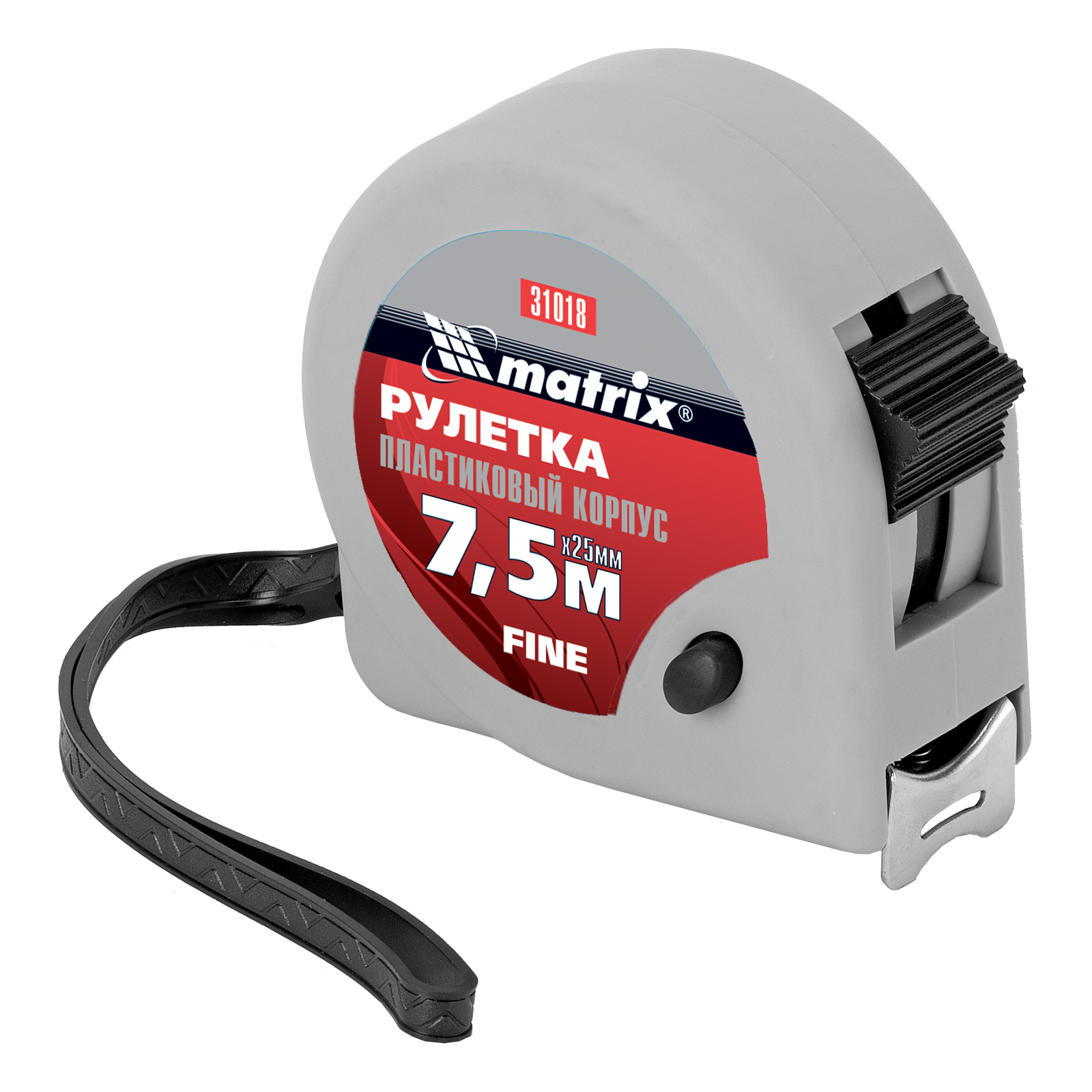 Рулетка Matrix Fine 31018 с лентой длиной 7,5 м и шириной 25 мм, в пластиковом корпусе, используется для замера расстояний и определения размеров различных объектов. Имеет наиболее распространенный класс точности 2, цена деления составляет 1 мм. Стопор и кнопка-пауза для фиксации ленты облегчают проведение измерений. Инструмент применяется как во время строительных работ, так и в быту.