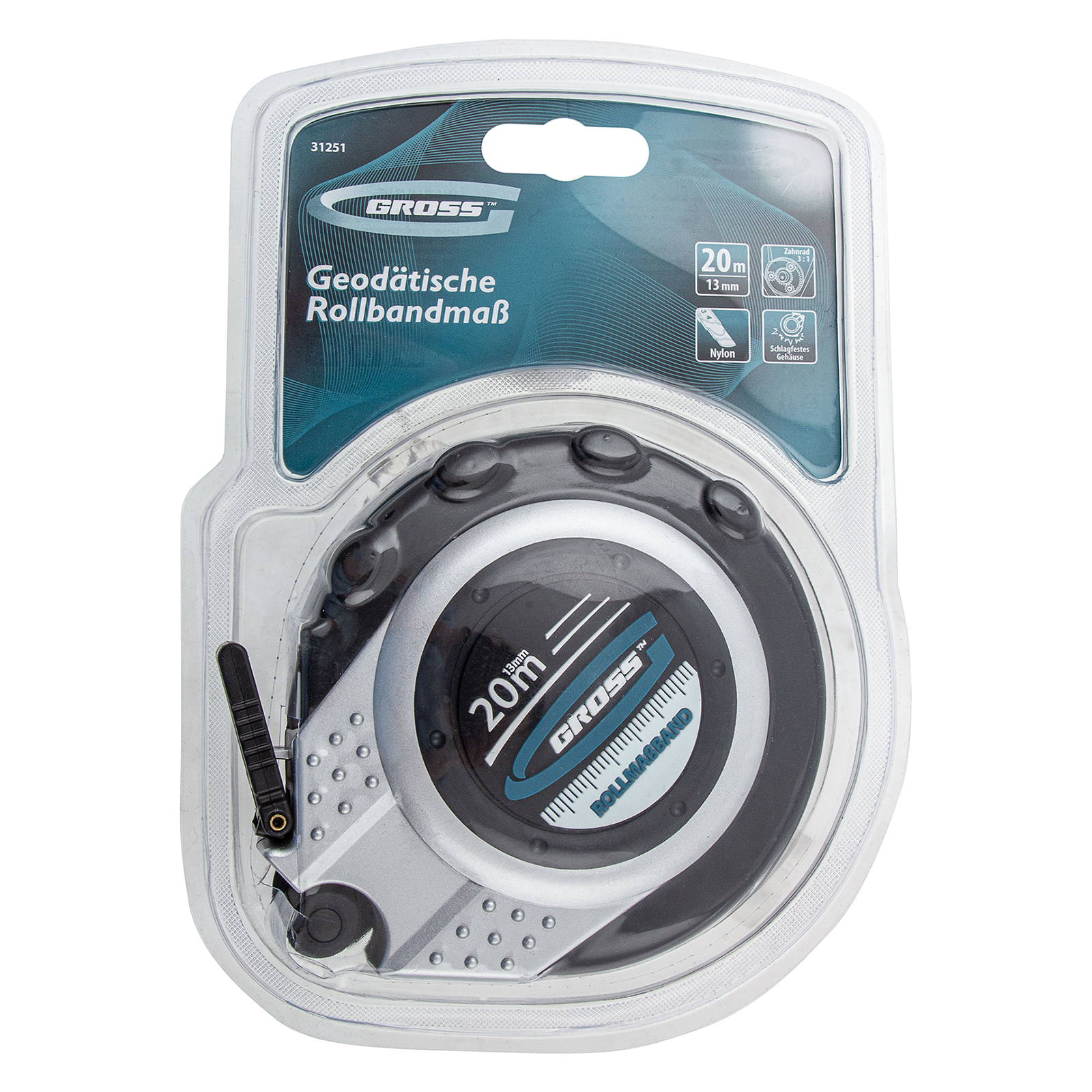 Геодезическая рулетка Gross Rollmassband 31251 в закрытом корпусе, с металлической лентой 20 м х 13 мм с нейлоновым покрытием, используется для определения расстояний и размеров различных объектов. Механизм заключен в двухкомпонентный закрытый корпус из пластика и термостойкой резины, поэтому рулетка устойчива к повреждениям в результате случайных ударов и падений. Комбинированный зацеп упрощает фиксацию измерительной ленты на измеряемой поверхности. Инструмент будет полезен на строительной площадке или земельном участке, а также при проведении обмеров внутри помещений.