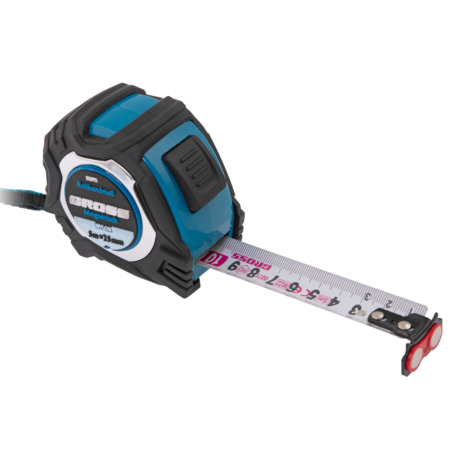 Рулетка «Magnetisch» Gross 32572 в обрезиненном корпусе, с полотном 5 м х 25 мм, магнитным зацепом, нейлоновым покрытием и функцией автоматической фиксации, используется в ходе ремонтных и строительных работ. Оптимально подходит для замера длины стен, полов, различных заготовок, мебели, оконных проемов и т.д. Благодаря магнитному зацепу рулетку удобно использовать при работе с металлическими поверхностями.