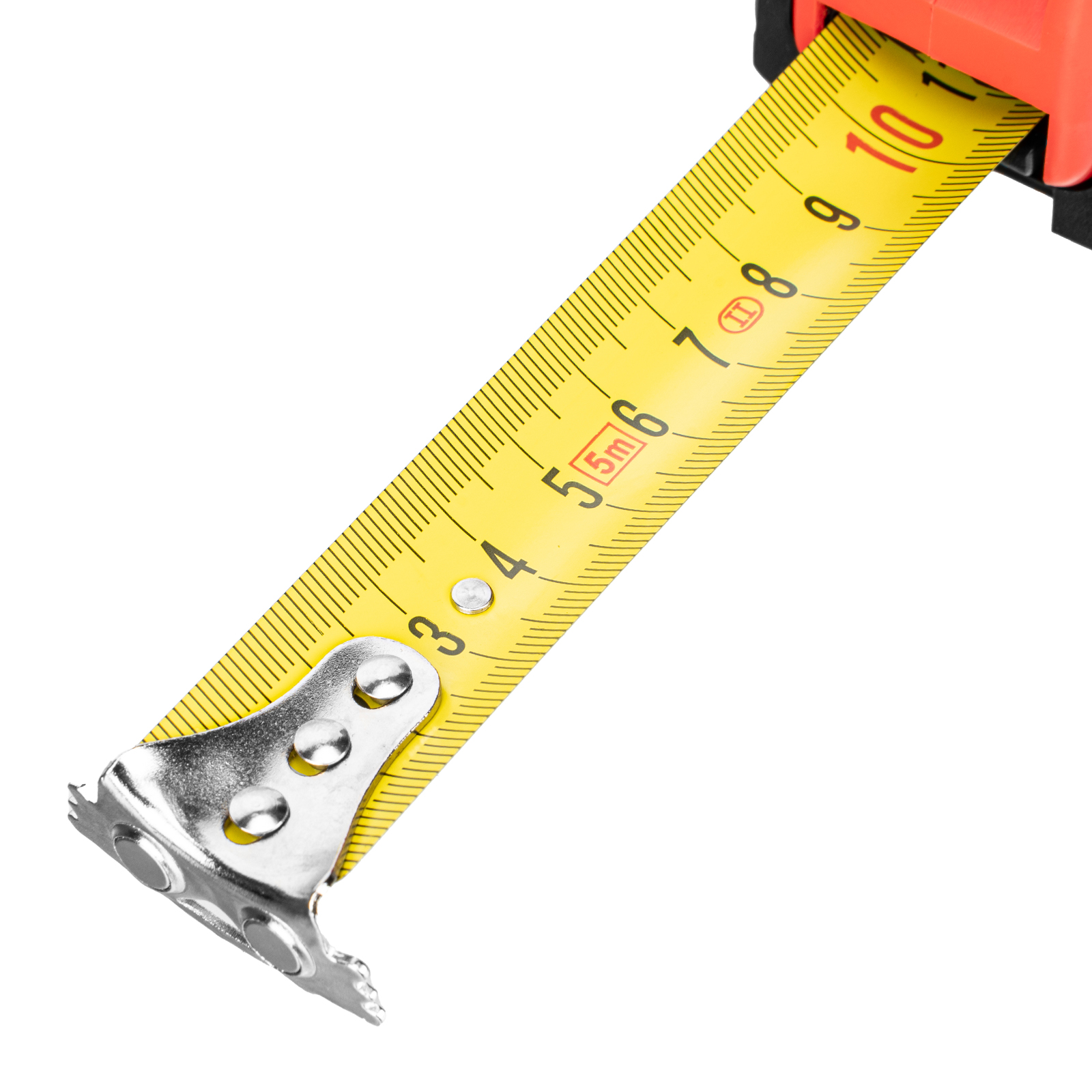 Рулетка Matrix Status magnet 3 fixations 31005 с полотном длиной 5 м и шириной 25 мм, в обрезиненном корпусе, оснащенная зацепом с магнитом, предназначена для измерения различных объектов и расстояний. Имеет класс точности 2 и цену деления 1 мм, что обеспечивает достаточную результативность замеров. Магнитный зацеп позволяет четко фиксировать измерительное полотно на металлических предметах. Стальная лента шириной 25 мм обладает большой упругостью, что облегчает работу в труднодоступных местах. Рулетка будет полезна при проведении строительных работ, а также пригодится в быту.