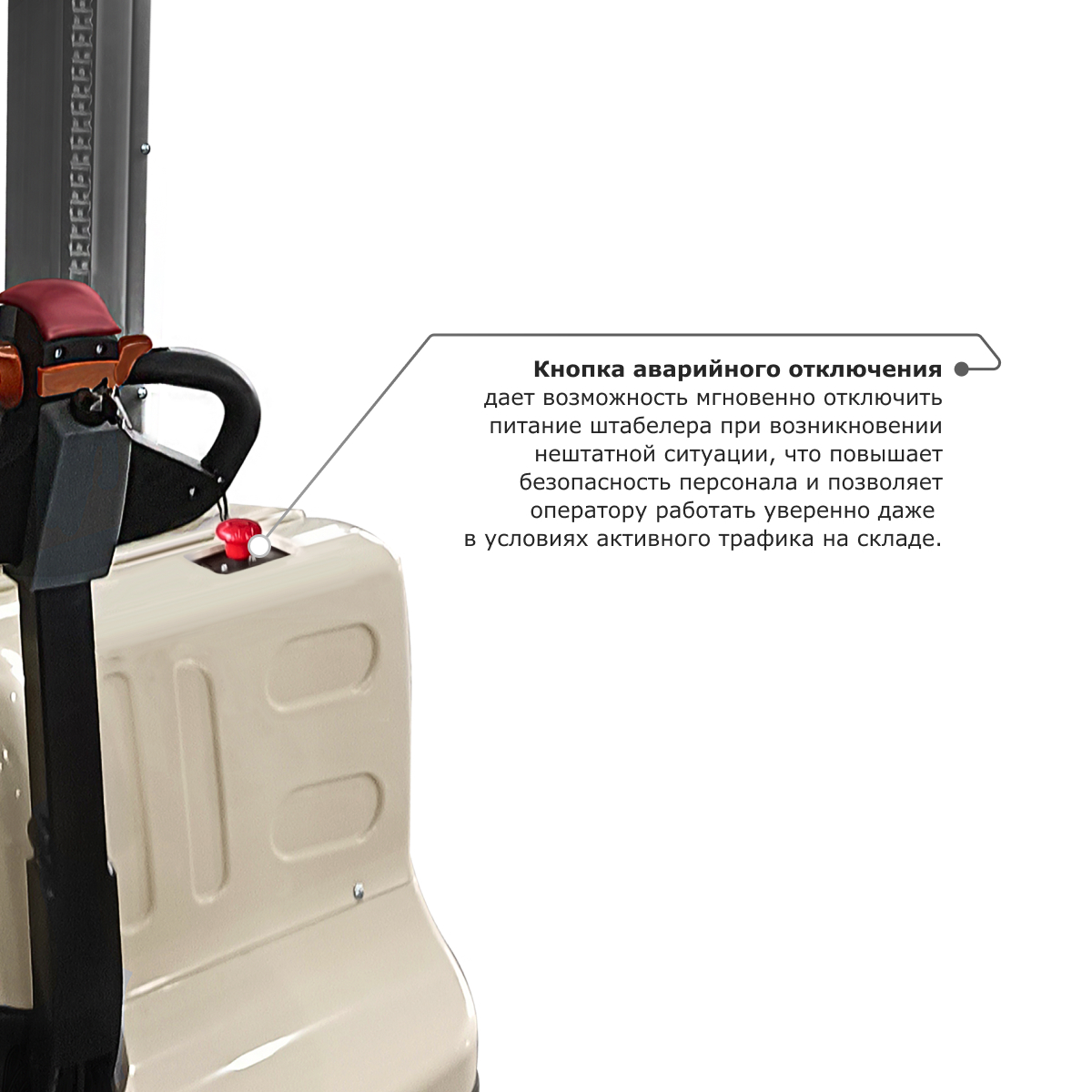 Встроенный индикатор заряда позволит всегда поддерживать оборудование в рабочем состоянии. На штабелере установлено множество дополнительных элементов, в частности: кнопка аварийного отключения, позволяющая быстро отключить штабелер в случае возникновения опасной ситуации, решетчатый экран на мачте, защищающий оператора от возможных травм, интегрированный замок зажигания и полный набор необходимых клавиш управления на ручке, в том числе кнопка «черепашьего хода».