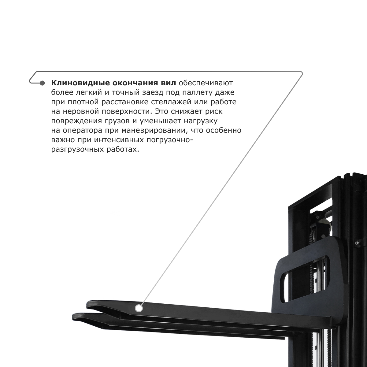 Мачта выполнена из С-образного профиля с дополнительными ребрами жесткости. Благодаря такой конструктивной особенности срок эксплуатации штабелера значительно возрастает.