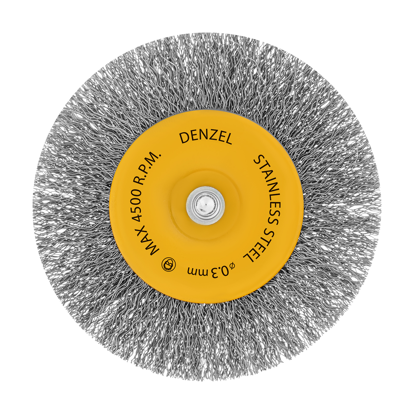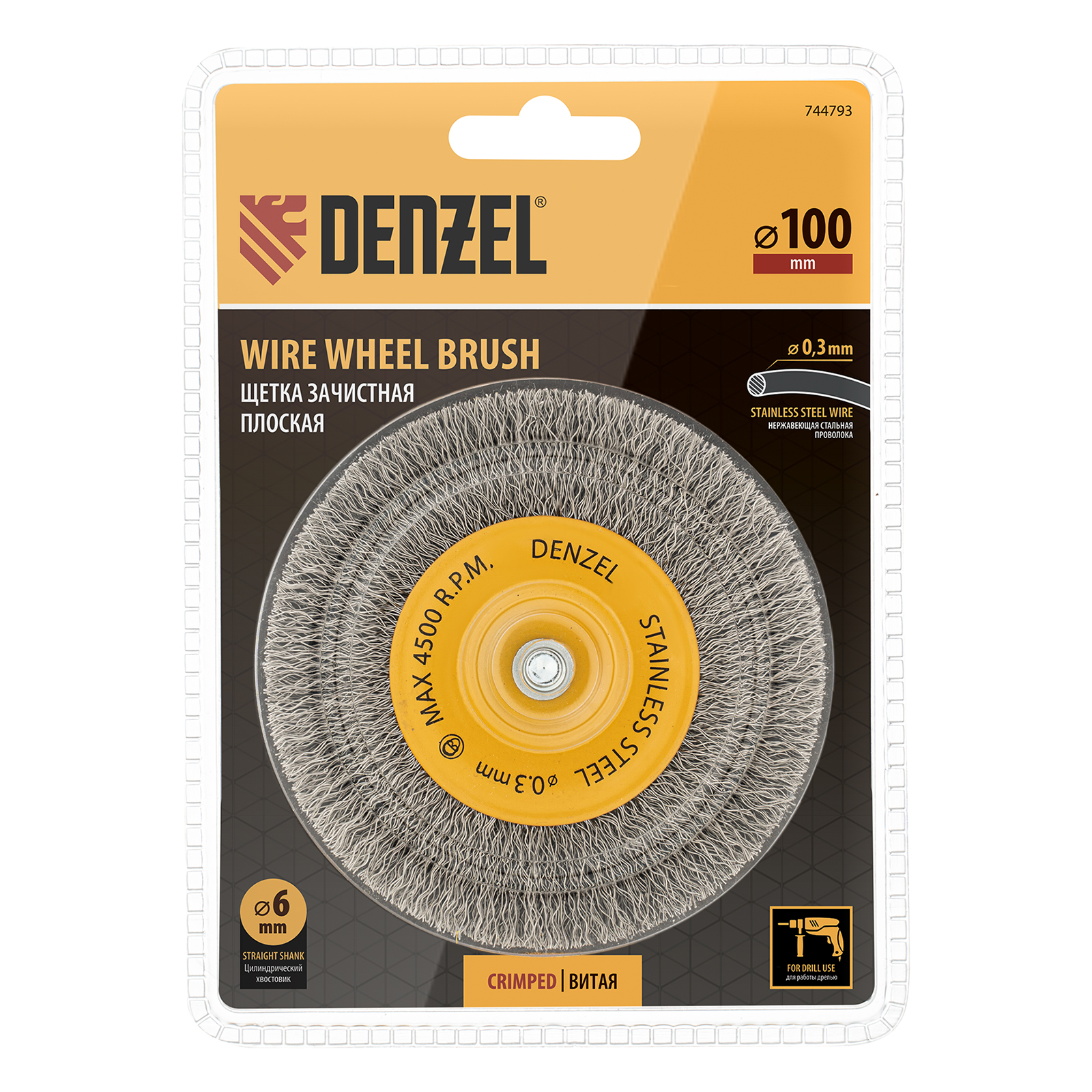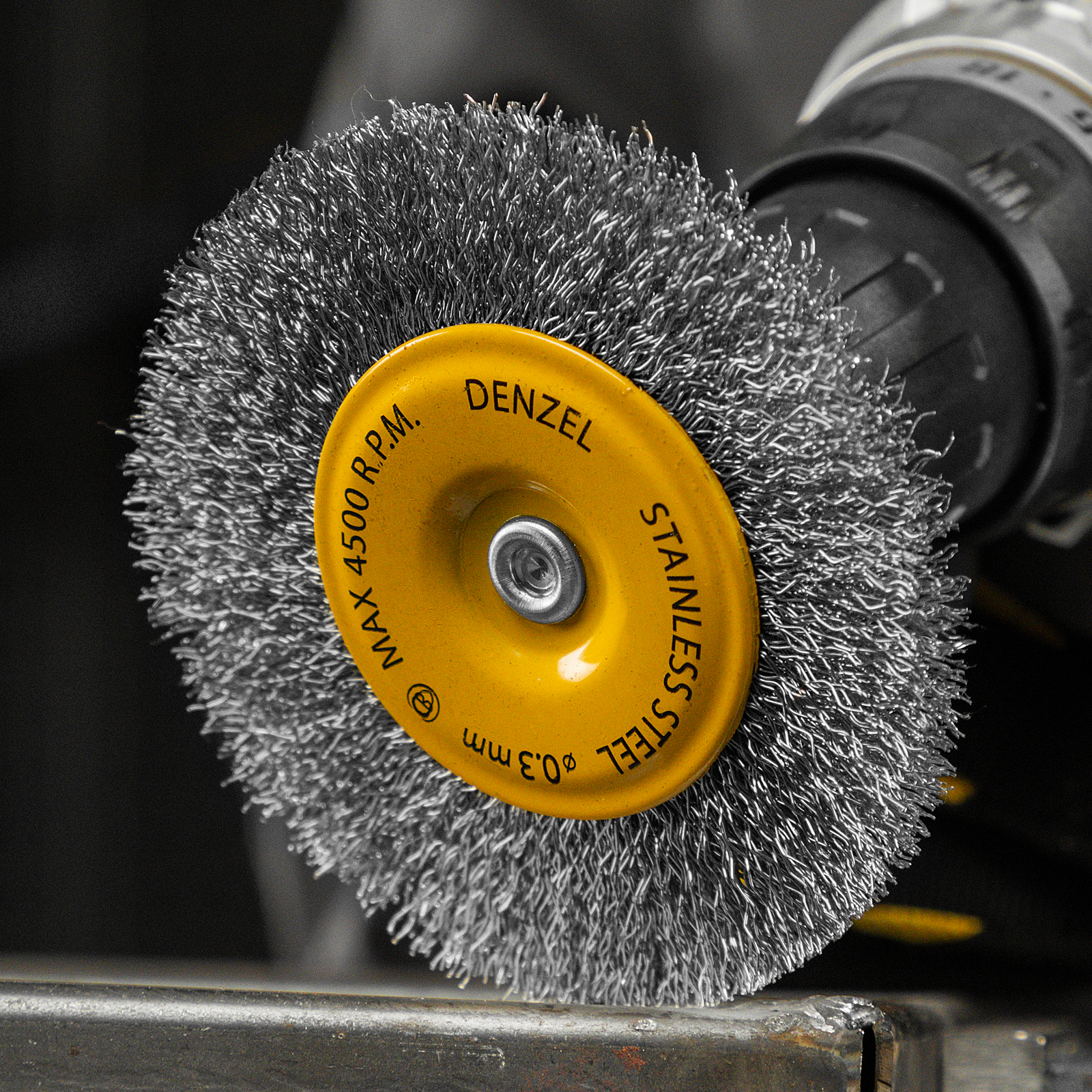 Щетка для дрели 100 мм, Плоская, со шпилькой, нержавеющая витая проволока Denzel в Краснодаре