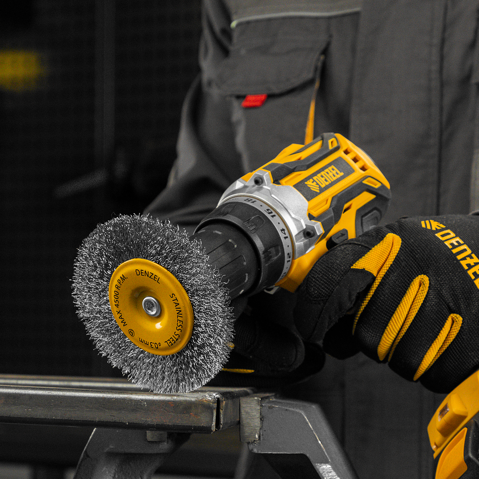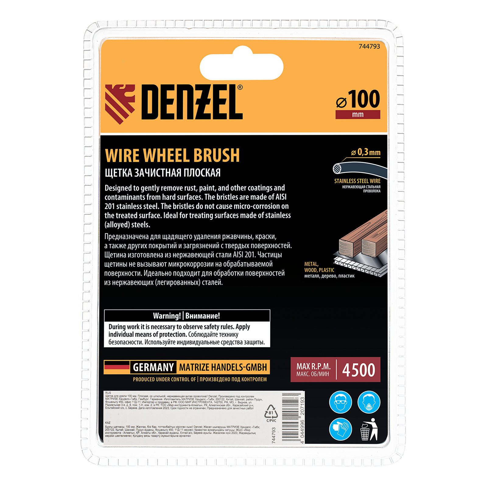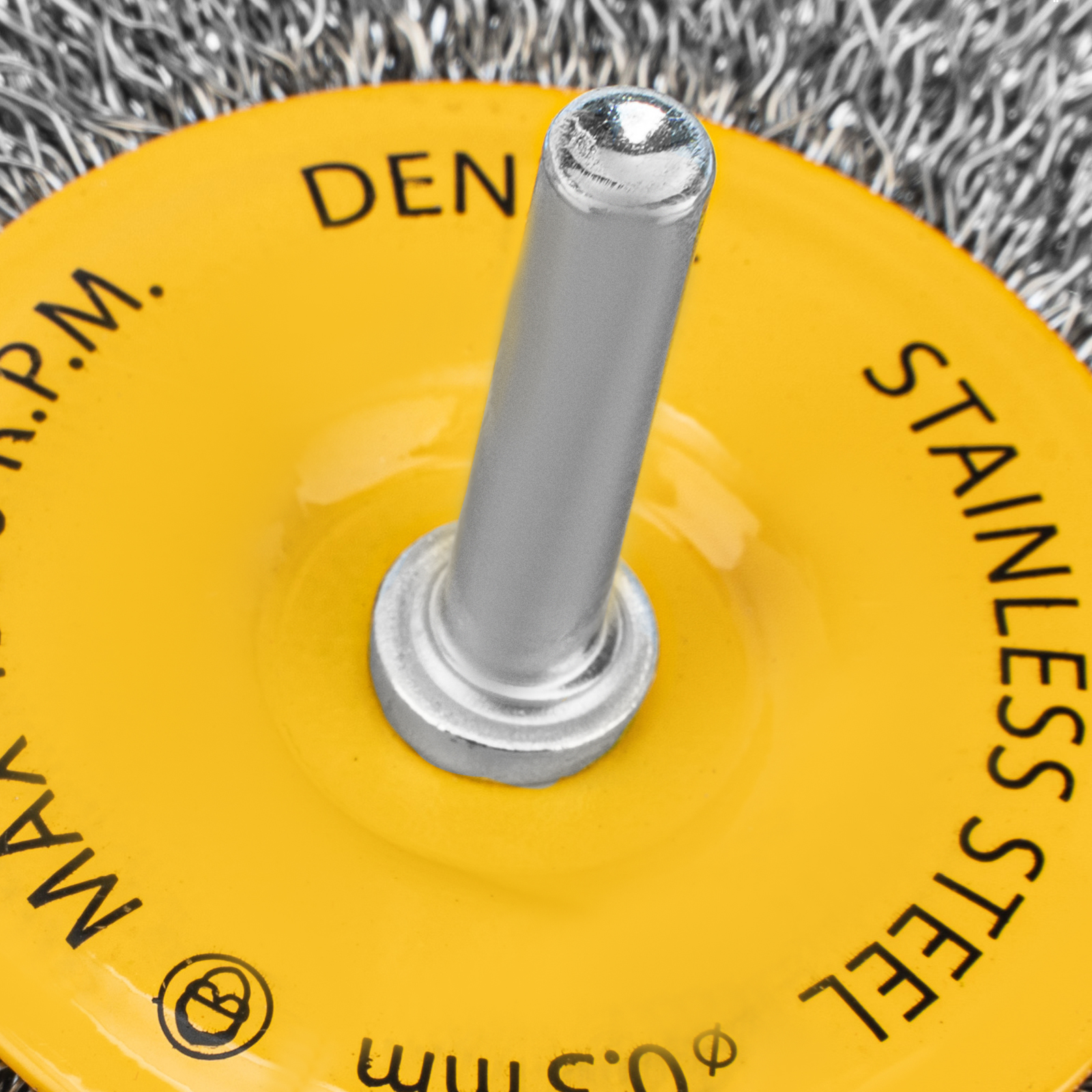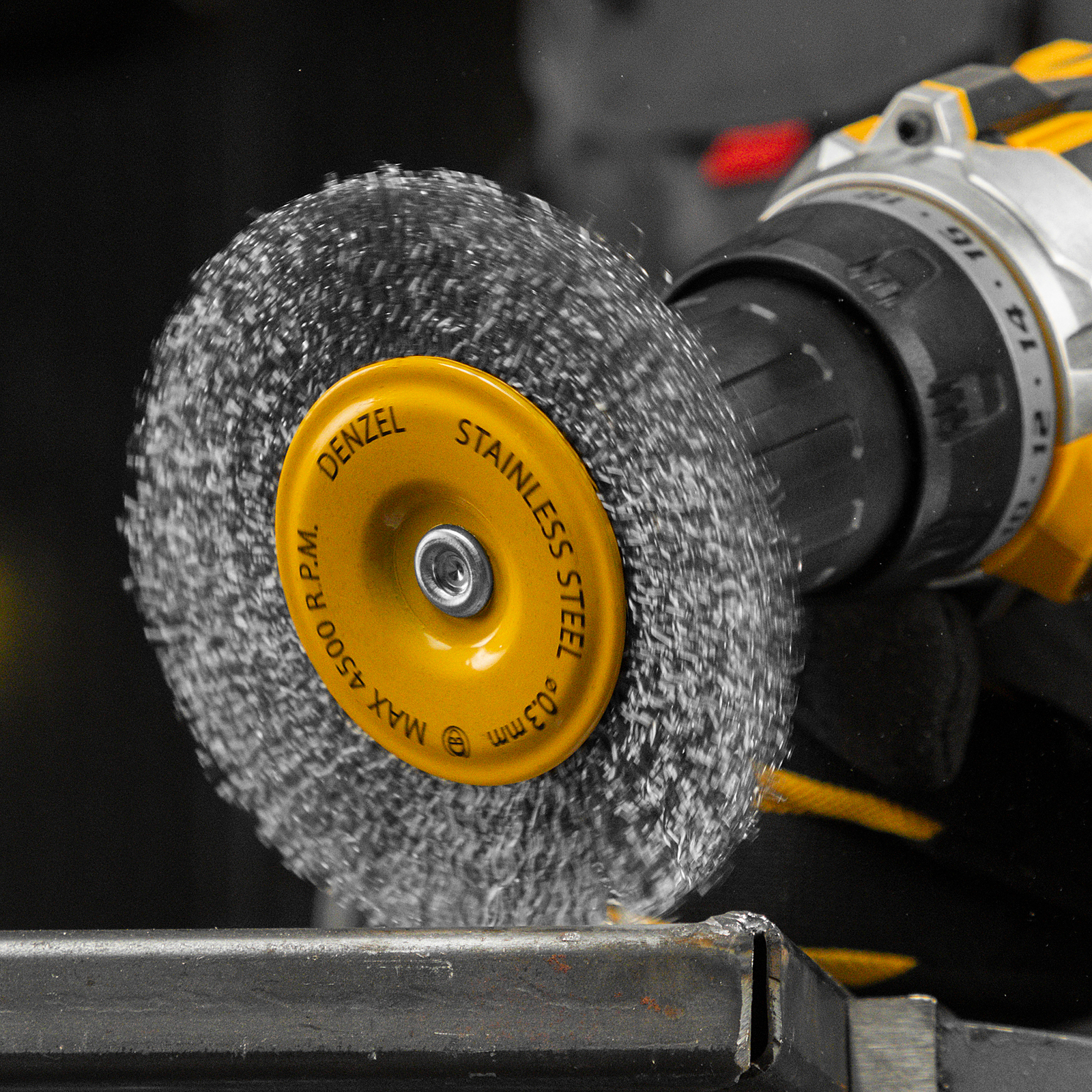 Щетка для дрели 100 мм, Плоская, со шпилькой, нержавеющая витая проволока Denzel в Краснодаре