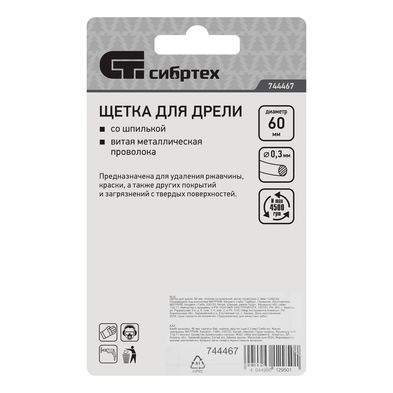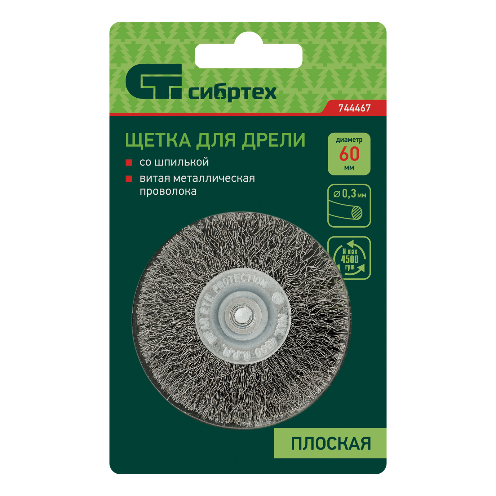Щетка для дрели, 60 мм, плоская со шпилькой, витая проволока Сибртех в Краснодаре