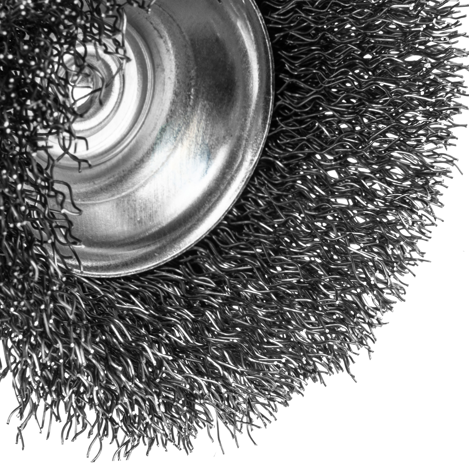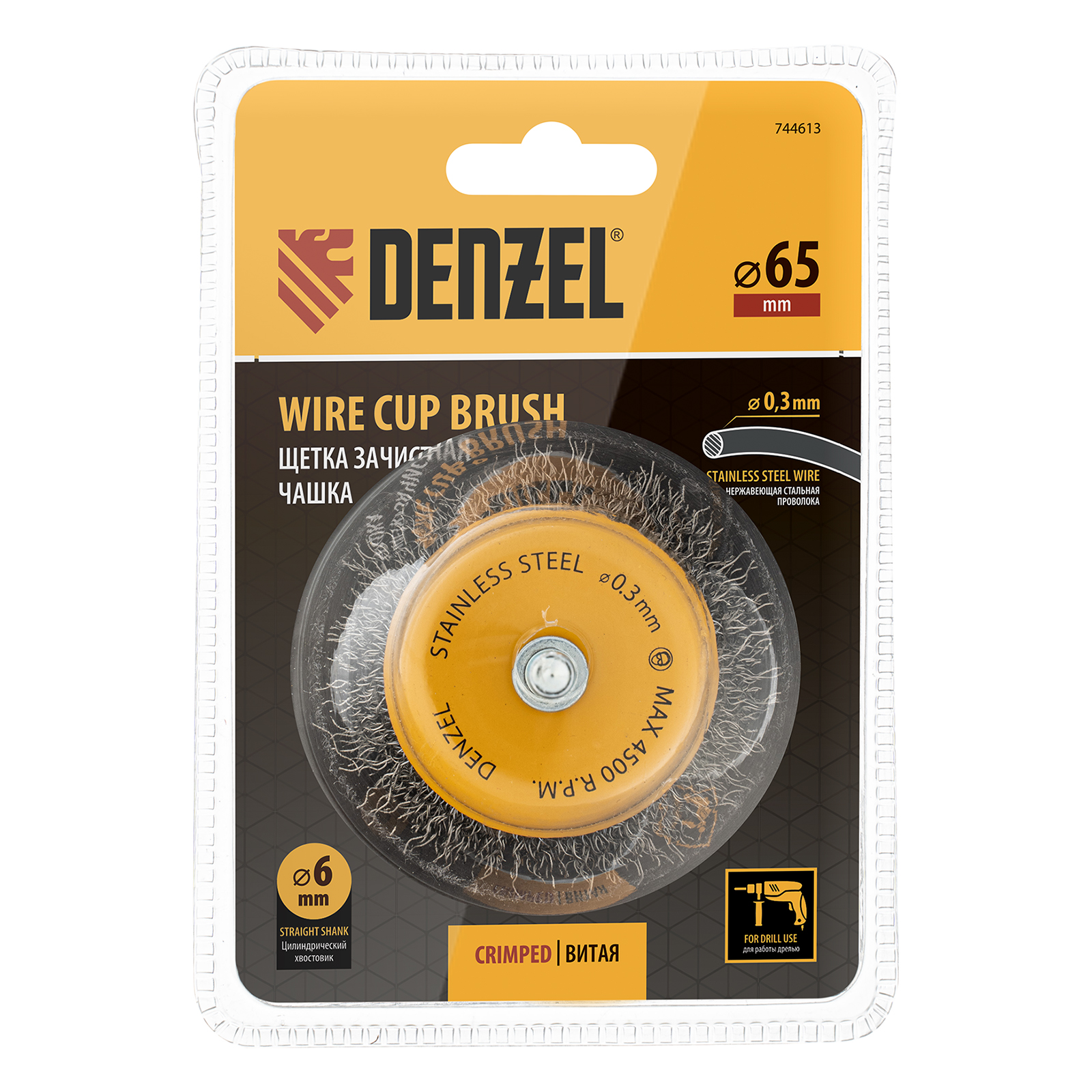 Щетка для дрели, 65 мм, Чашка, со шпилькой , нержавеющая витая проволока Denzel в Краснодаре