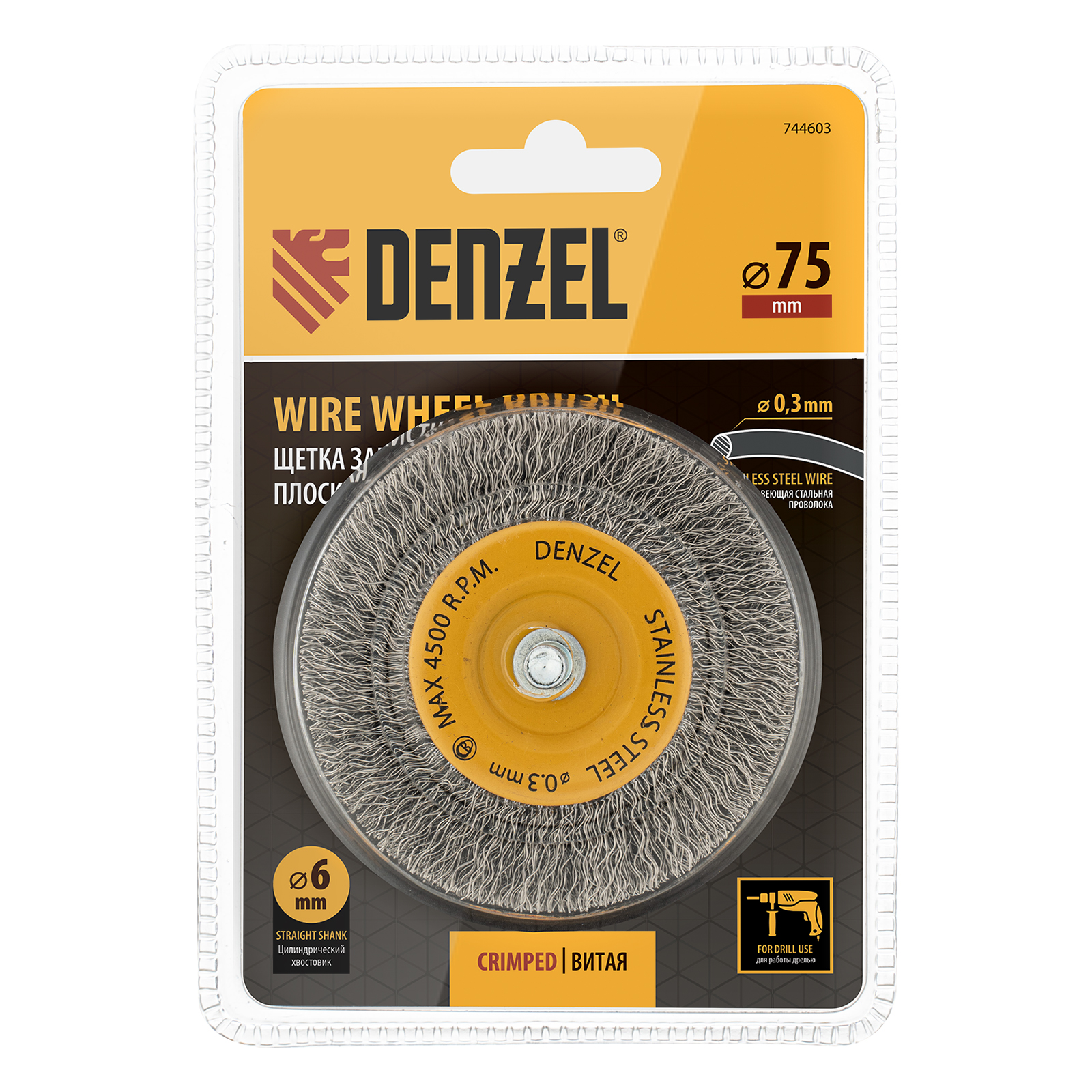 Щетка для дрели, 75 мм, Плоская, со шпилькой, нержавеющая витая проволока Denzel в Краснодаре