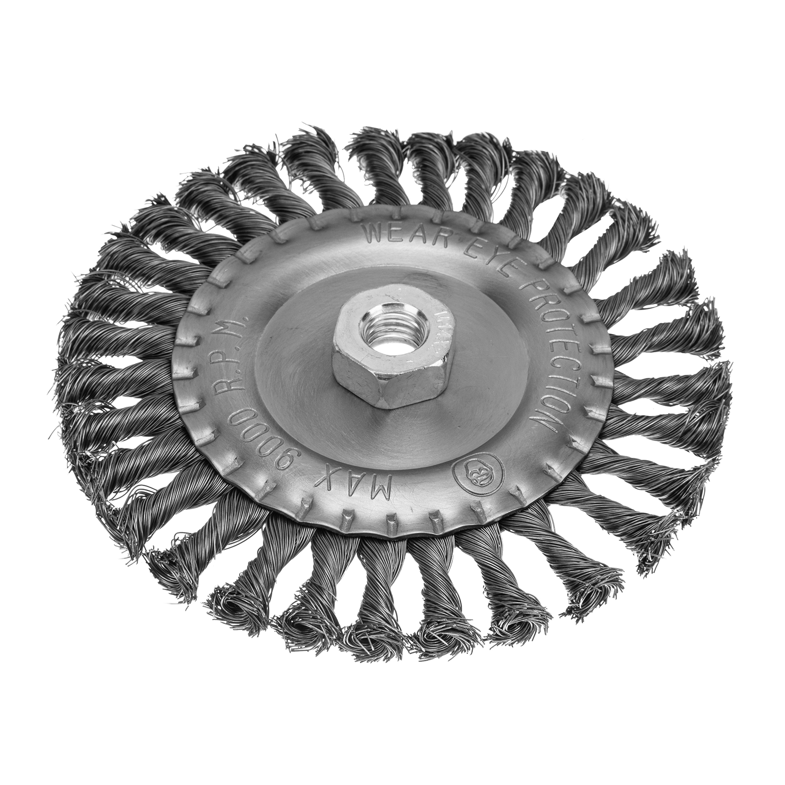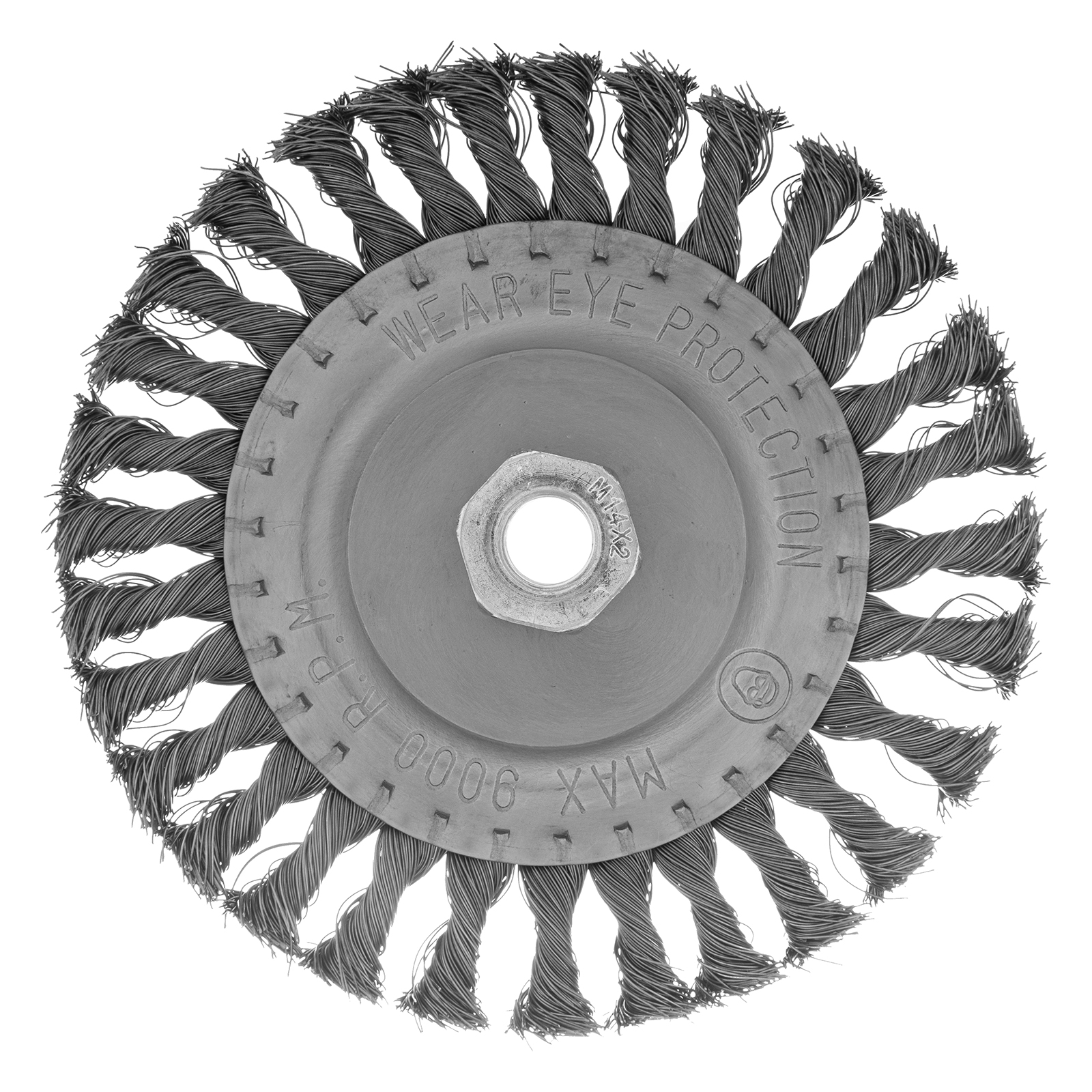 Плоская щетка Matrix 74635 диаметром 150 мм, с щетиной из крученой проволоки толщиной 0,35 мм и гайкой М14, — оснастка для УШМ, предназначенная для грубой (черновой) обработки поверхностей. Максимально допустимая скорость вращения шпинделя — 9000 об/мин. Щетка позволяет снять толстый слой ржавчины, лакокрасочных покрытий, загрязнений, а также зачистить сварные швы. Плоская форма удобна для обработки углов, изгибов и других труднодоступных мест.