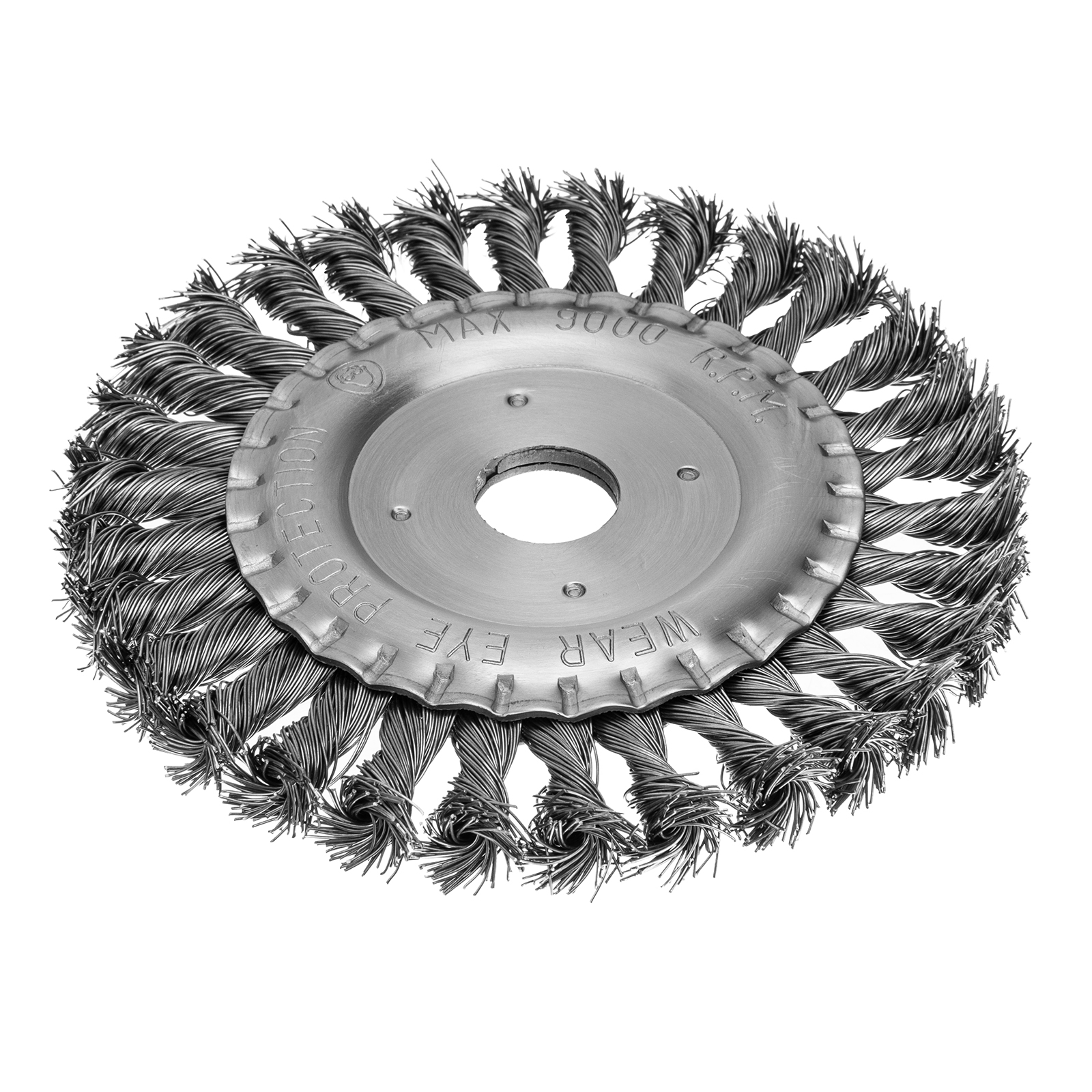 Плоская щетка Matrix 74634 диаметром 150 мм и посадкой 22,2 мм, с щетиной из крученой проволоки толщиной 0,5 мм, устанавливается на вал УШМ, поддерживающей скорость вращения не более 9000 об/мин. Эффективно удаляет загрязнения, толстый слой ржавчины и лакокрасочных материалов с поверхностей, поэтому используется для проведения грубой (черновой) обработки. Плоской щеткой удобно очищать труднодоступные места, в том числе углы и изгибы.