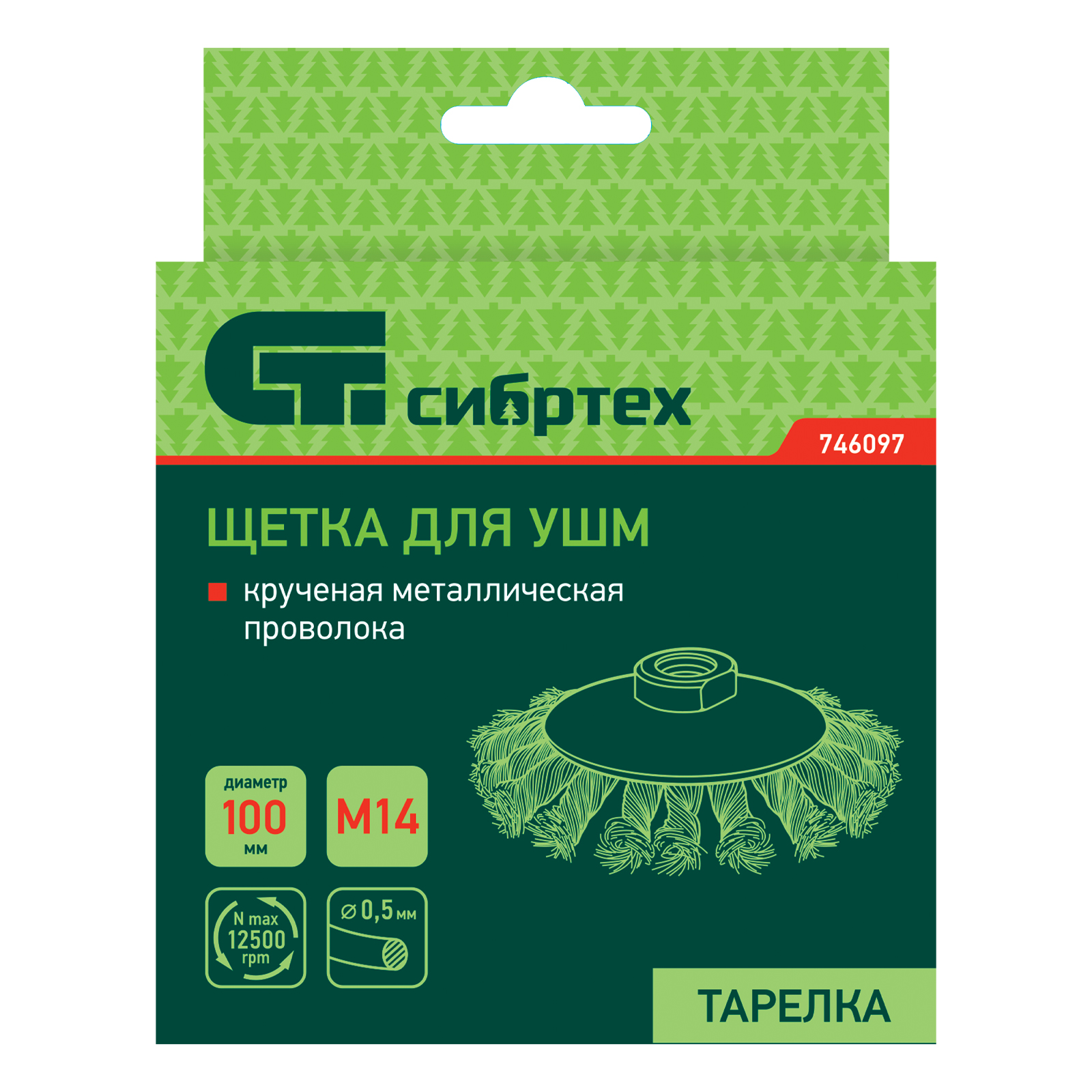 Щетка Сибртех «тарелка» 746097 диаметром 100 мм, с щетиной из крученой проволоки толщиной 0,5 мм, устанавливается на УШМ при помощи гайки М14. Выполнена в форме тарелки, за счет чего подходит для грубой (черновой) обработки плоских и угловых поверхностей. Удаляет ржавчину, загрязнения, лакокрасочные покрытия, подходит для зачистки сварных швов. Использование на скорости до 12500 об/мин позволяет продлить срок службы насадки.