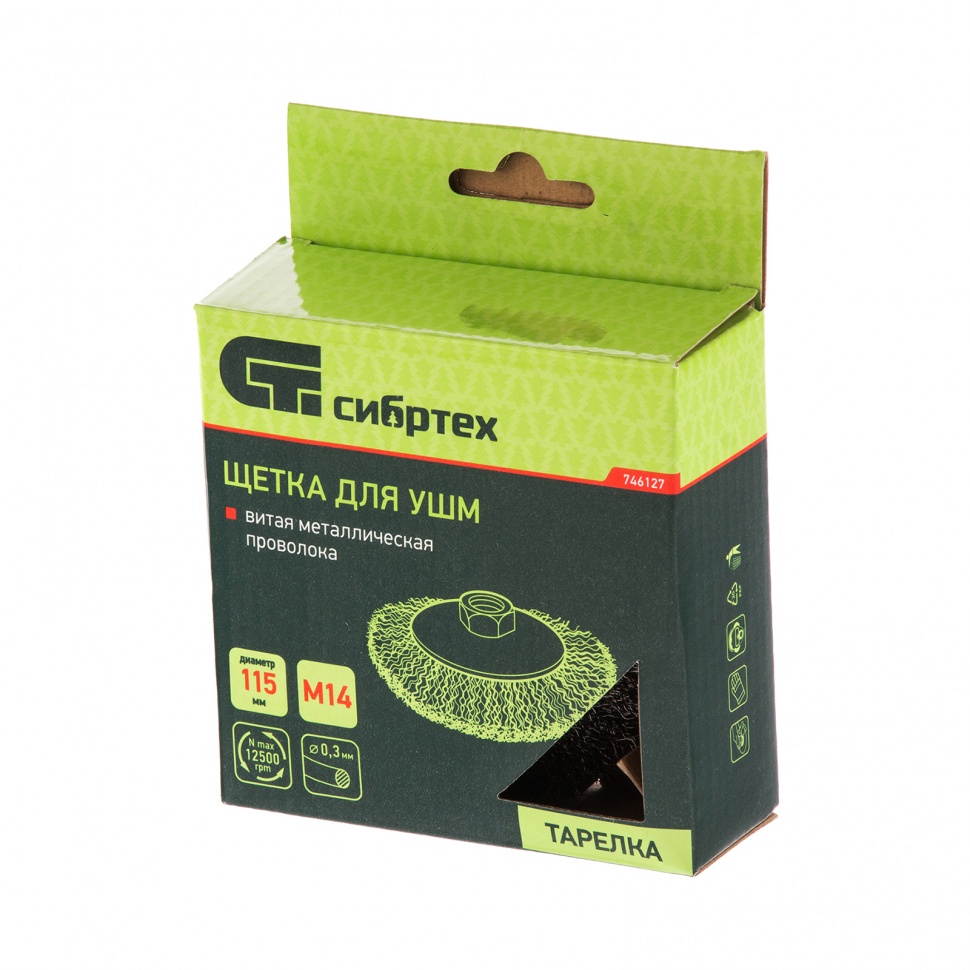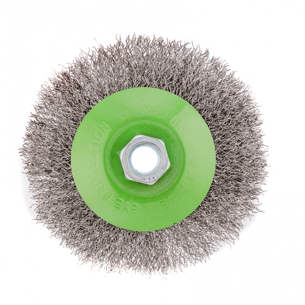 Щетка для УШМ «Тарелка» Сибртех 746127, М14, 115 мм, с щетиной из витой проволоки толщиной 0,3 мм, применяется для очистки металлических, деревянных и пластиковых поверхностей от ржавчины, старых лакокрасочных покрытий и загрязнений. Очищает как плоскости, так и труднодоступные места, поэтому оптимальна для обработки изделий сложной формы. Подходит для придания материалу шероховатости и матовости. Щетка устанавливается на вал углошлифовальной машины и выдерживает вращение со скоростью до 12500 об/мин, что обеспечивает высокую производительность оснастки. Во время работы следует использовать средства индивидуальной защиты. Щетка пригодится для проведения ремонта и решения бытовых задач.