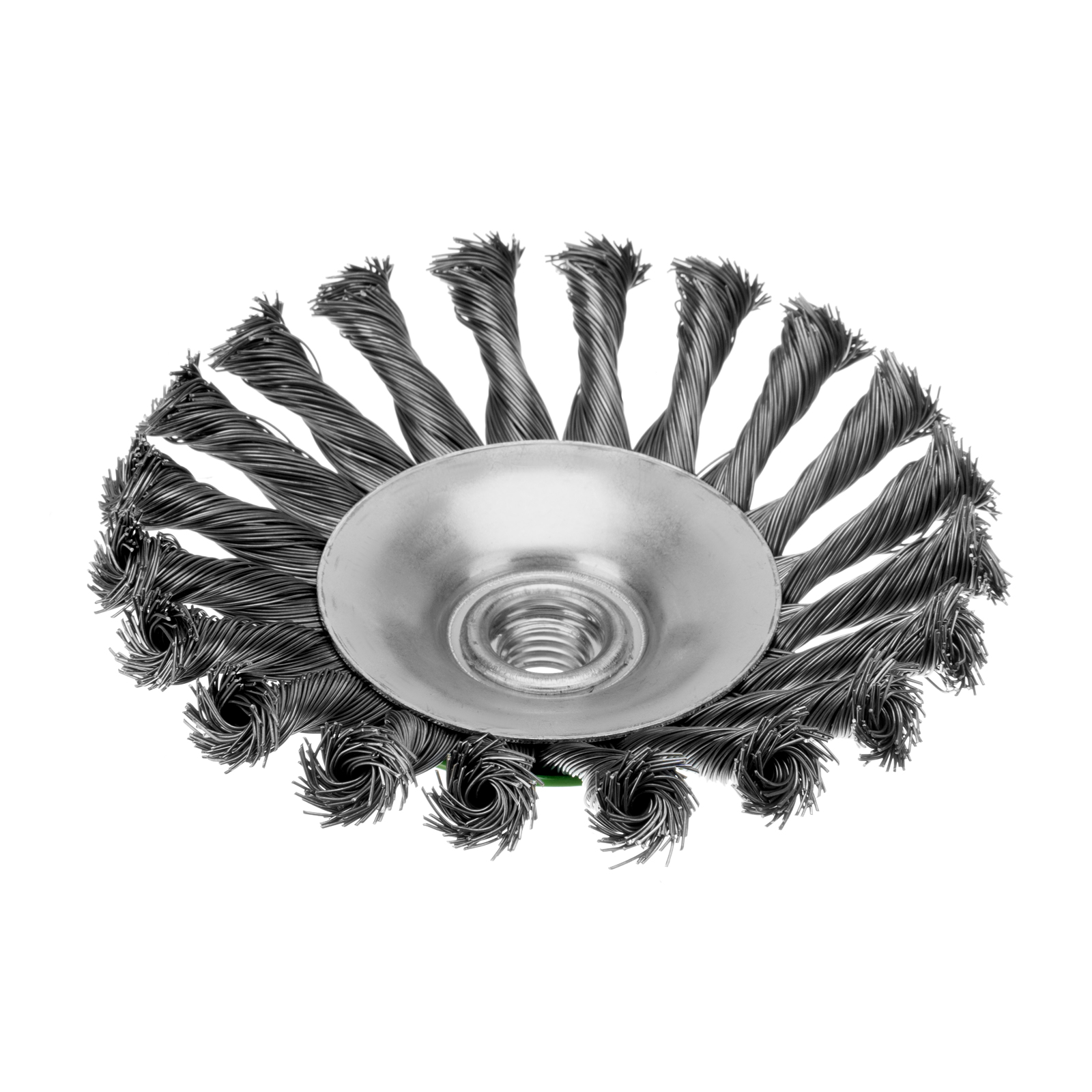 Щетка Сибртех «тарелка» 746117 диаметром 125 мм, с щетиной из крученой проволоки толщиной 0,5 мм, устанавливается на УШМ при помощи гайки М14. Выполнена в форме тарелки, за счет чего подходит для грубой (черновой) обработки плоских и угловых поверхностей. Удаляет ржавчину, загрязнения, лакокрасочные покрытия, подходит для зачистки сварных швов. Использование на скорости до 12500 об/мин позволяет продлить срок службы насадки.