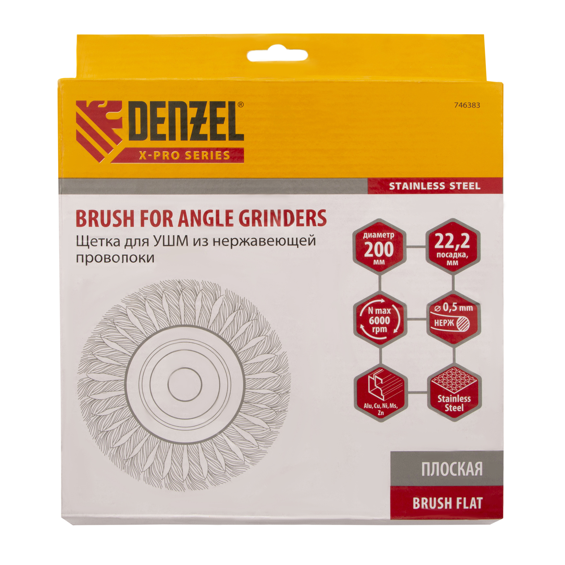 Плоская щетка для УШМ Denzel 746383 диаметром 200 мм, с посадкой 22,2 мм, с щетиной из крученой нержавеющей проволоки 0,5 мм, предназначена для снятия толстого верхнего слоя с металлических, деревянных, бетонных поверхностей. Удаляет загрязнения, ржавчину, старые лакокрасочные покрытия, заусенцы, окалину с ровных поверхностей и в труднодоступных местах. Оптимальна для обработки изделий из нержавеющей стали, а также зачистки сварных швов. Щетку устанавливают на фланец углошлифовальной машины, что удобно для выполнения большого объема работ, не требующих частой смены насадок. Рекомендуемая максимальная скорость вращения 6000 об/мин. Во время работы обязательно использование средств индивидуальной защиты. Щетка будет полезна на строительной площадке, производственном предприятии, а также пригодится в быту.