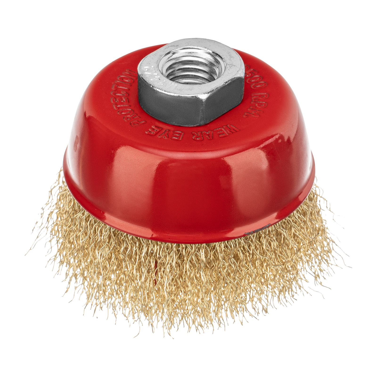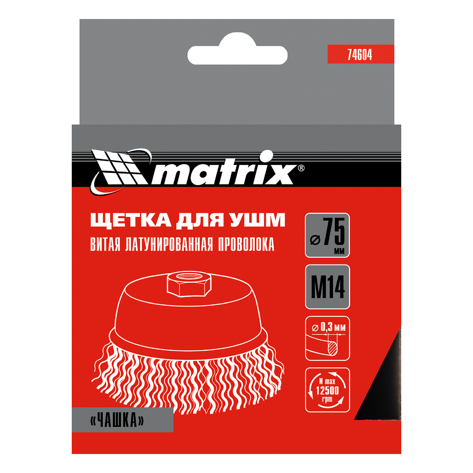 Щетка «чашка» Matrix 74604 диаметром 75 мм, с щетиной из латунированной витой проволоки, устанавливается на вал УШМ с помощью гайки М14. Предназначена для снятия тонкого слоя краски или лака, удаления ржавчины и загрязнений. При рекомендованной скорости вращения 12500 об/мин щеткой можно быстро обрабатывать участки большой площади.
