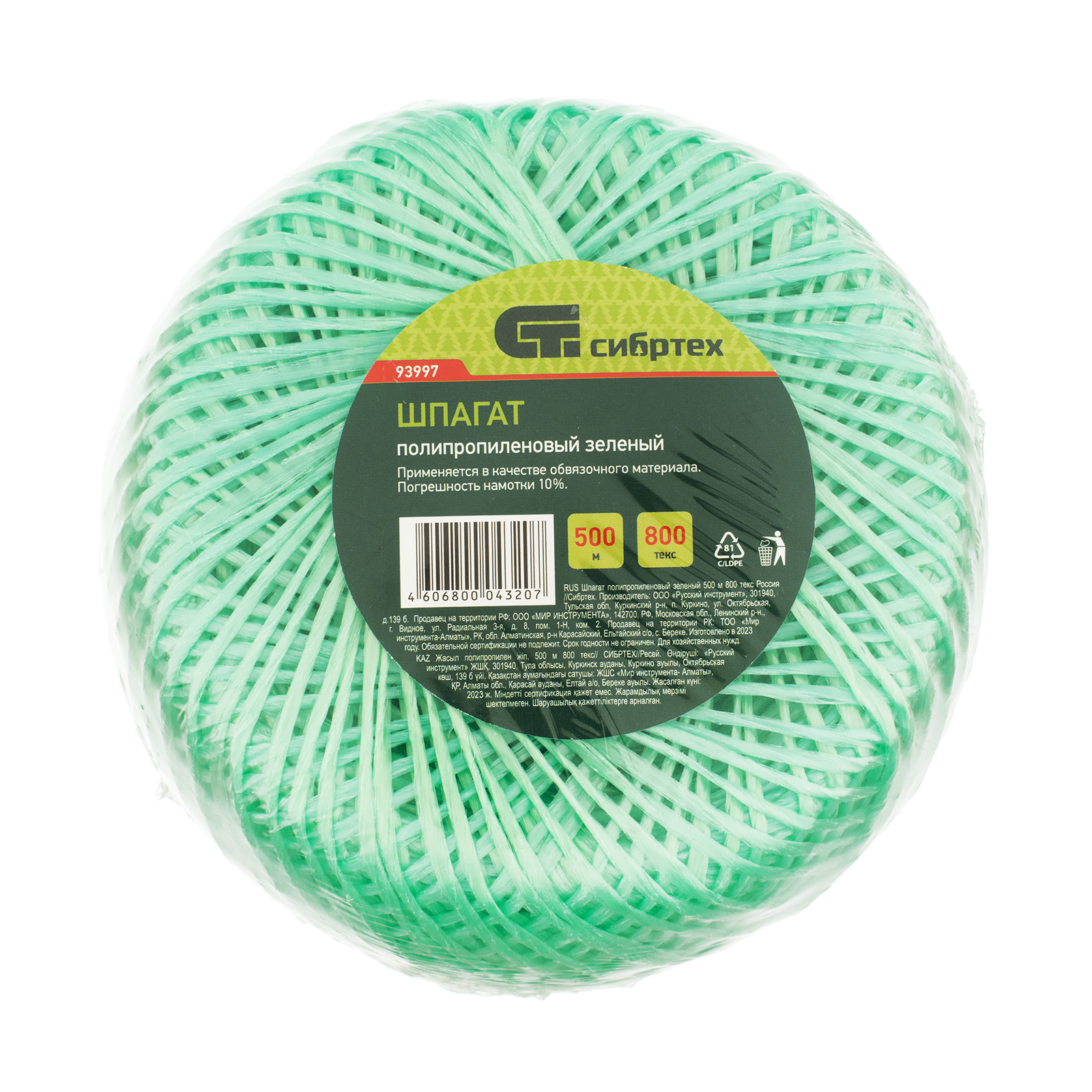 Шпагат полипропиленовый зеленый, 1.4 мм, L 500, Сибртех в Краснодаре