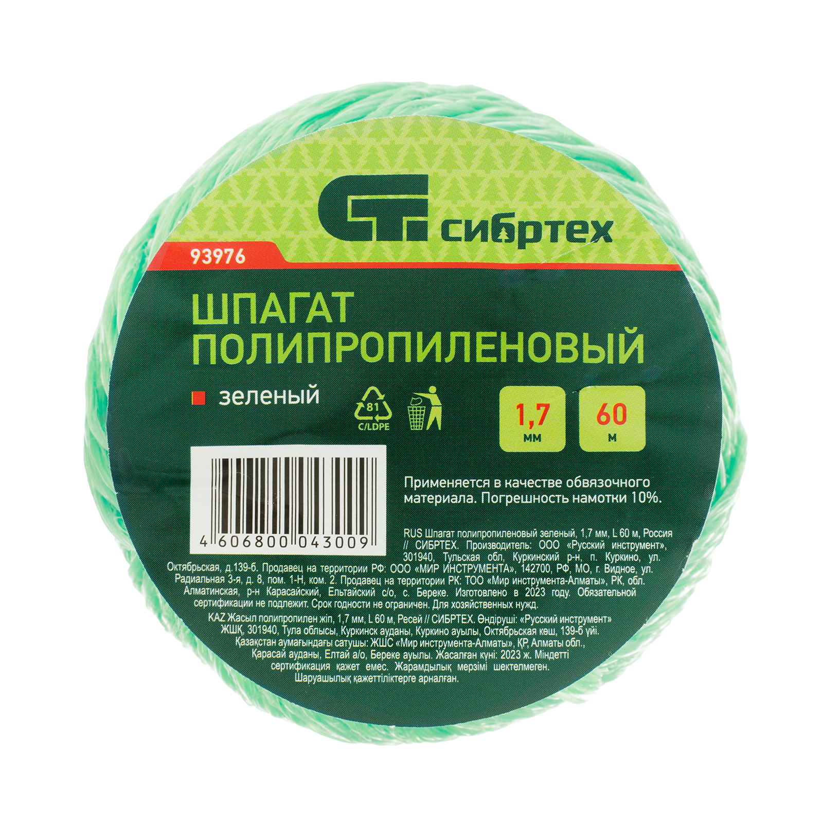 Шпагат полипропиленовый зеленый, 1.7 мм, L 60 м, Сибртех в Краснодаре