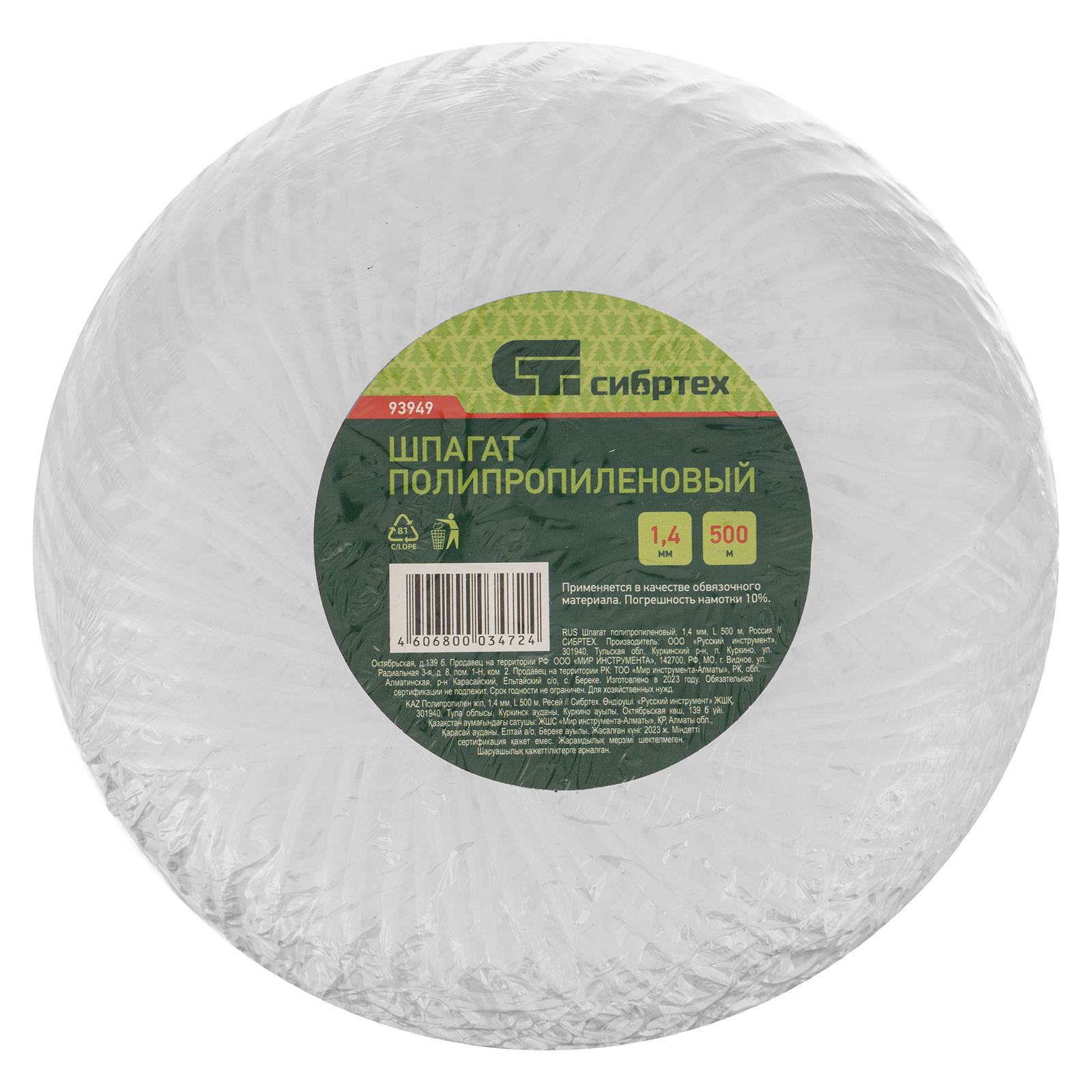 Шпагат полипропиленовый, 1.4 мм, L 500 м, Сибртех в Краснодаре