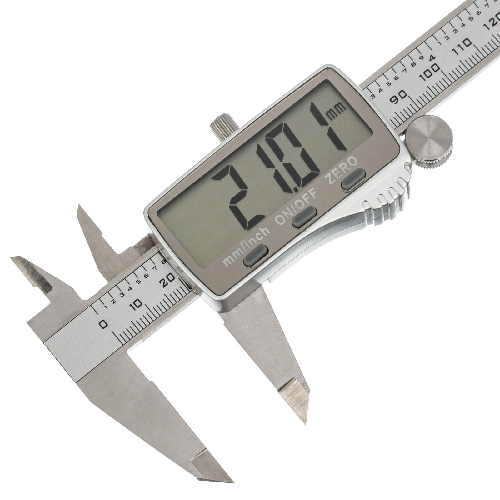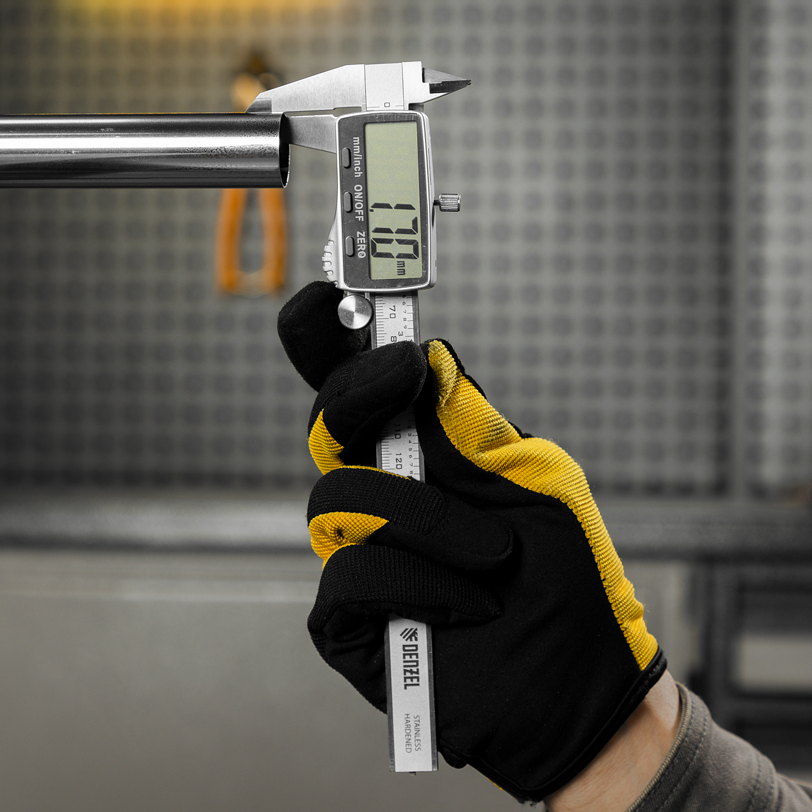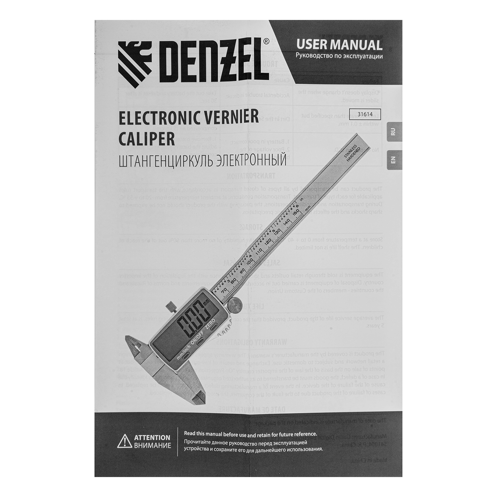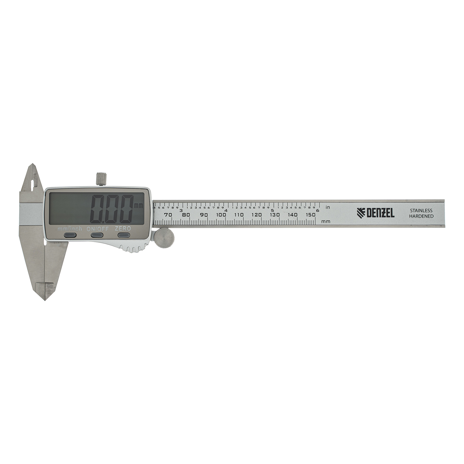 Электронный штангенциркуль Denzel 31614 со шкалой длиной 150 мм, с большим дисплеем и глубиномером, позволяет определять внутренние и внешние размеры различных деталей. Цена деления составляет 0,01 мм. Штангенциркуль позволяет получать результаты высокой точности: погрешность составляет ±0,02 мм при измерении размеров до 100 мм, и ±0,03 мм — до 150 мм. Двустороннее положение губок облегчает проведение работ. Инструмент пригодится на производстве, в мастерской, гараже, а также будет полезен в быту.