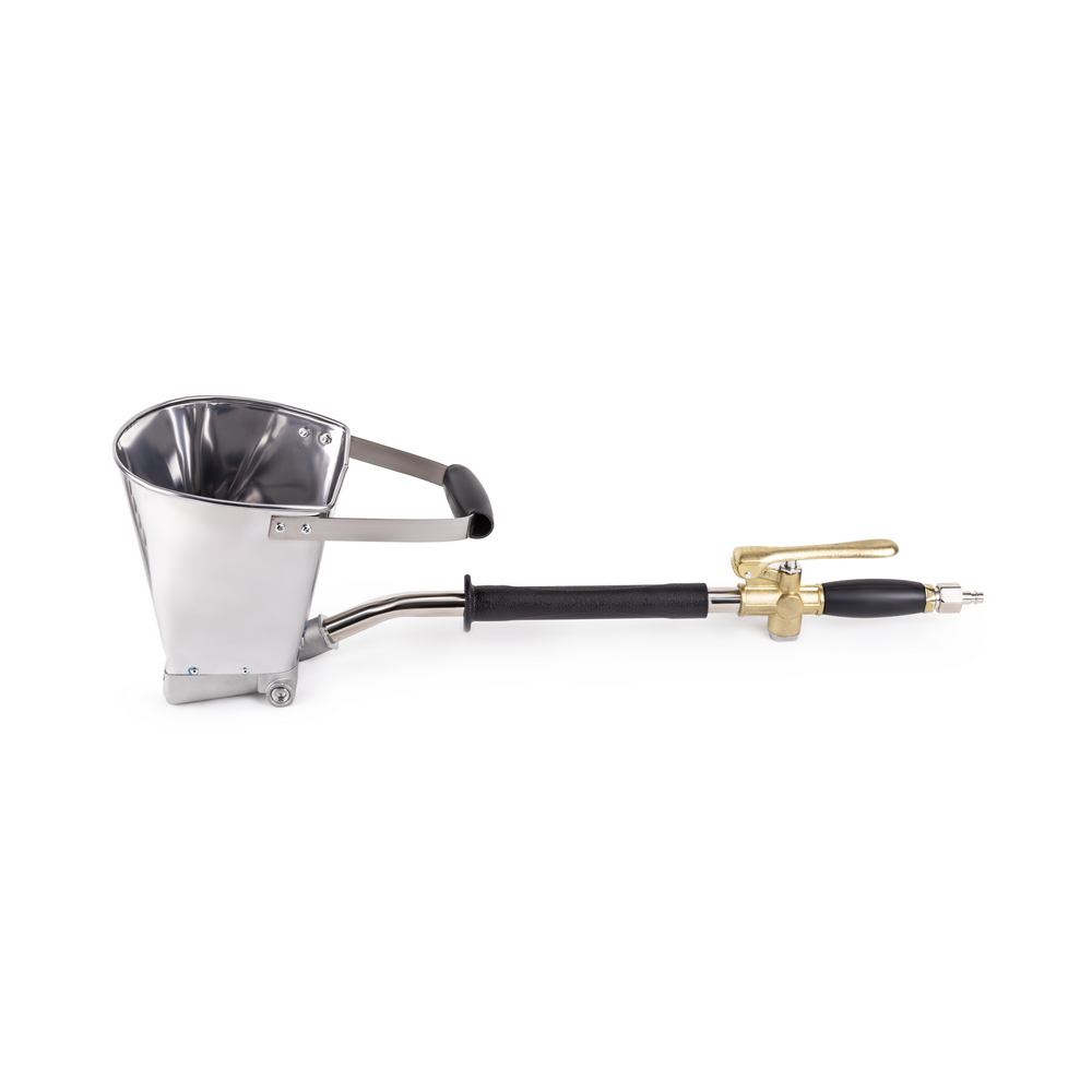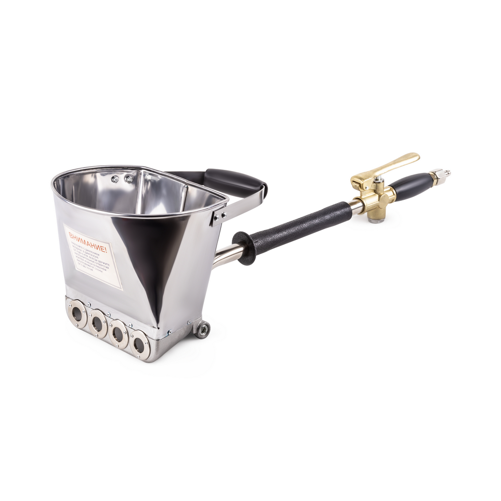 Штукатурный хоппер ковш стеновой AEROMAX WAH-02 предназначен для быстрого нанесения штукатурных растворов на стены и вертикальные поверхности, работа осуществляется через компрессор с постоянным давлением. Благодаря технологии нанесения штукатурки с помощью хоппер ковша, расход смеси значительно сокращается, за счет улучшения адгезии раствора и нанесения его тонким слоем, что уменьшает затраты на используемые материалы. К тому же, значительно ускоряется и облегчается рабочий процесс. Эксплуатация не требует особых навыков или квалификации. В процессе работы возможно внесение в раствор добавок и фибры. Инструмент подключается к воздушному компрессору с объемом ресивера 50-100 л и производительностью не менее 300 л/мин с помощью шланга с оптимальным внутренним диаметром в 14 мм, фиксируемым хомутами или муфтами GEKA обеспечивающими минимальные потери по расходу воздуха. Изделие имеет оптимальную для быстрой работы емкость ковша из нержавеющей стали в 3,5 л. Ковш оснащен 4-мя интегрированными соплами диаметром 20 мм которые обеспечиваю беспрепятственный выброс смеси при помощи сжатого воздуха. Прорезиненная рукоятка с удобным хватом и большой диаметр штанги обеспечивают лучшее удержание и меньшую утомляемость. Скорость обработки поверхностей при соблюдении всех требований с помощью данной технологии составляет до 30-50 кв. метров в час.