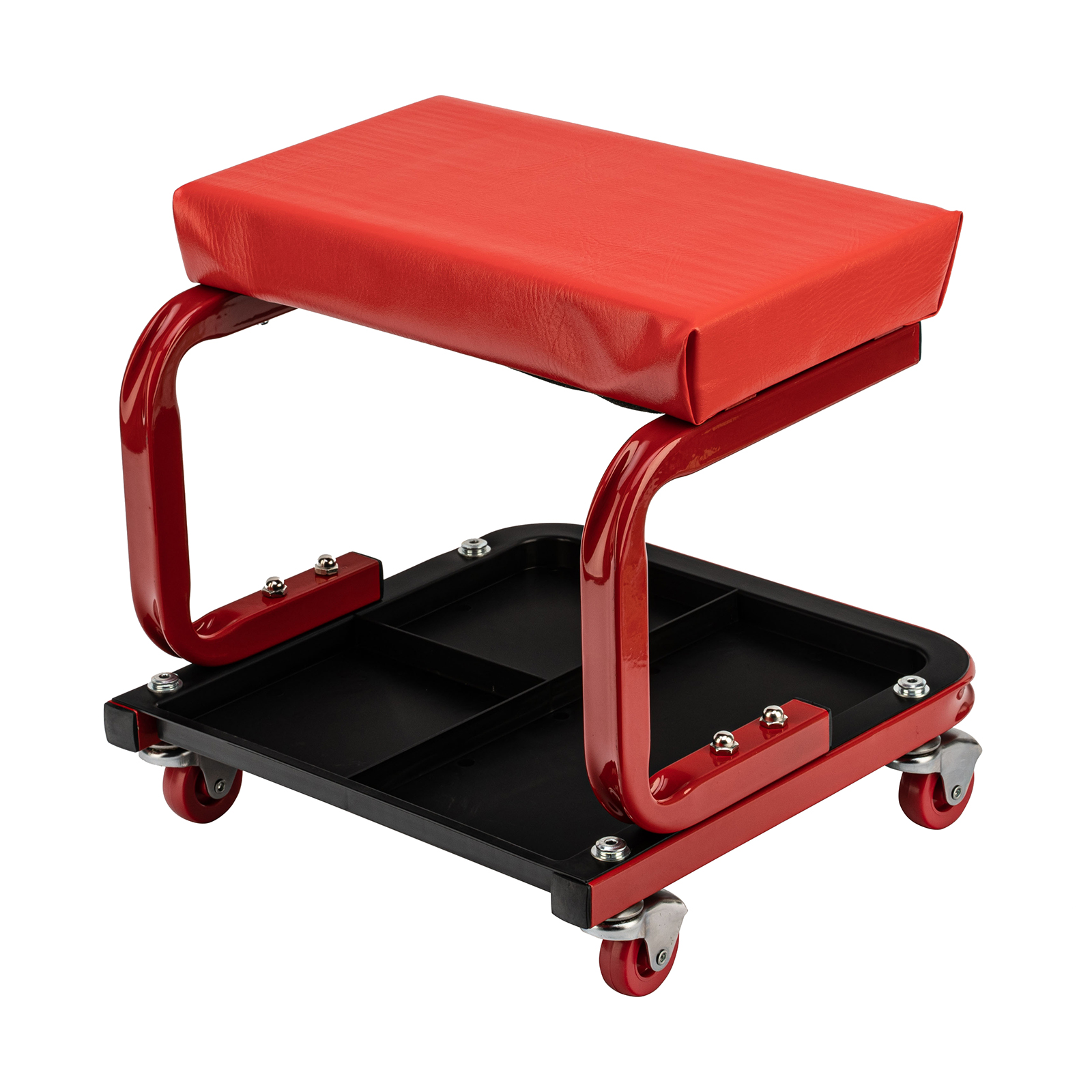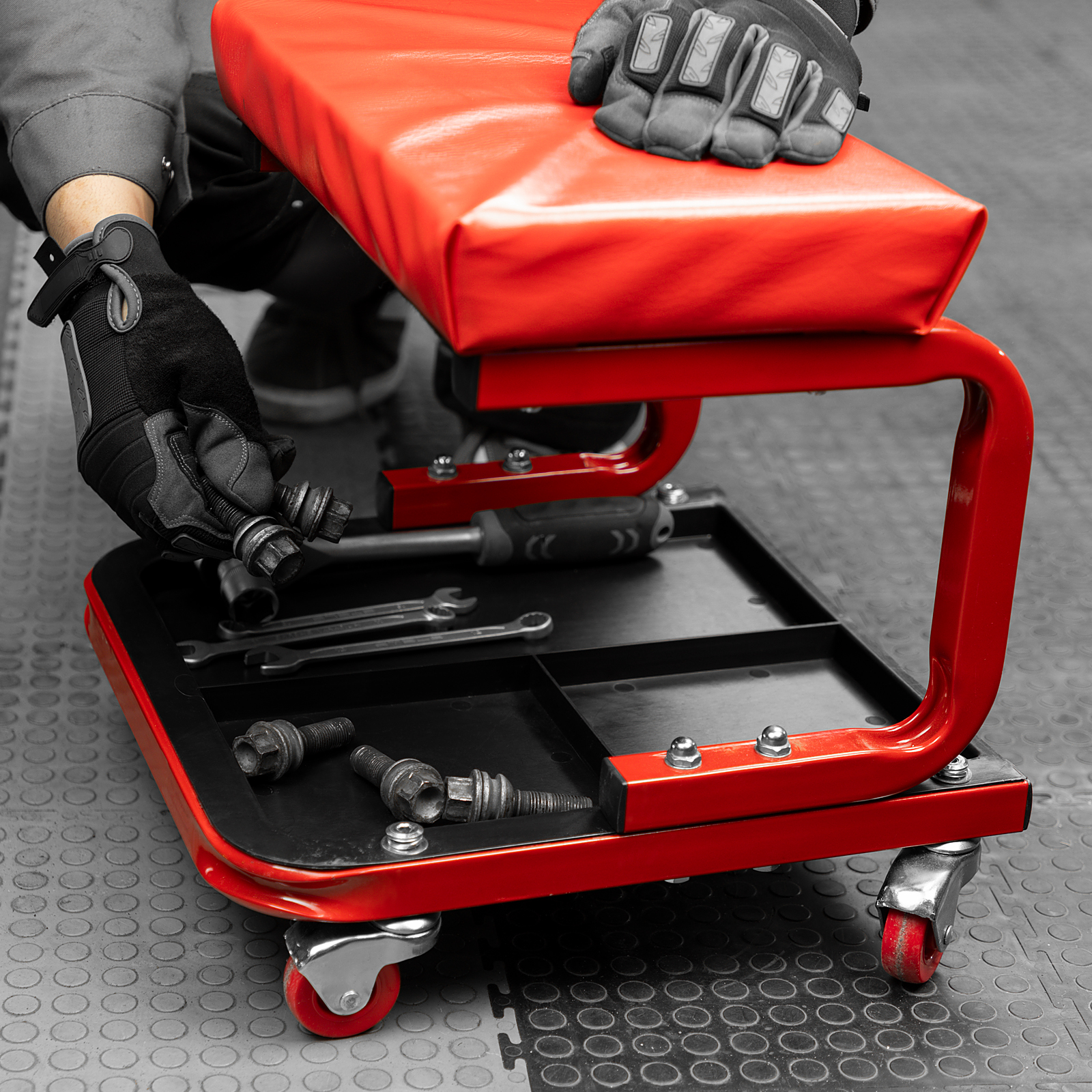 - На сиденье предусмотрены 4 колеса с углом поворота на 360°, поэтому можно с удобством перемещаться по гаражу.