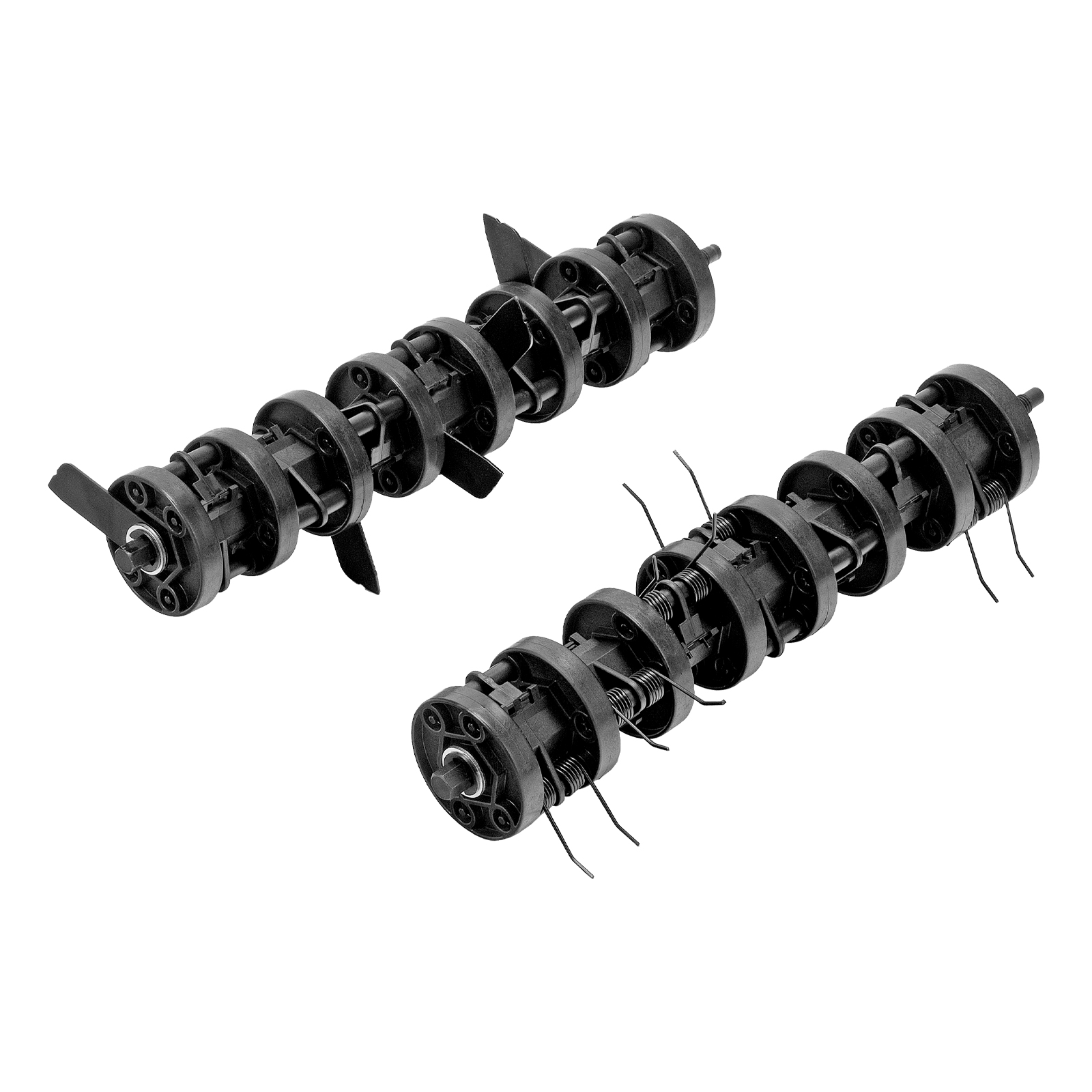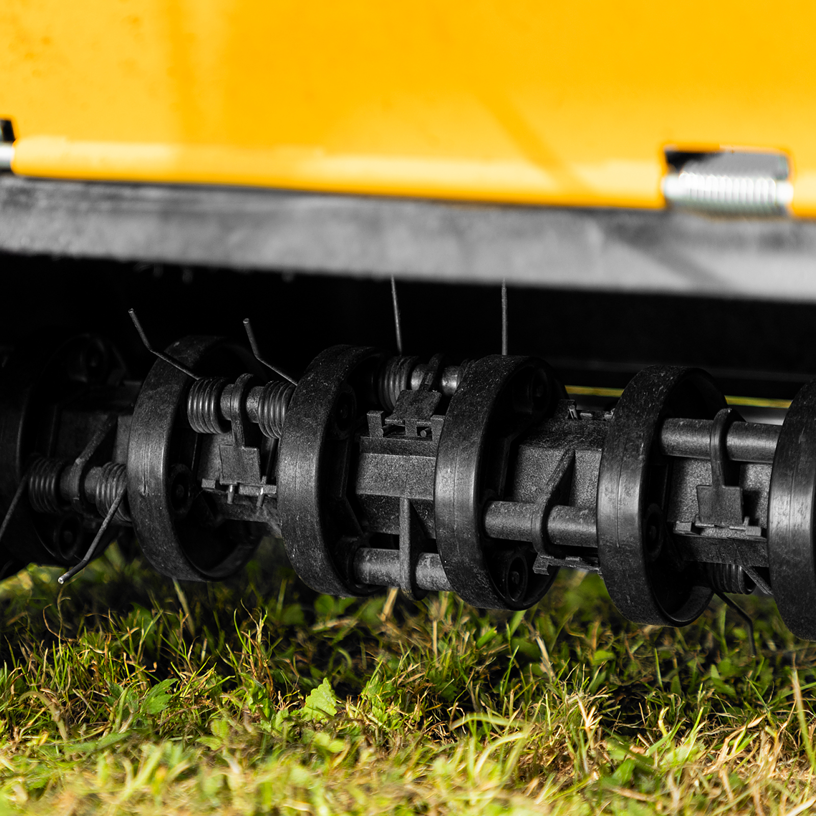 В комплект поставки включены сразу 3 насадки: 2 вала с пружинами и 1 вал с ножами. Вал с пружинами обеспечивает удаление сухой травы, мха и мелкого мусора с поверхности газона непосредственно перед аэрацией ножами, при этом не меняет структуру почвы и не причиняет вреда растениям. Вал с ножами деликатно прорезает поверхность газона, обеспечивая приток воздуха и влаги к корням растений.