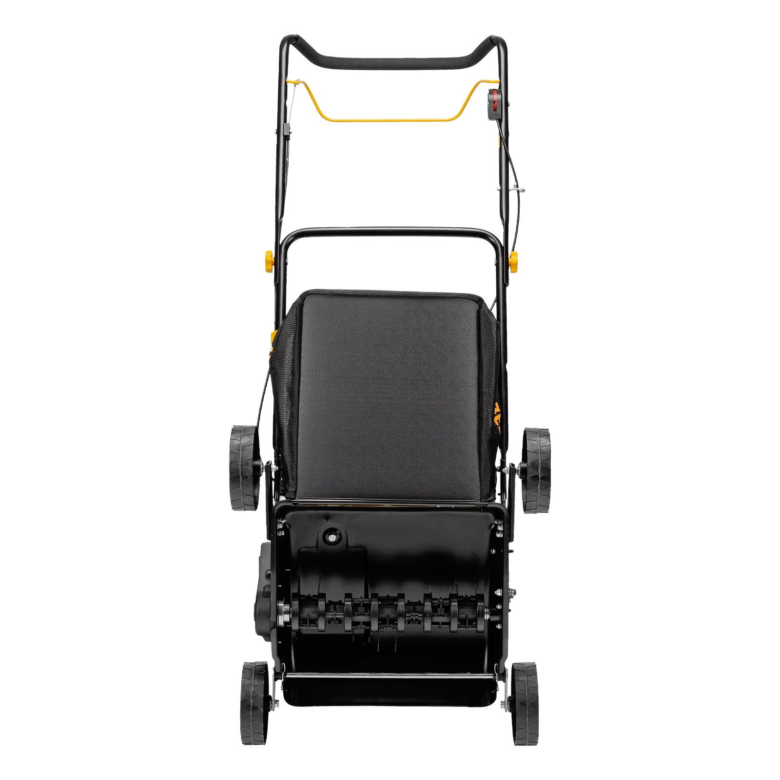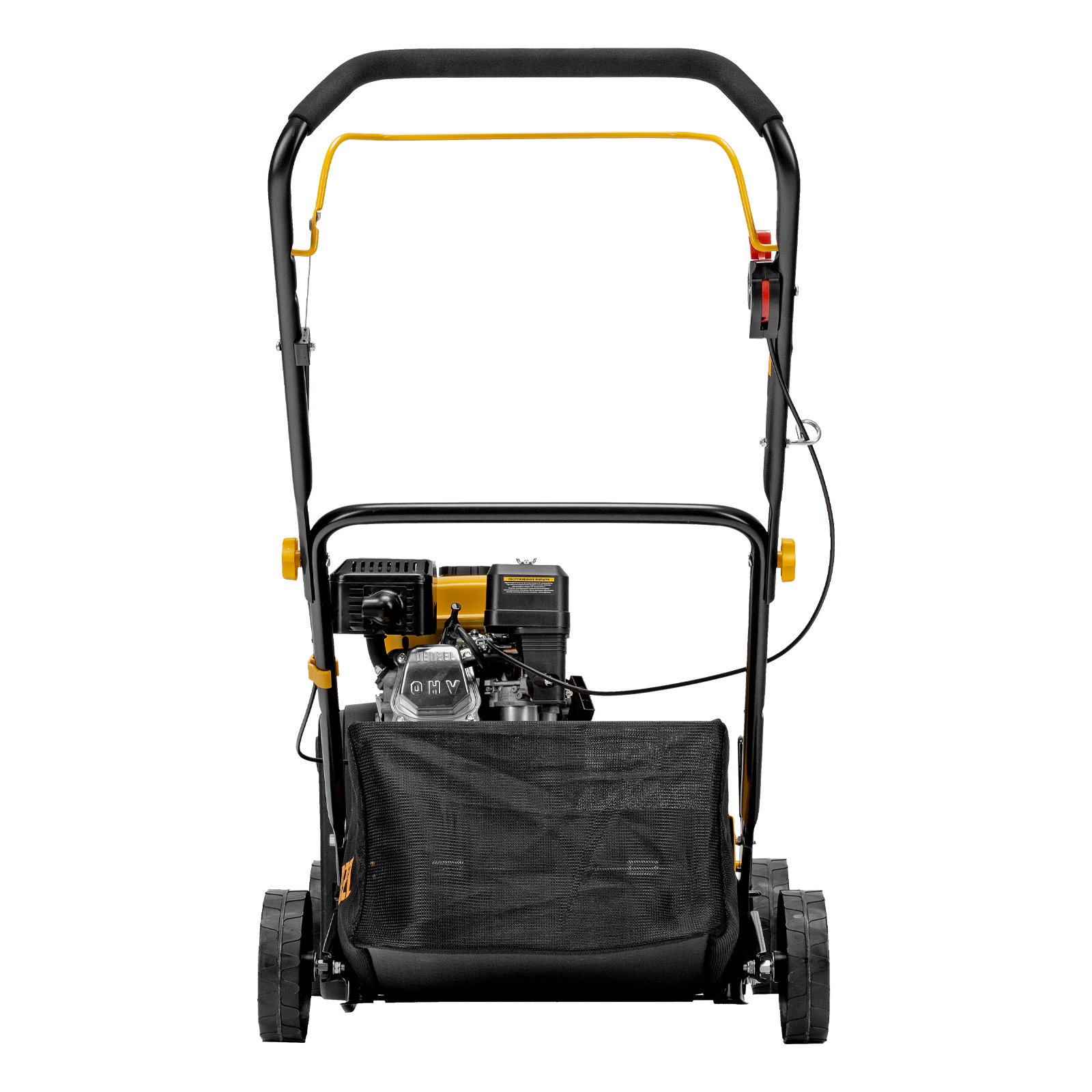 - Вместительный травосборник объемом 30 л — сетчатая ткань позволяет легко отслеживать количество собранной травы и мусора и легко очищается.