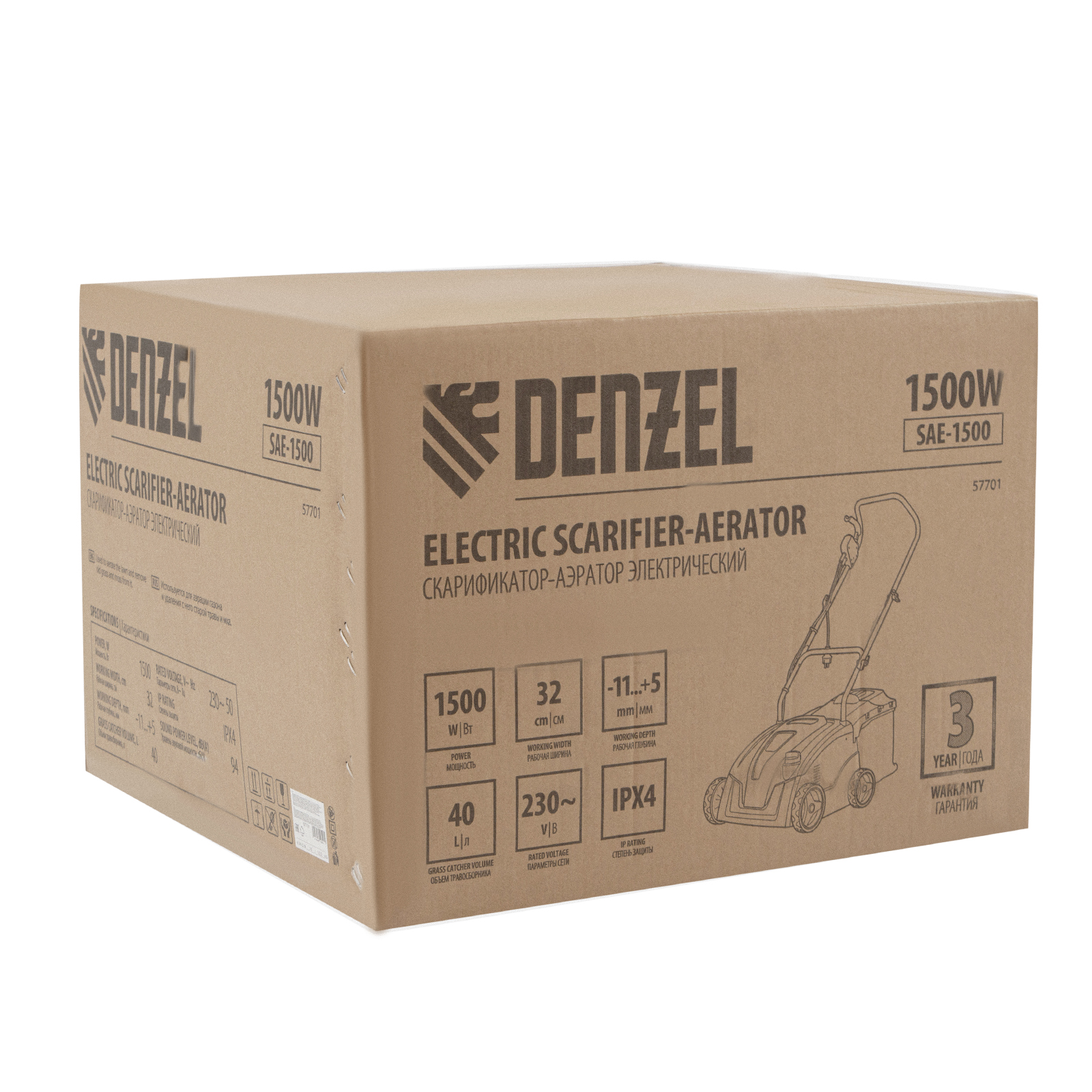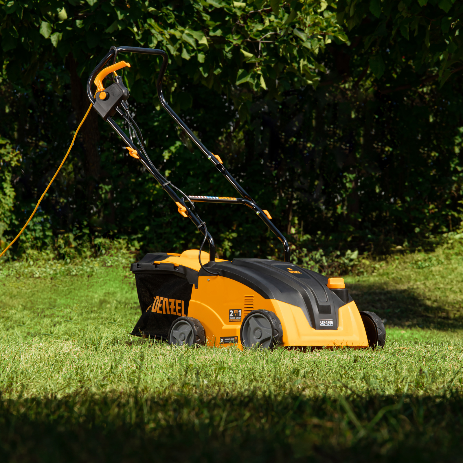 Электрический скарификатор-аэратор Denzel SAE-1500 57701 мощностью 1500 Вт обеспечивает ширину обработки 32 см, глубину -11/+5 мм и предназначен для ухода за газоном: удаления сухой травы, мха и мусора, а также прорезания дерна и обеспечения притока воздуха к корневой системе растений. Скорость вращения вала составляет 4000 об/мин, этого достаточно для эффективной обработки придомовой территории.
