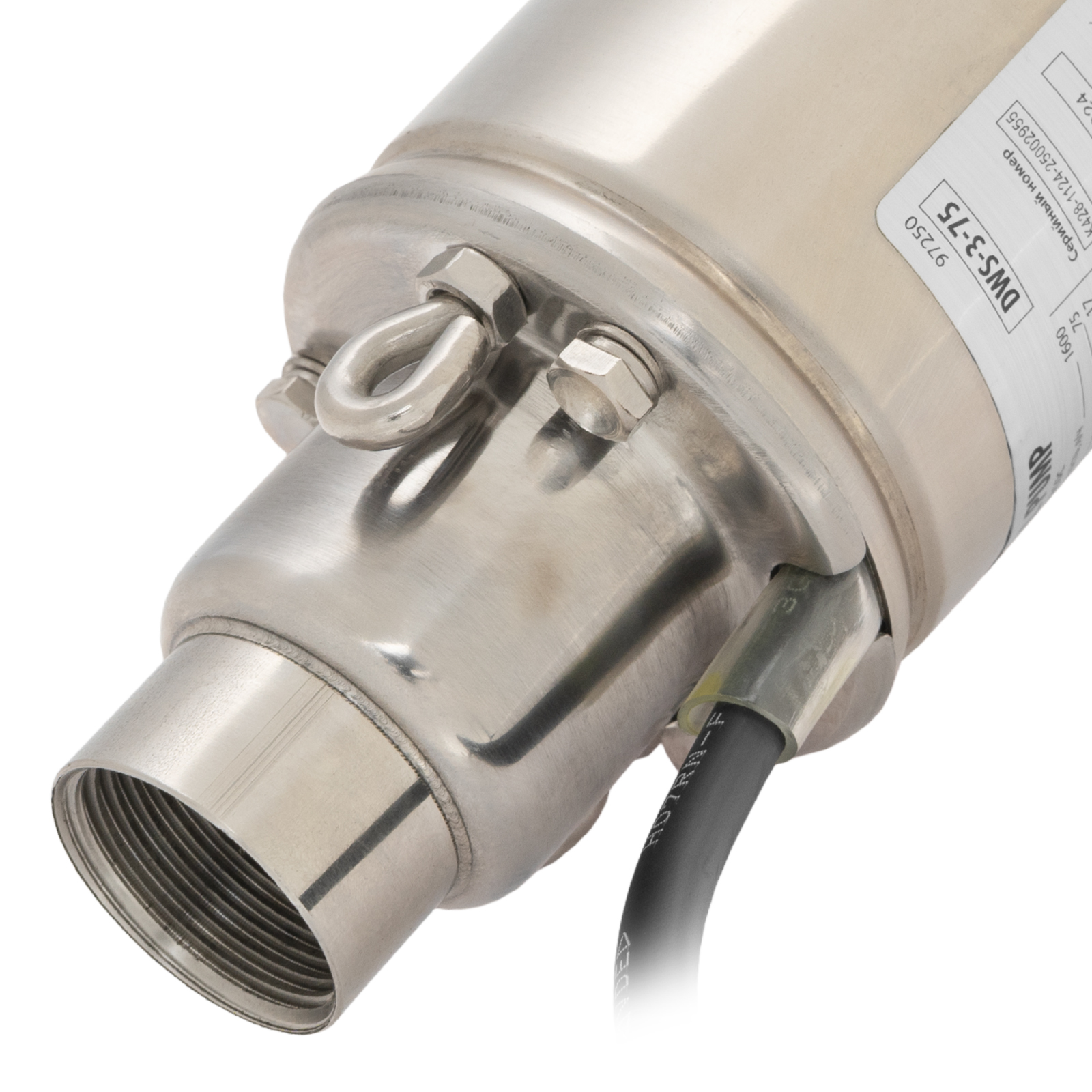 - Простая установка — необходимо закрепить трос в проушинах, опустить насос в вертикальном положении в воду и зафиксировать трос над колодцем или скважиной.