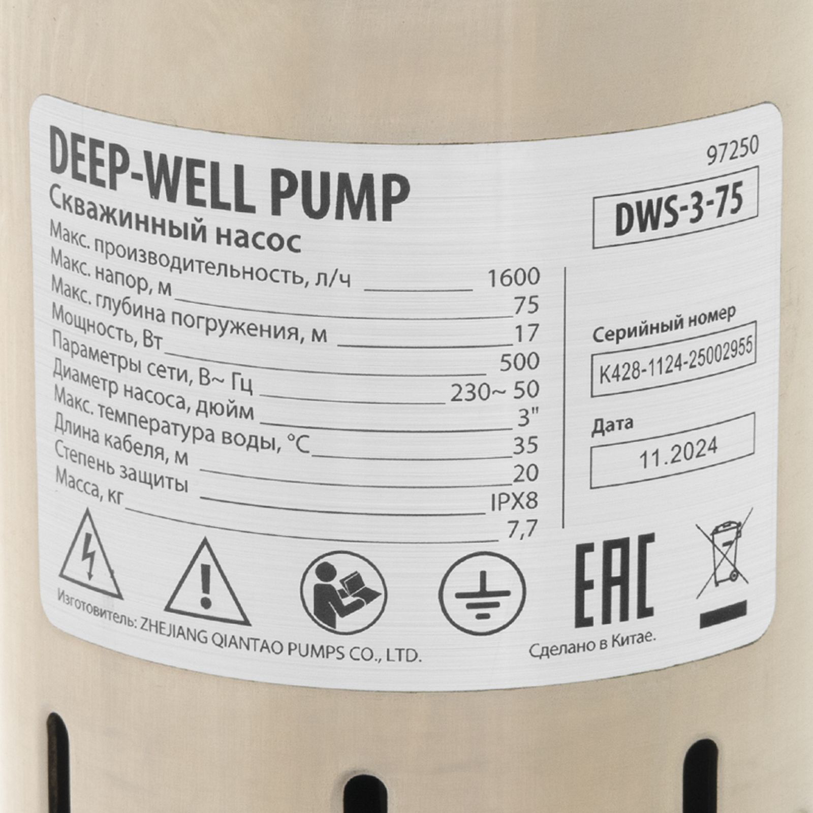 Винтовой скважинный насос Denzel DWS-3-75 97250 диаметром 3 дюйма потребляет мощность 500 Вт, перекачивает воду со скоростью 1600 л/ч и обеспечивает напор до 75 м. Предназначен для подъема чистой воды с глубины до 80 м из скважин и колодцев. Используется для организации систем водоснабжения и полива на даче, садовом участке или в загородном доме.