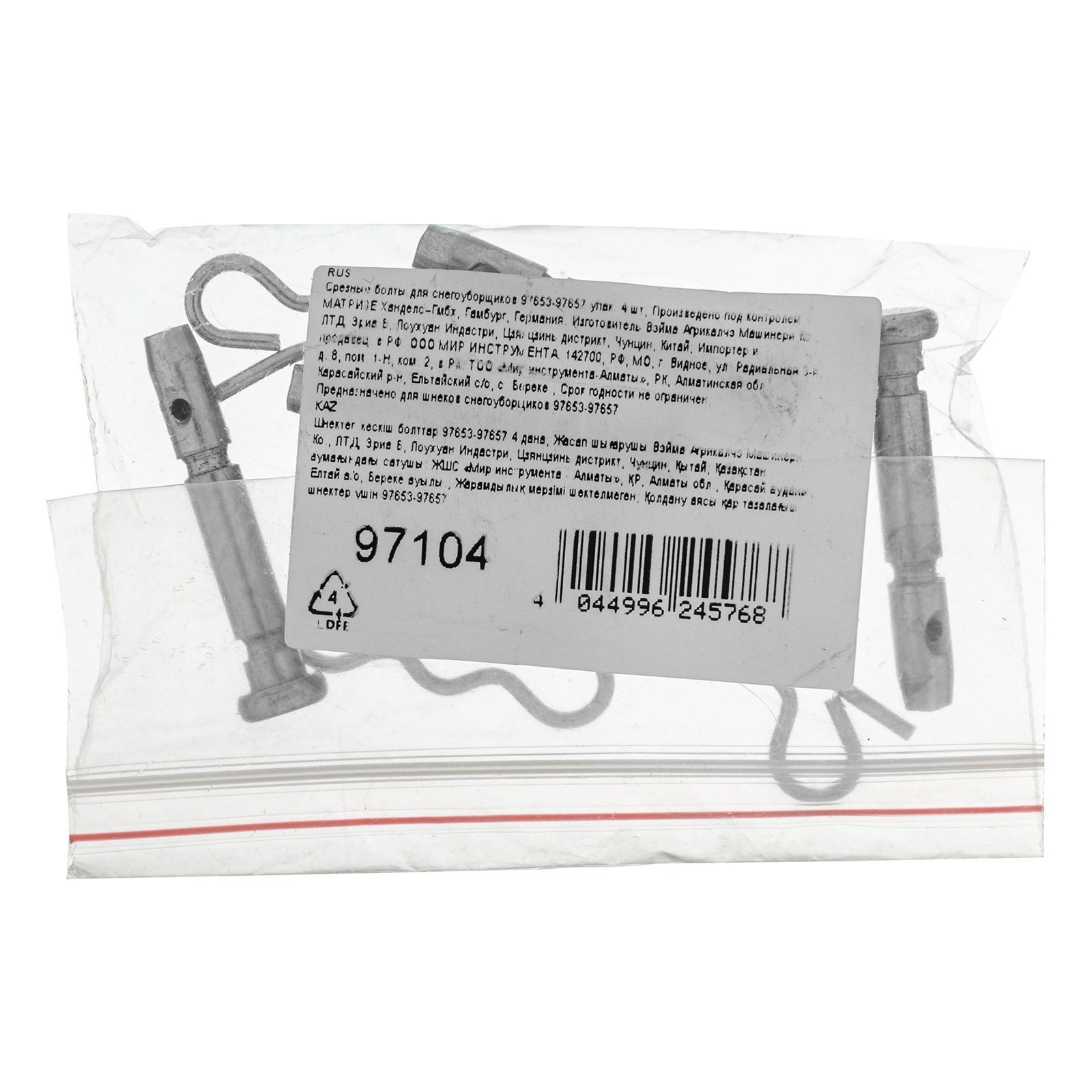 Срезные болты 97104 предназначены для снегоуборочных машин SBM 610 97653, SBM 610S PRO 97654, SBL 711D PRO 97655, SBL 711DT PRO 97656, BM 610DT PRO 97657. Играют ключевую роль в соединении уборочного шнека с приводным валом, что существенно увеличивает срок используемой техники.,Внимание — использование обыкновенных болтов вместо срезных грозит поломкой шнека снегоуборщика!